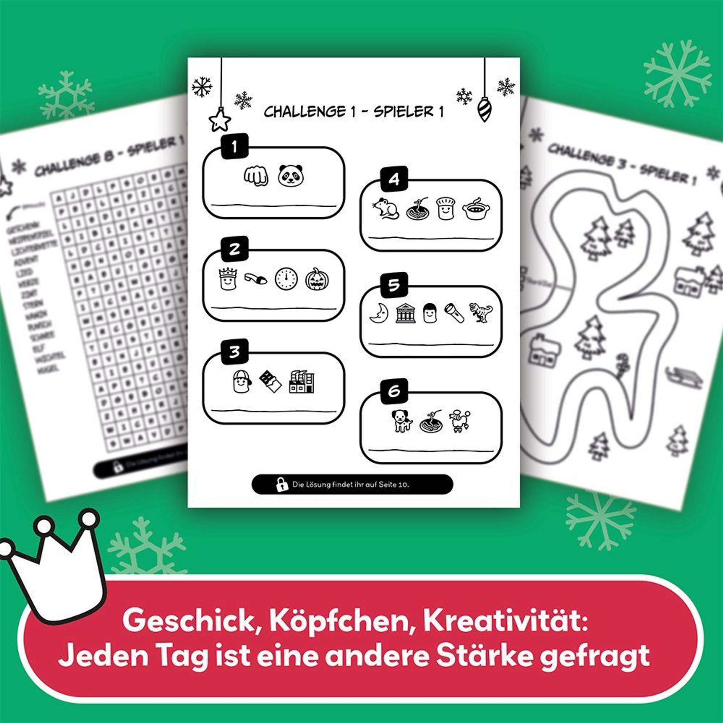 Highlights: Verbringt gemeinsam Zeit und freut euch täglich auf ein spannendes Duell Geschick, Köpfchen, Kreativität: Jeden Tag ist eine andere Stärke gefragt Das Geschenk für die Adventszeit - überrascht euren Partner Bonus: Zwei Extra-Challenges für die Weihnachtsfeiertage