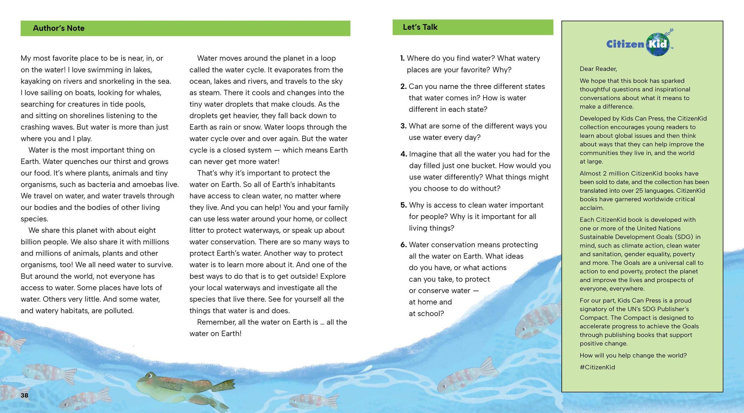 Part of the CitizenKid collection for younger readers, this book is an engaging primer on water, using accessible text and loads of illustrations. It includes easy-to-understand explanations of where water is found - freshwater and saltwater bodies of all types, rain and dew, ice and snow and even steam - how the water cycle works, who needs water and what it's used for, as well as today's global water concerns. With art by bestselling illustrator Madelyn Goodnight that colorfully captures the wonders of nature from a child's perspective, it's a perfect read-aloud to spark deeper discussions and inspire budding water conservationists. The content is supported by back matter that includes discussion questions as well as an author's note and a list of resources for further learning.