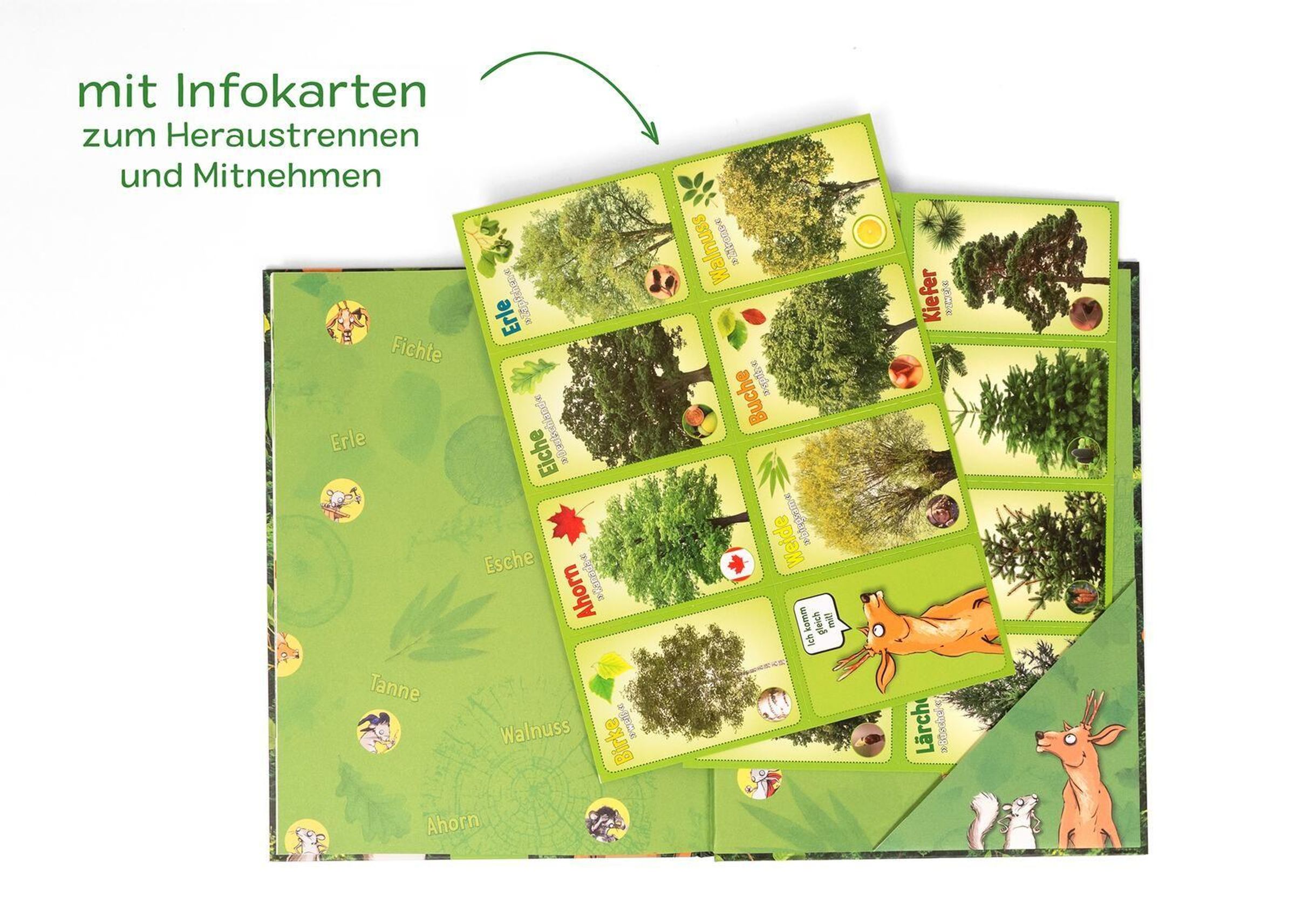 - Mit Quiz und Infokarten zum Mitnehmen: Es gibt zwei Quiz, in denen man überprüfen kann, ob man sich die Besonderheiten der Bäume und Tiere gemerkt hat - bevor es dann mit den herausnehmbaren Baum- und Tierkarten in den Wald, den Garten oder den Park geht