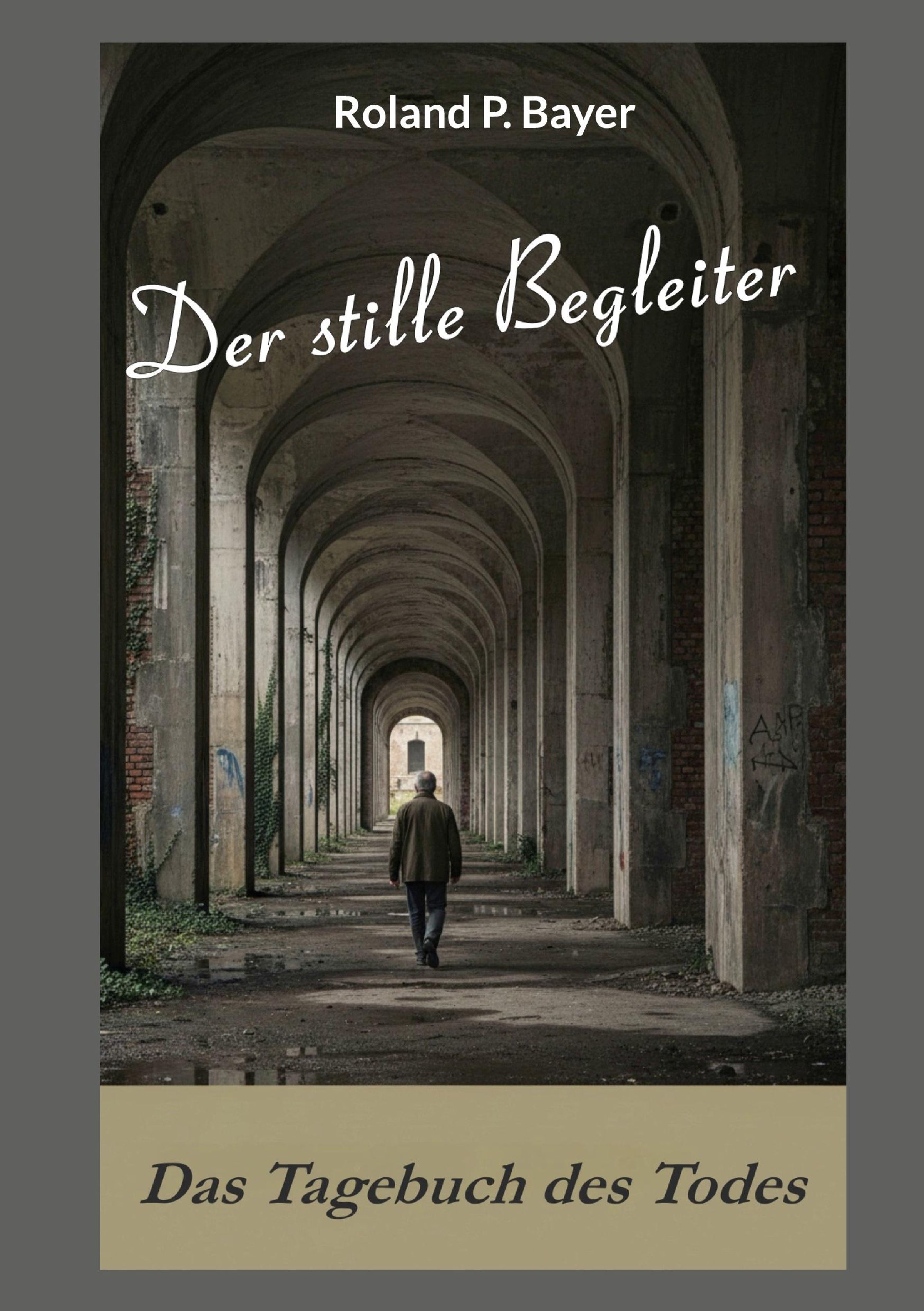 "Roland P. Bayer" oben, "Der stille Begleiter" mittig. Unterhalb: "Das Tagebuch des Todes". Mann geht durch Tunnel., Buch