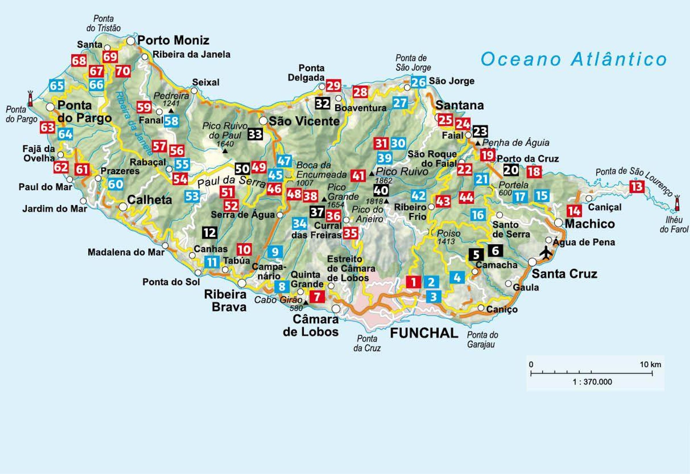 Schmale Bewässerungskanäle, Levadas genannt, durchziehen die gesamte Insel. Auf ihren Wartungswegen lässt sich Madeira ohne große Höhenunterschiede entdecken: vorbei an kunstvoll angelegten Terrassen, durch eindrucksvolle Schluchten und in ursprüngliche Täler mit immergrüner subtropischer Vegetation. Auch alpine Wanderrouten hält die Vulkaninsel mit ihrem fast 1900 Meter hohen Zentralmassiv bereit. Spektakulär ist die in den Fels geschlagene Strecke vom Pico do Arieiro hinauf zum Pico Ruivo - die Königstour der Insel. Gemütlich sind die verschwiegenen Hirtenpfade und die 'veredas', alte Dorfverbindungswege, die bis vor wenigen Jahrzehnten den einzigen Zugang zu abgeschiedenen Ortschaften darstellten.