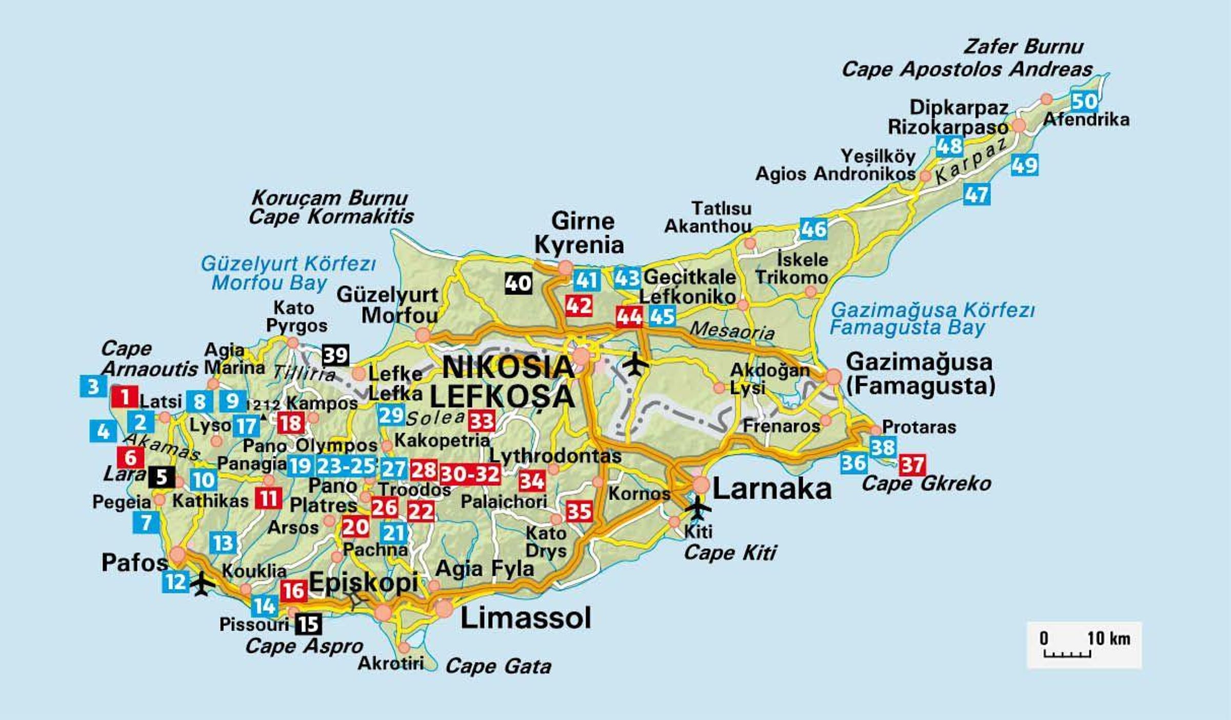Natur- und Kultururlaub lassen sich auf Zypern ideal verbinden: Auf Schritt und Tritt trifft man auf Zeugnisse einer 9000 Jahre alten Geschichte, wie die Königsgräber von Pafos oder die antike Stadt Salamis . Im Süden locken das Troodos-Gebirge mit schattigen Schwarzkieferwäldern, im Norden das Fünffingergebirge mit mittelalterlichen Burgen. Die fast 100 Kilometer lange Halbinsel Karpaz zeigt die ursprüngliche Seite Zyperns mit unberührten Stränden und seltener Tierwelt.