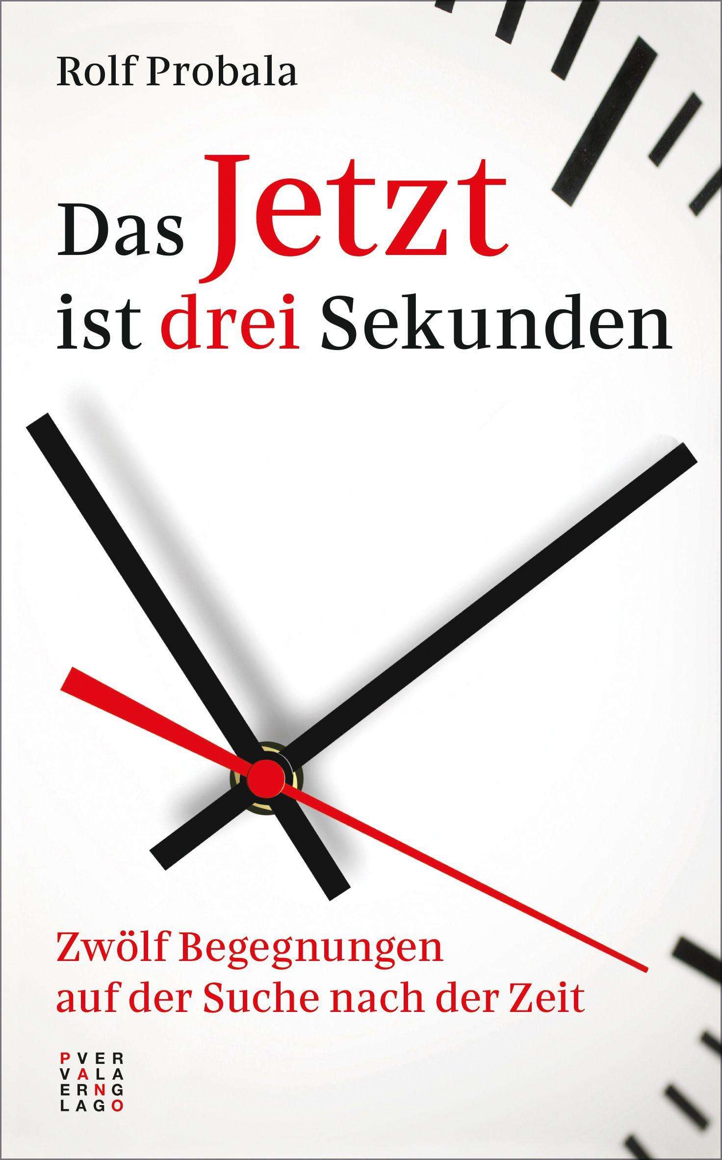 Titel: "Das Jetzt ist drei Sekunden" von Rolf Probala. Untertitel: "Zwölf Begegnungen auf der Suche nach der Zeit". Uhrzeiger-Illustration., Buch