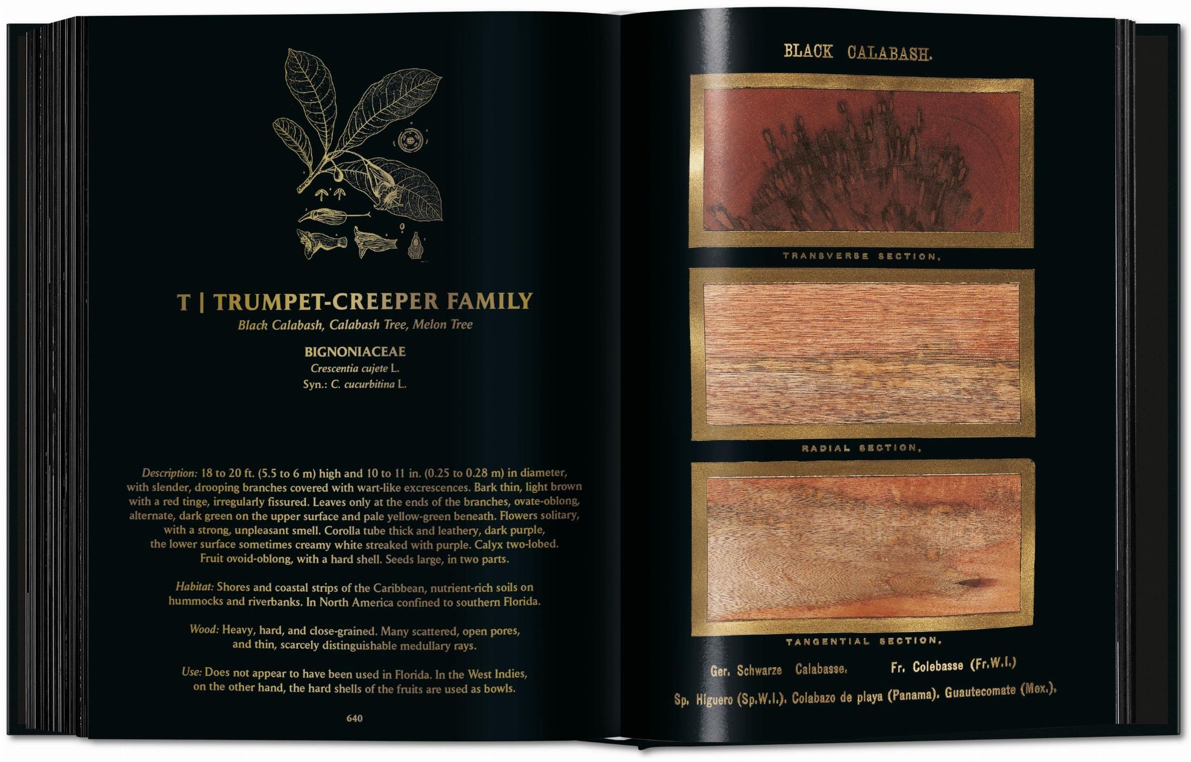 Das sorgfältig im Faksimile reproduzierte Woodbook zeigt die Muster aller in den Originalbänden aufgeführten Arten; zu diesem Zweck erhielt TASCHEN einen der äußerst seltenen Originalbände in sehr gutem Zustand mit nur minimalen Beschädigungen der Holzschnitte. Jeder der Bäume, die alphabetisch angeordnet sind, ist mit drei Querschnitten vertreten (radial, horizontal und tangential), welche die Besonderheiten der Maserung sowie die Fülle der Farben und Texturen unter den vielen unterschiedlichen Holzarten deutlich machen.