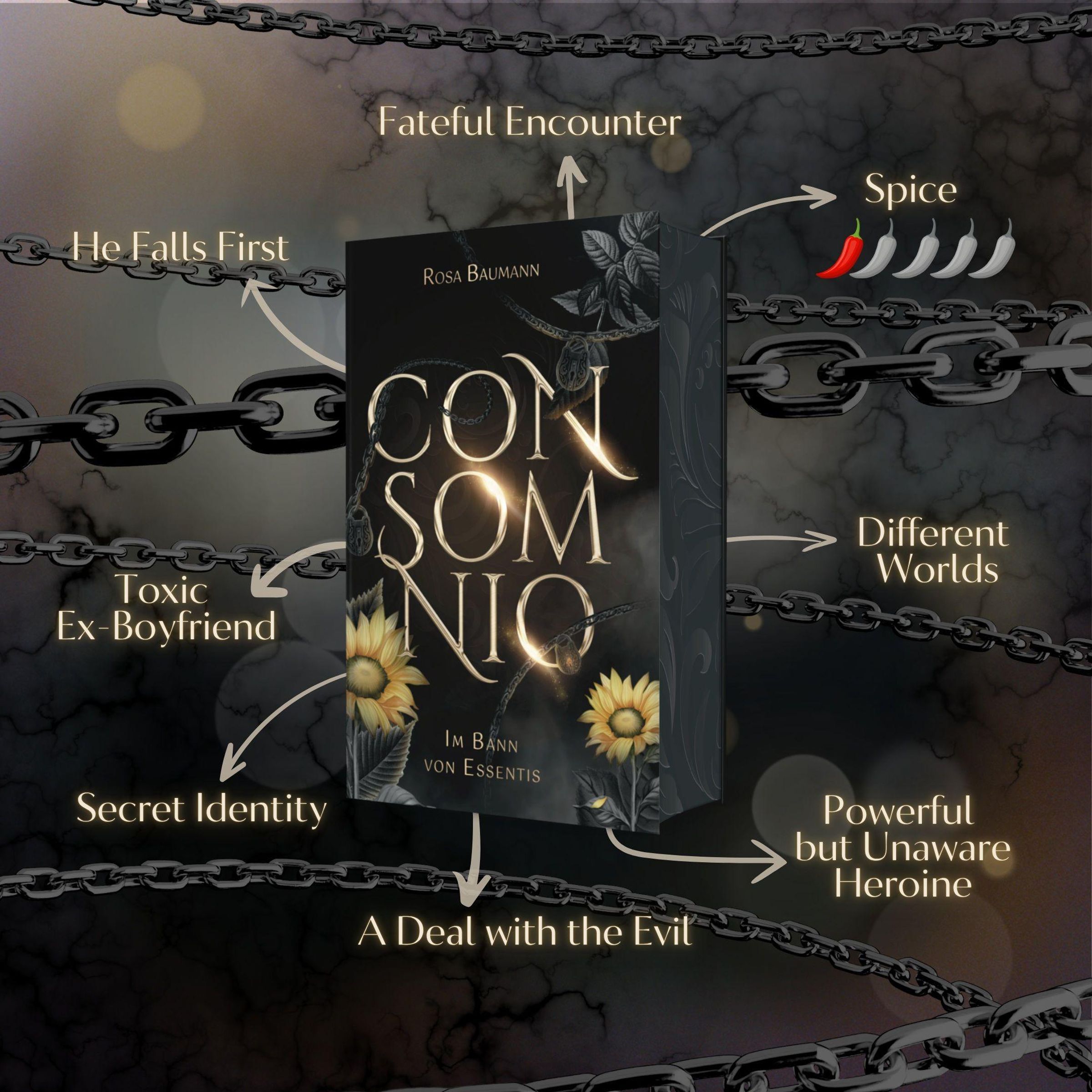 "Rosa Baumann. Con Somnio. Im Bann von Essentis." Sonnenblumen, Ketten und Schlösser auf dunklem Hintergrund., Buch