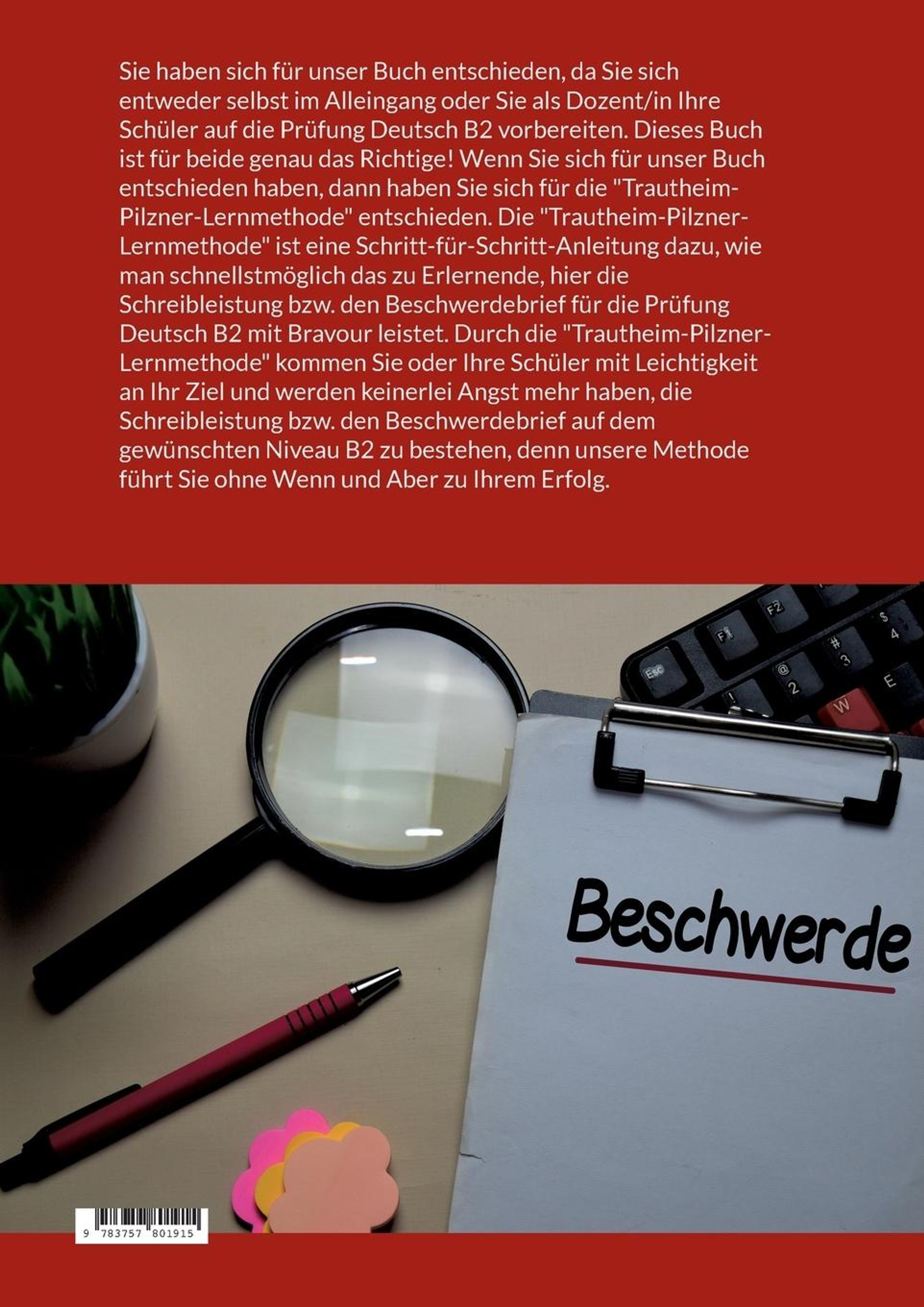 Sie haben sich für unser Buch entschieden, da Sie sich entweder selbst im Alleingang oder Sie als Dozent / in Ihre Schüler auf die Prüfung Deutsch B2 vorbereiten. Dieses Buch ist für beide genau das Richtige! Wenn Sie sich für unser Buch entschieden haben, dann haben Sie sich für die "Trautheim-Pilzner-Lernmethode" entschieden. Die "Trautheim-Pilzner-Lernmethode" ist eine Schritt-für-Schritt-Anleitung dazu, wie man schnellstmöglich das zu Erlernende, hier die Schreibleistung bzw. den Beschwerdebrief für die Prüfung Deutsch B2 mit Bravour leistet. Durch die "Trautheim-Pilzner-Lernmethode" kommen Sie oder Ihre Schüler mit Leichtigkeit an Ihr Ziel und werden keinerlei Angst mehr haben, die Schreibleistung bzw. den Beschwerdebrief auf dem gewünschten Niveau B2 zu bestehen, denn unsere Methode führt Sie ohne Wenn und Aber zu Ihrem Erfolg.