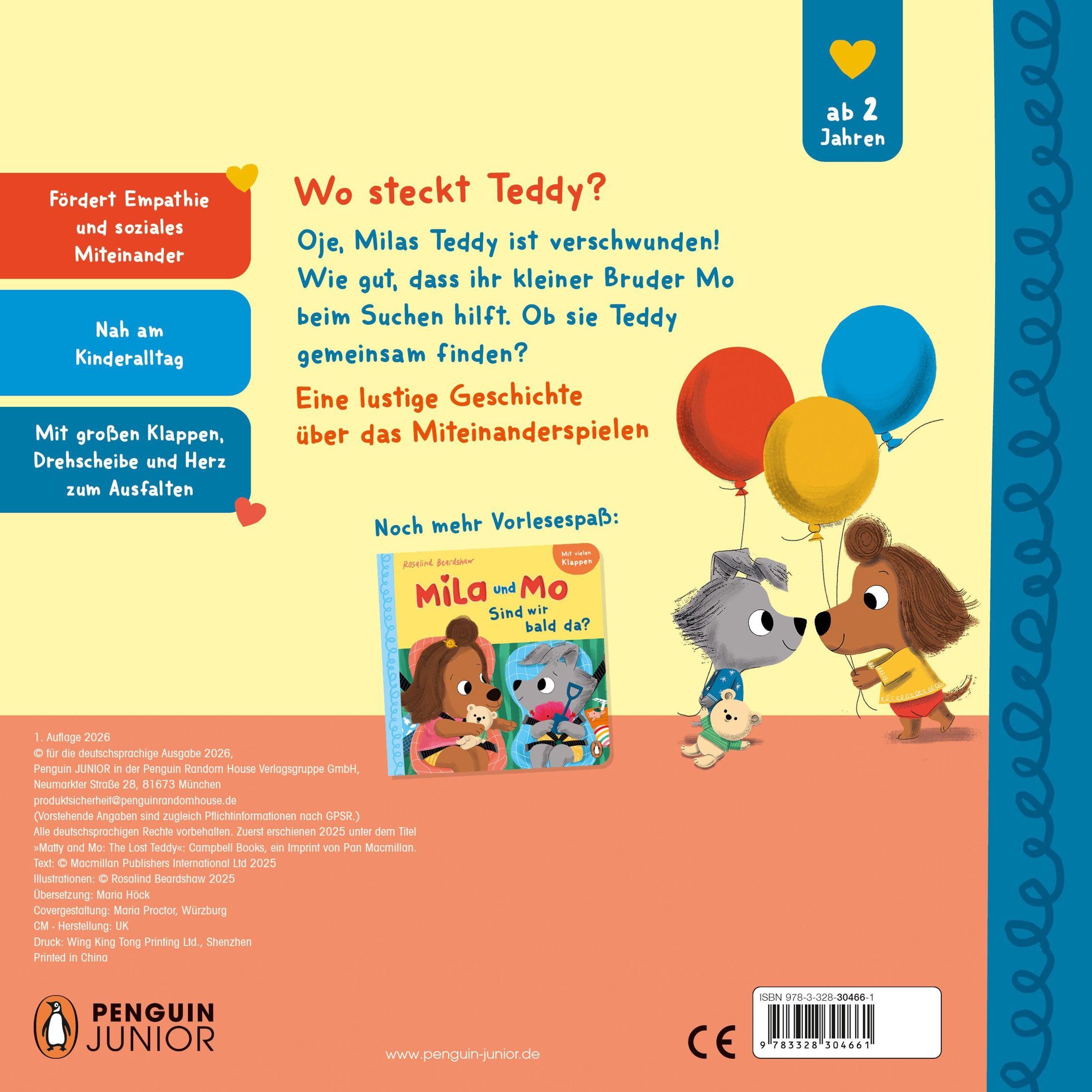 Mila ist traurig. Ihr Teddy ist verschwunden! Gemeinsam mit ihrem kleinen Bruder Mo macht sie sich auf die Suche. Ist Teddy vielleicht unter dem Bett? Oder im Schrank mit der Quietsche-Tür? Hinter den großen Klappen im Buch gibt es viel zu entdecken! Doch das geliebte Kuscheltier bleibt verschwunden. Mo tröstet seine Schwester und versucht, sie aufzumuntern. Und plötzlich taucht Teddy doch wieder auf: Er war die ganze Zeit im Rucksack versteckt!
