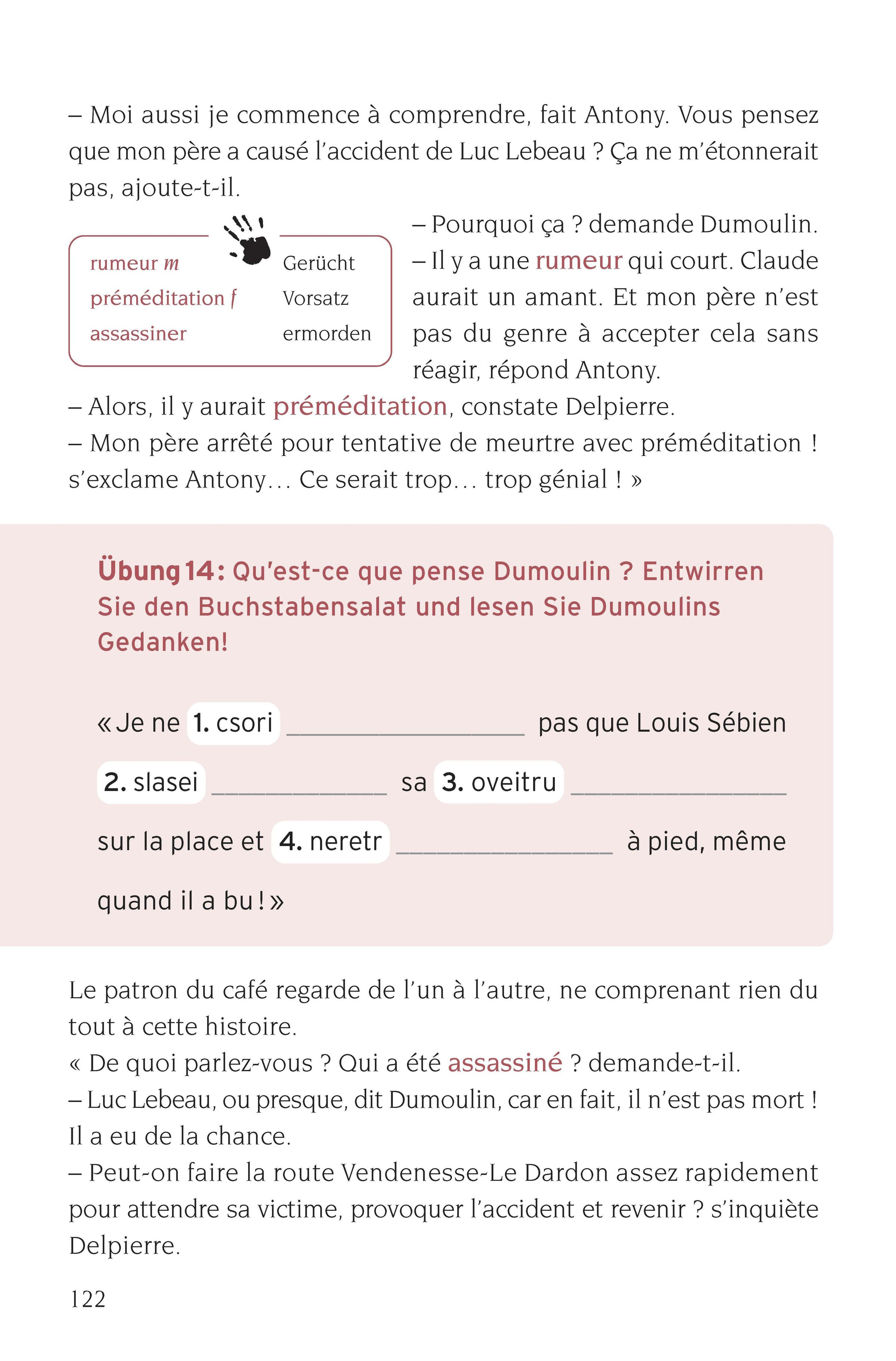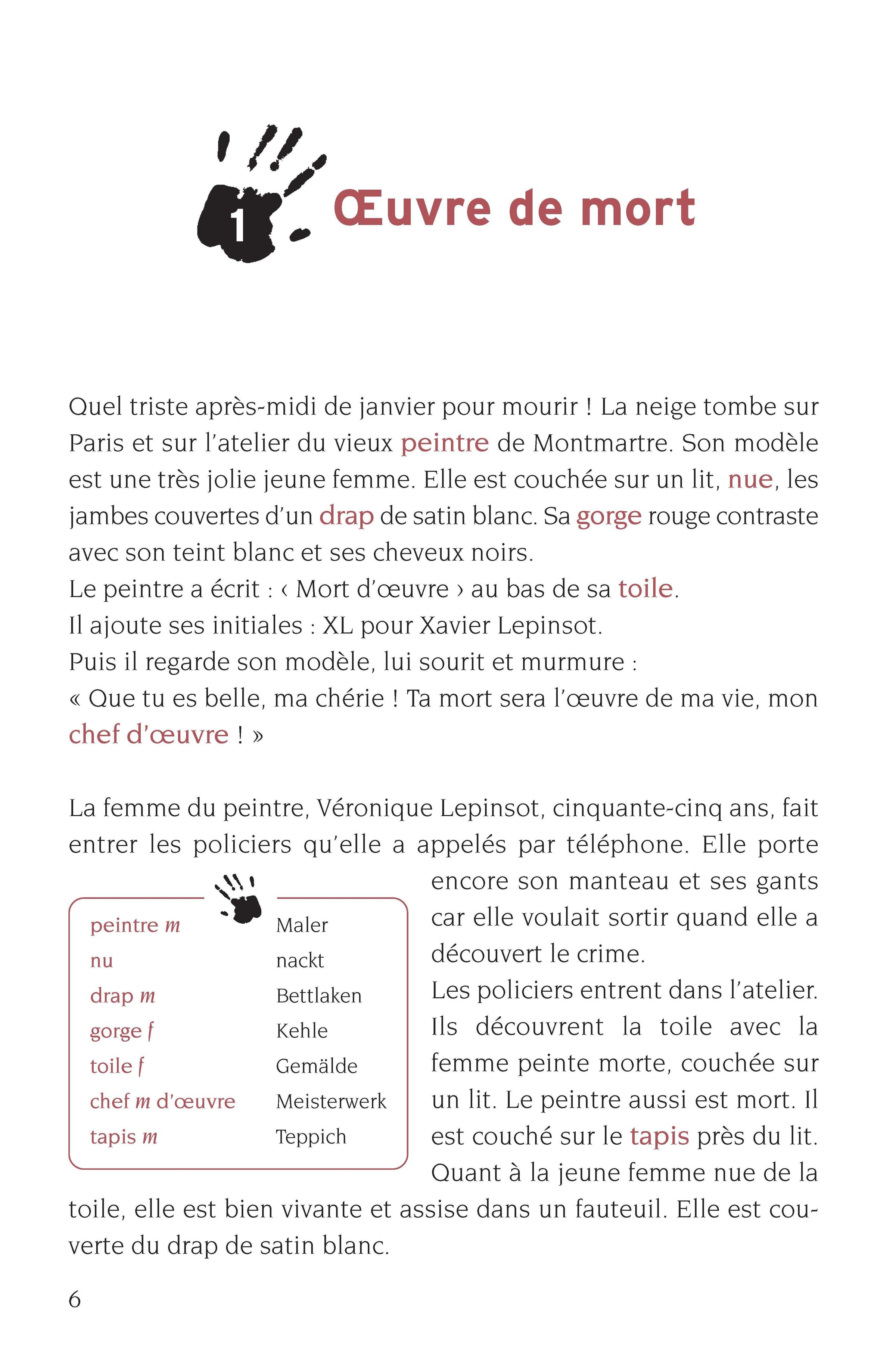 "Mort d’œuvre", "Lernkrimi 3 Kurzkrimis", "circon". Illustration eines Mannes bei einem Gemälde einer liegenden Person., Buch
