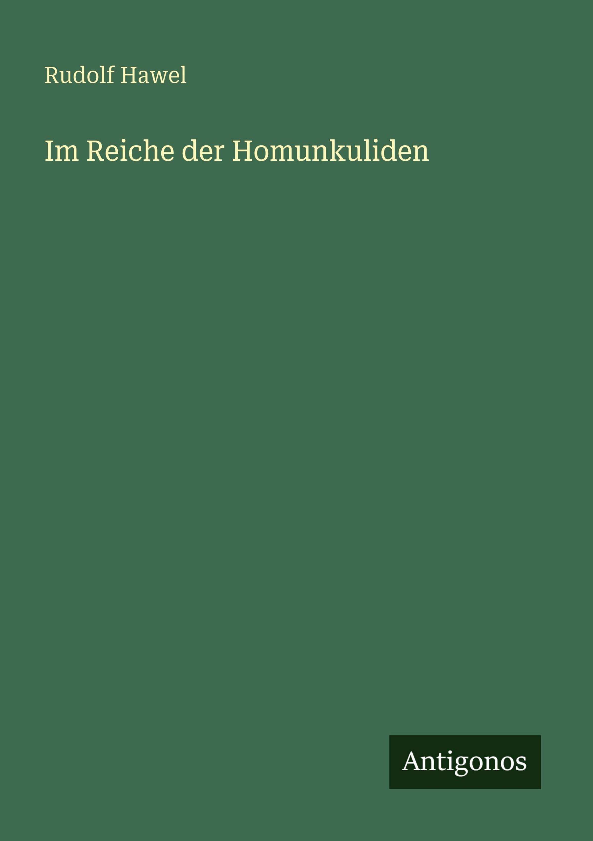 Titel: "Im Reiche der Homunkuliden" von Rudolf Hawel. Unten rechts: "Antigonos". Hintergrund: Dunkelgrün., Buch