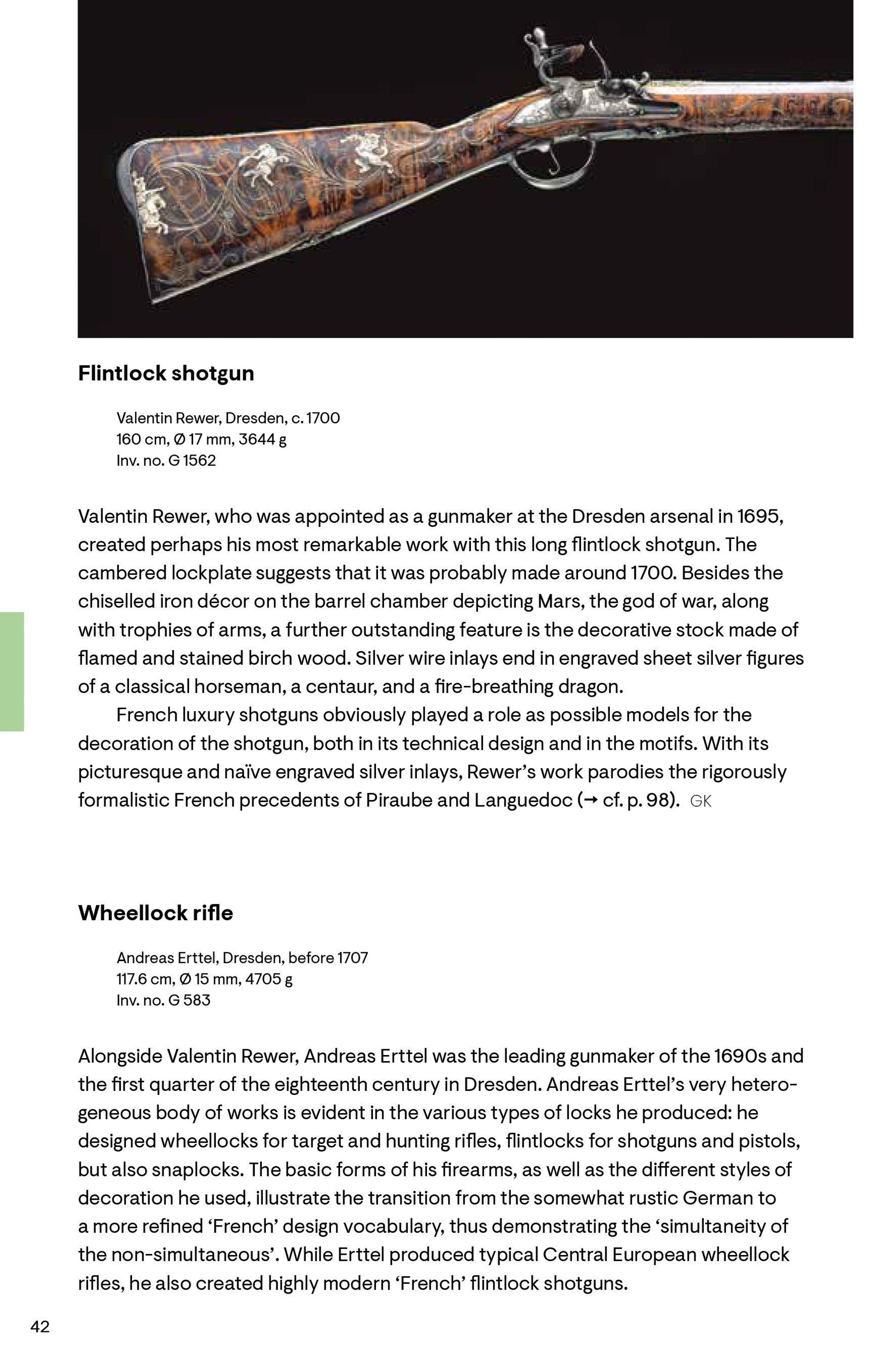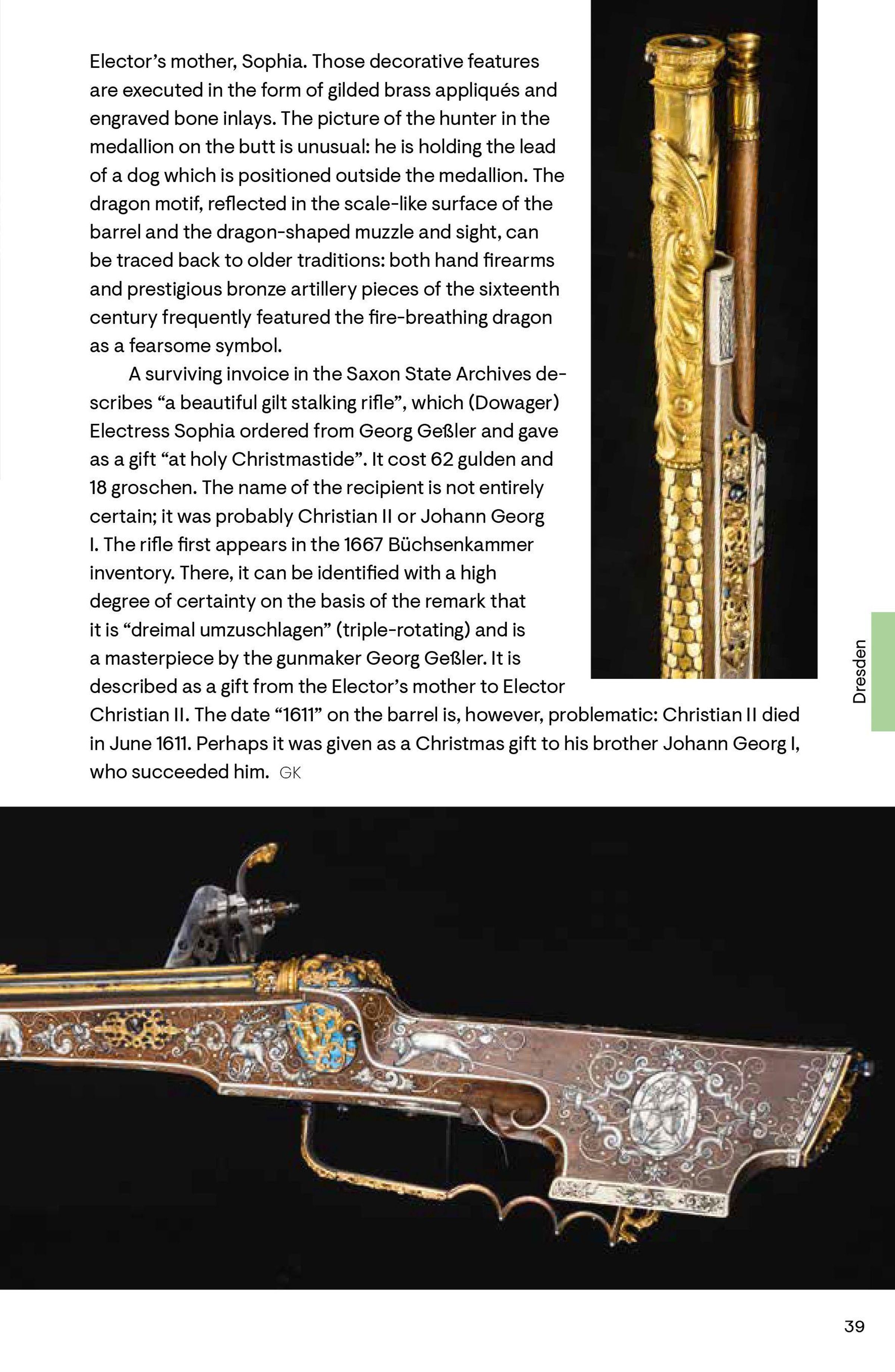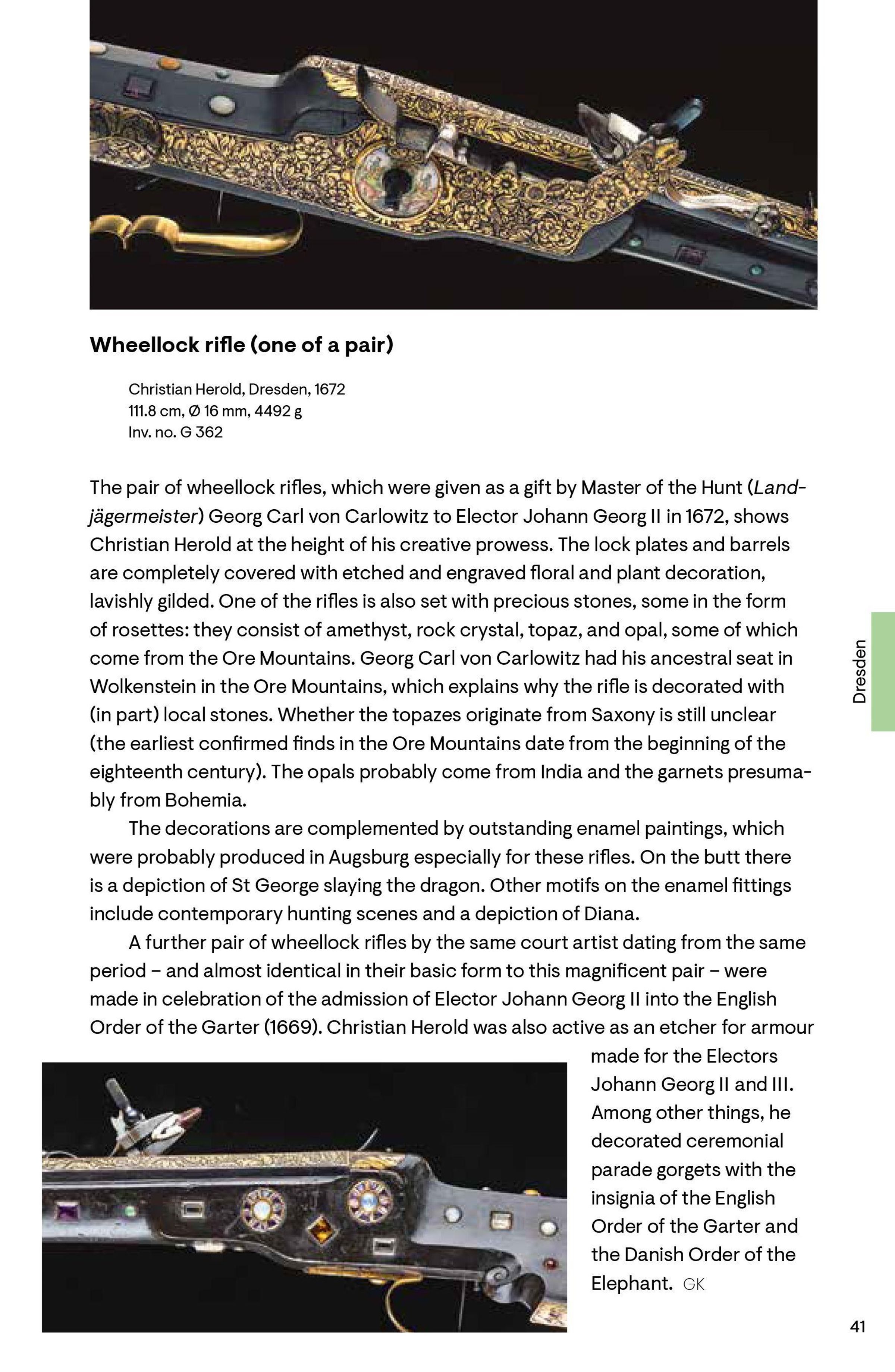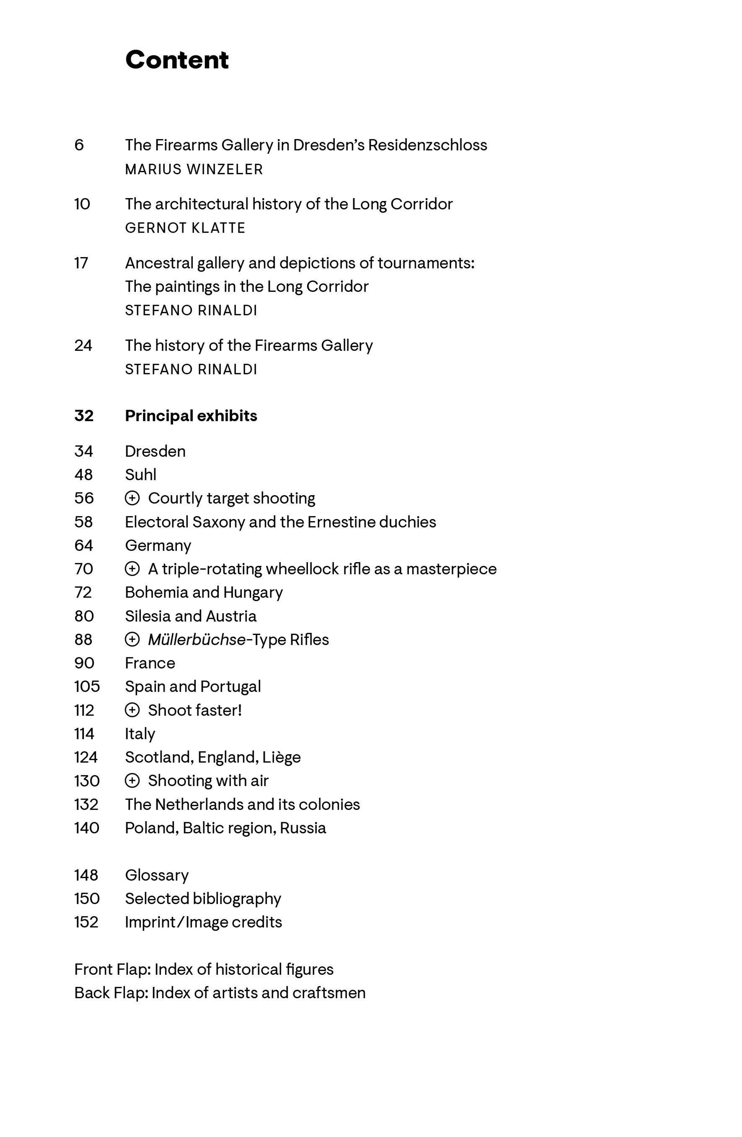 Die Gewehrgalerie im Langen Gang des Dresdner Residenzschlosses präsentiert rund 500 einzigartige Handfeuerwaffen aus dem Besitz der sächsischen Kurfürsten und Könige. Die prunkvollen Gewehre und Pistolen aus dem 16. bis 19. Jahrhundert dienten der Jagd, dem Scheibenschießen sowie der höfischen Repräsentation. Der neue Museumsführer stellt die Sammlungsgeschichte sowie Architektur und Ausstattung des Langen Ganges vor. Der rund 100 Meter lange Renaissancebau verkörperte mit seiner Ahnengalerie die dynastische Memoria des Herrscherhauses und beherbergte seit 1733 das kurfürstliche "Leibgewehr". Eine reichbebilderte Objektauswahl bietet eine Reise durch drei Jahrhunderte europäischer Büchsenmacher- und Dekorationskunst, wobei die Exponate in ihren vielschichtigen kulturhistorischen Zusammenhängen erläutert werden.