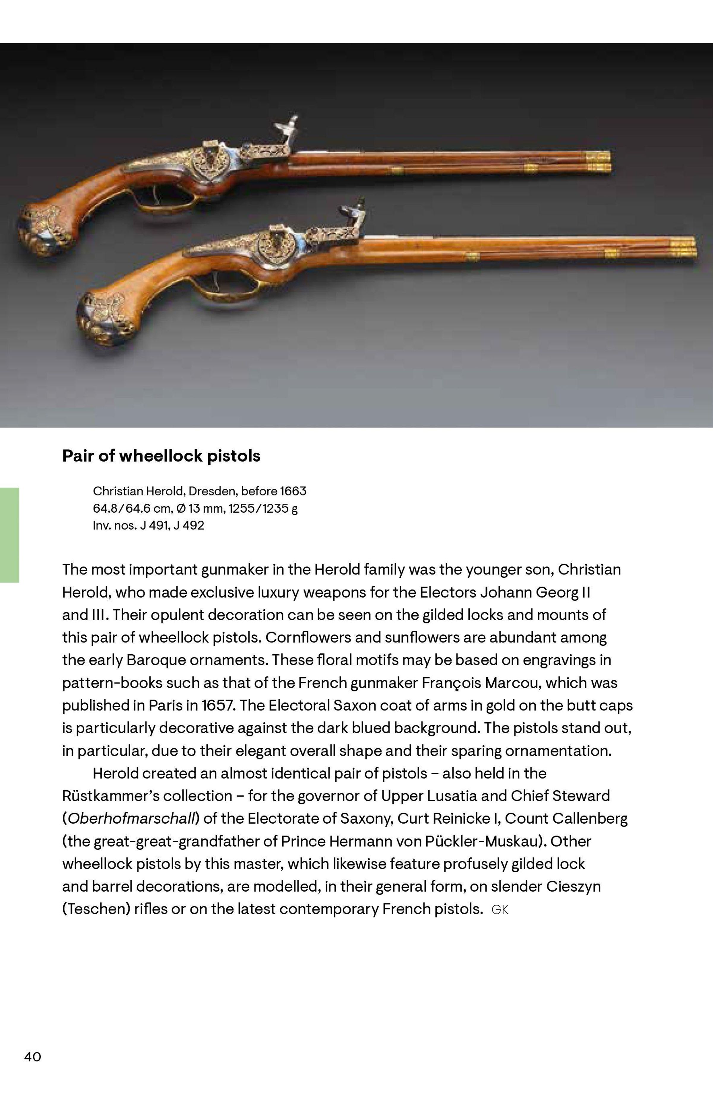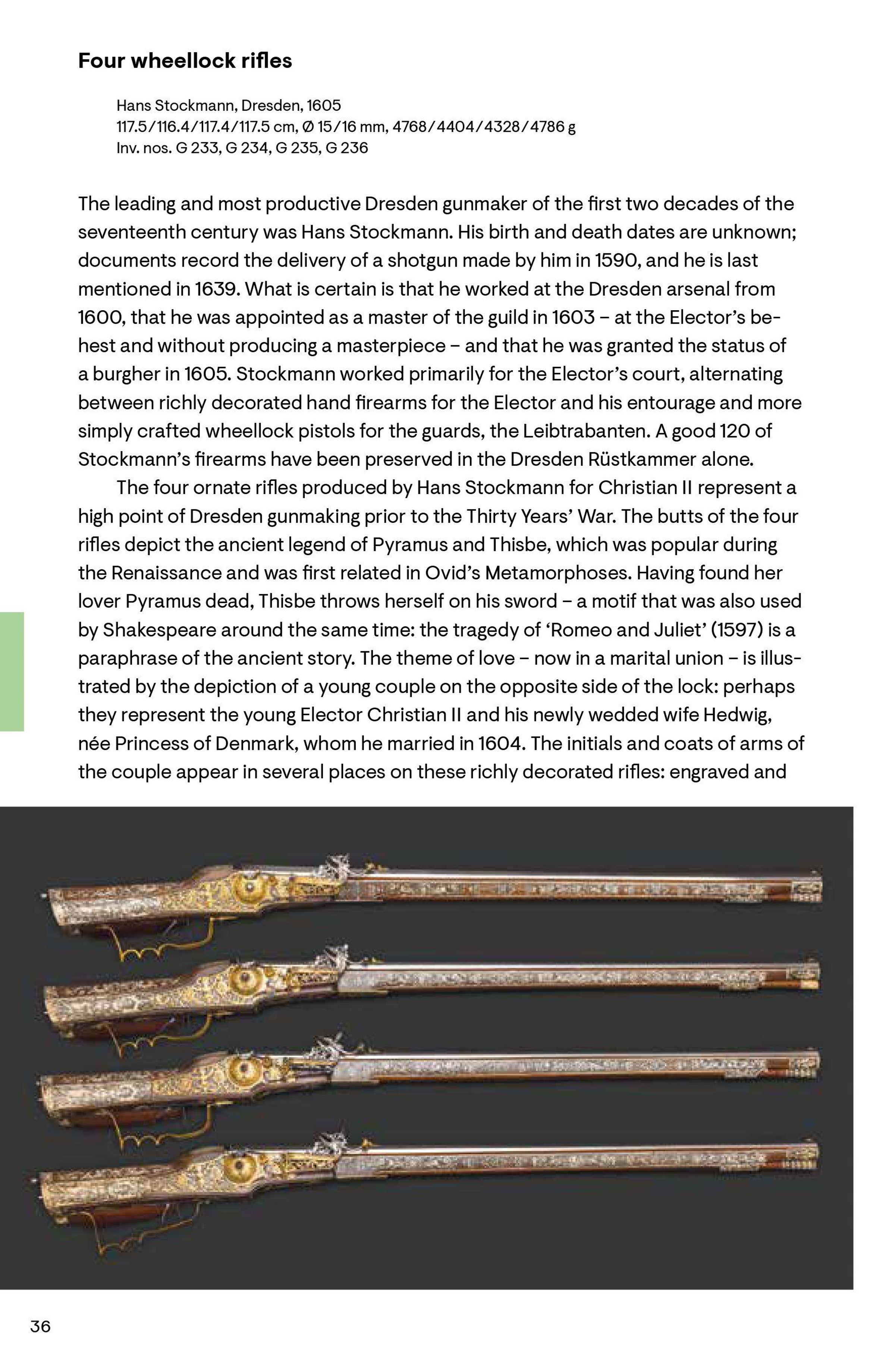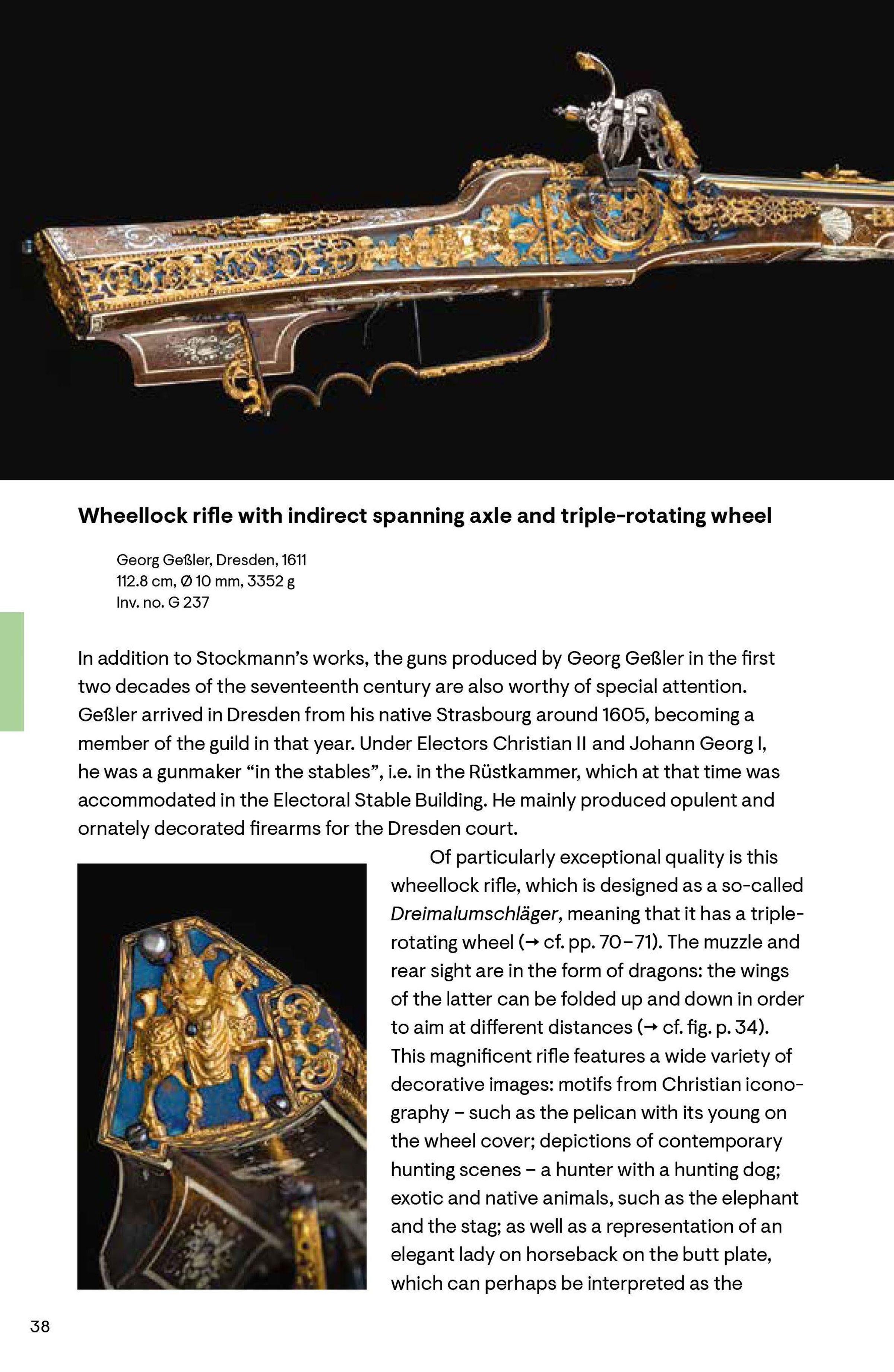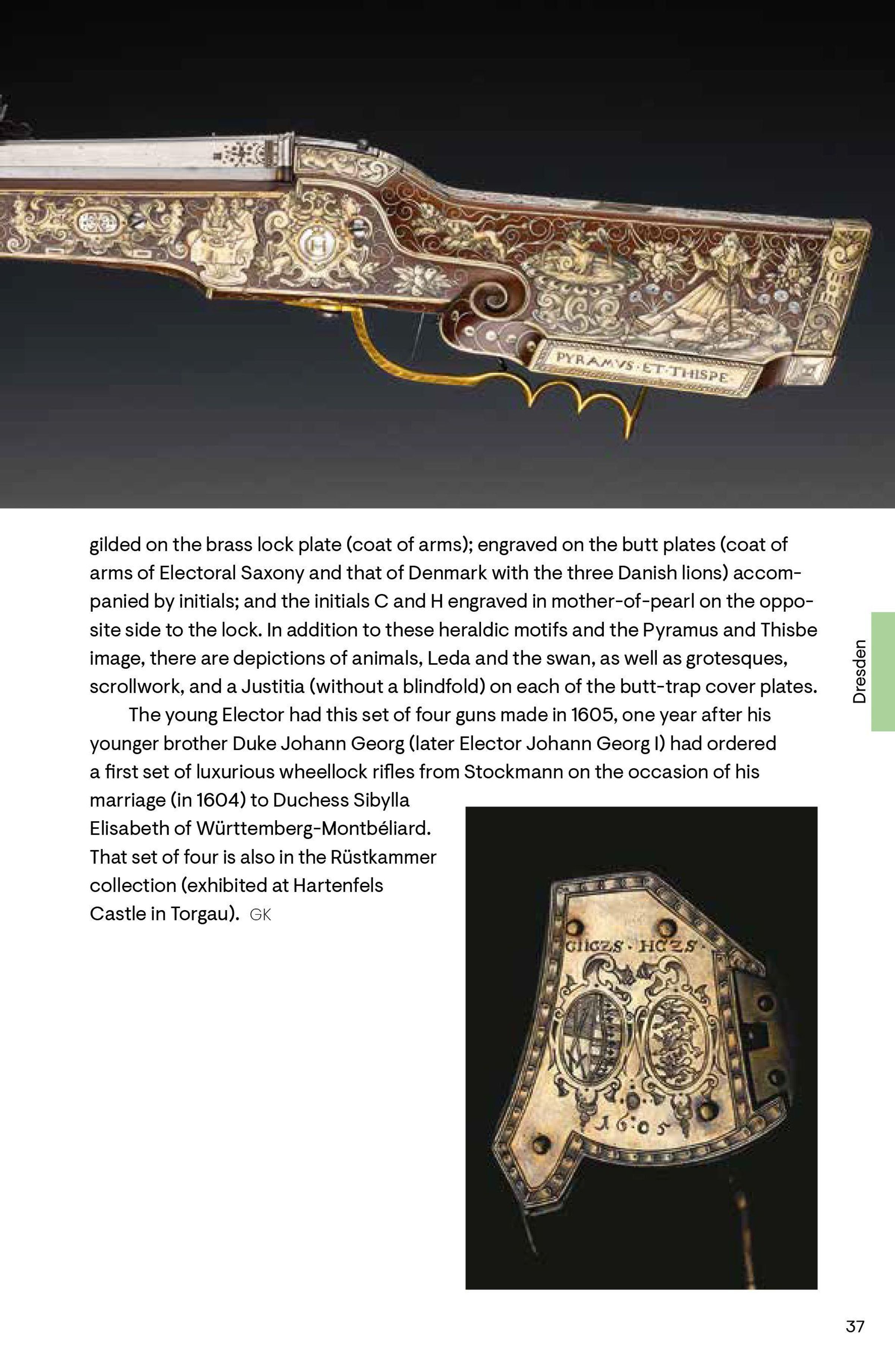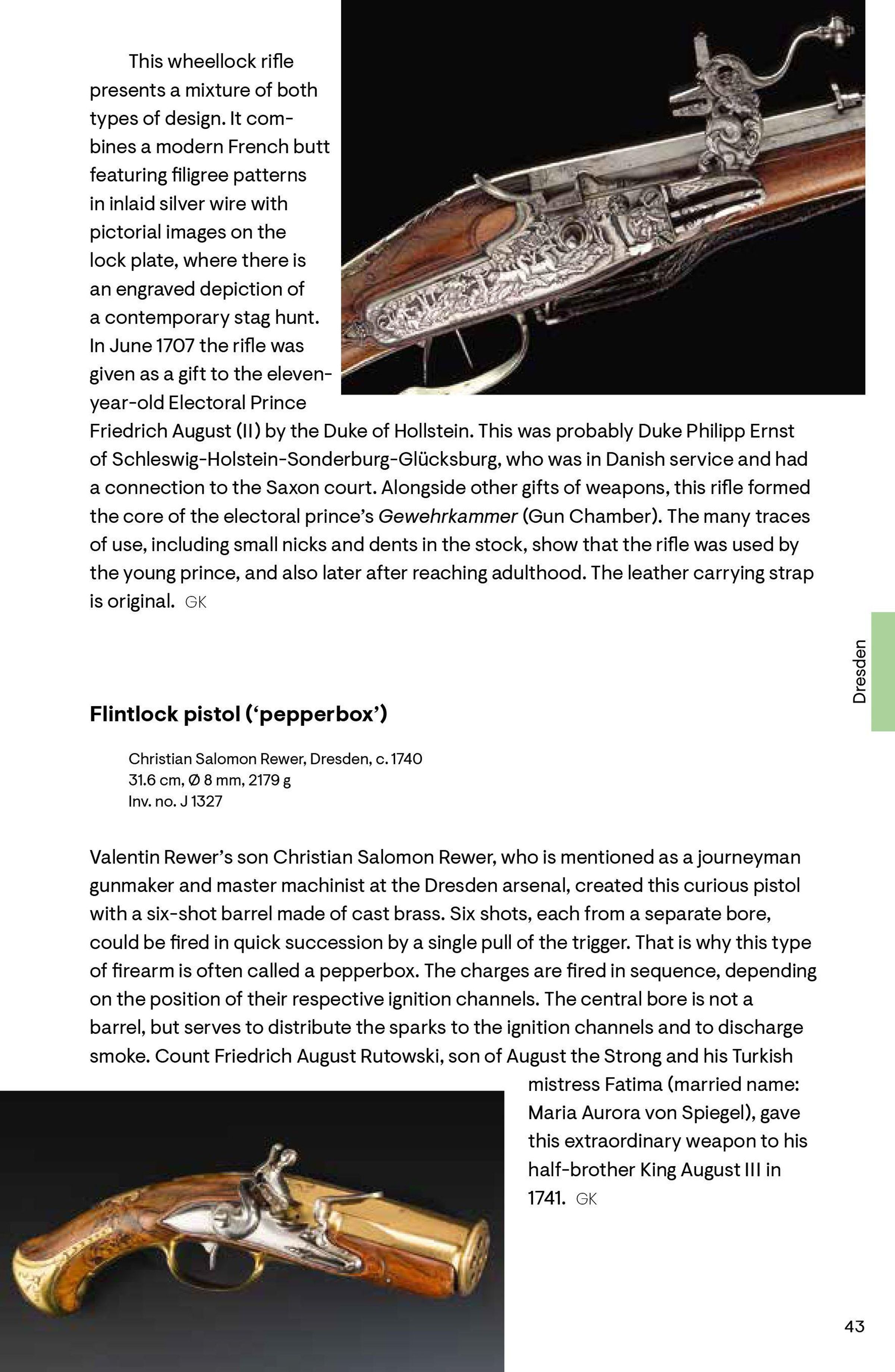 Die Gewehrgalerie im Langen Gang des Dresdner Residenzschlosses präsentiert rund 500 einzigartige Handfeuerwaffen aus dem Besitz der sächsischen Kurfürsten und Könige. Die prunkvollen Gewehre und Pistolen aus dem 16. bis 19. Jahrhundert dienten der Jagd, dem Scheibenschießen sowie der höfischen Repräsentation. Der neue Museumsführer stellt die Sammlungsgeschichte sowie Architektur und Ausstattung des Langen Ganges vor. Der rund 100 Meter lange Renaissancebau verkörperte mit seiner Ahnengalerie die dynastische Memoria des Herrscherhauses und beherbergte seit 1733 das kurfürstliche "Leibgewehr". Eine reichbebilderte Objektauswahl bietet eine Reise durch drei Jahrhunderte europäischer Büchsenmacher- und Dekorationskunst, wobei die Exponate in ihren vielschichtigen kulturhistorischen Zusammenhängen erläutert werden.