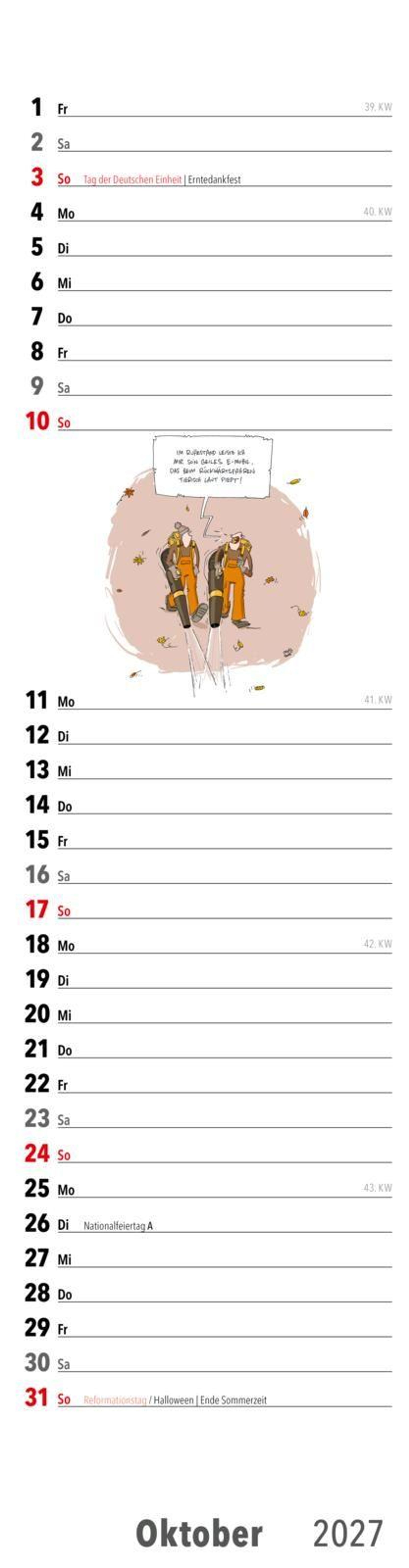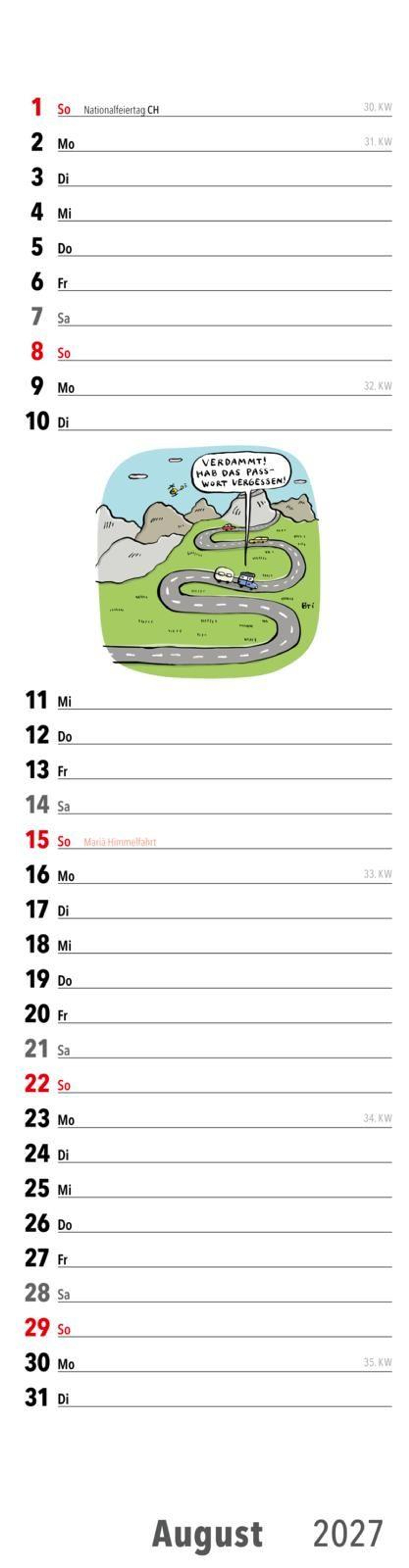 Die Zeit im Ruhestand will übersichtlichtlich und mit Spaß geplant sein . Dabei hilft dieser Streifenplaner für die Wand. Jeden Monat bietet er Platz für Notizen und einen witzigen Cartoon zum Thema.