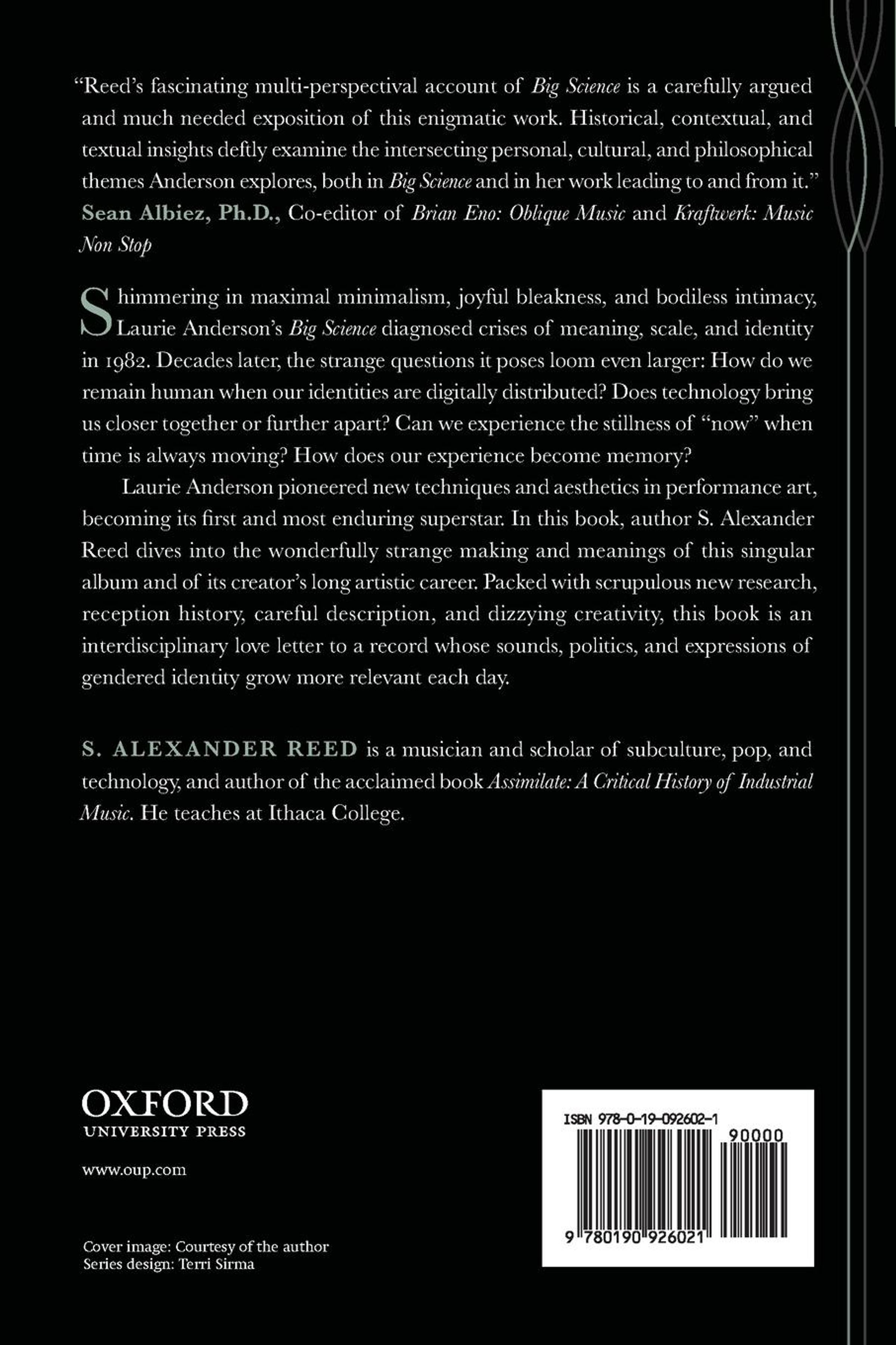 Shimmering in maximal minimalism, joyful bleakness, and bodiless intimacy, Laurie Anderson's Big Science diagnosed crises of meaning, scale, and identity in 1982. Decades later, the strange questions it poses loom even larger: How do we remain human when our identities are digitally distributed? Does technology bring us closer together or further apart? Can we experience the stillness of "now" when time is always moving? How does our experience become memory? Laurie Anderson pioneered new techniques and aesthetics in performance art, becoming its first and most enduring superstar. In this book, author S. Alexander Reed dives into the wonderfully strange making and meanings of this singular album and of its creator's long artistic career. Packed with scrupulous new research, reception history, careful description, and dizzying creativity, this book is an interdisciplinary love letter to a record whose sounds, politics, and expressions of gendered identity grow more relevant each day.
