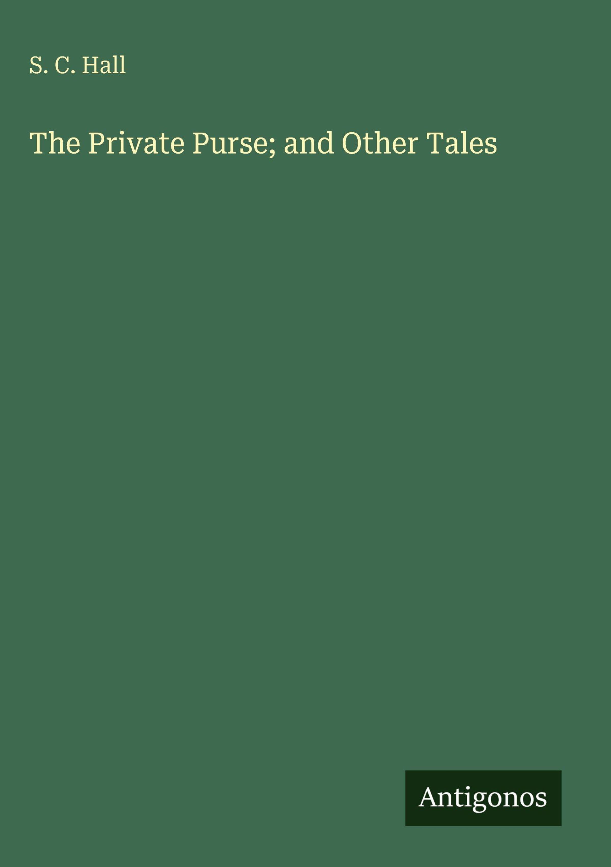 Oben steht "S. C. Hall". Darunter "The Private Purse; and Other Tales". Unten rechts "Antigonos". Hintergrund: dunkelgrün., Buch