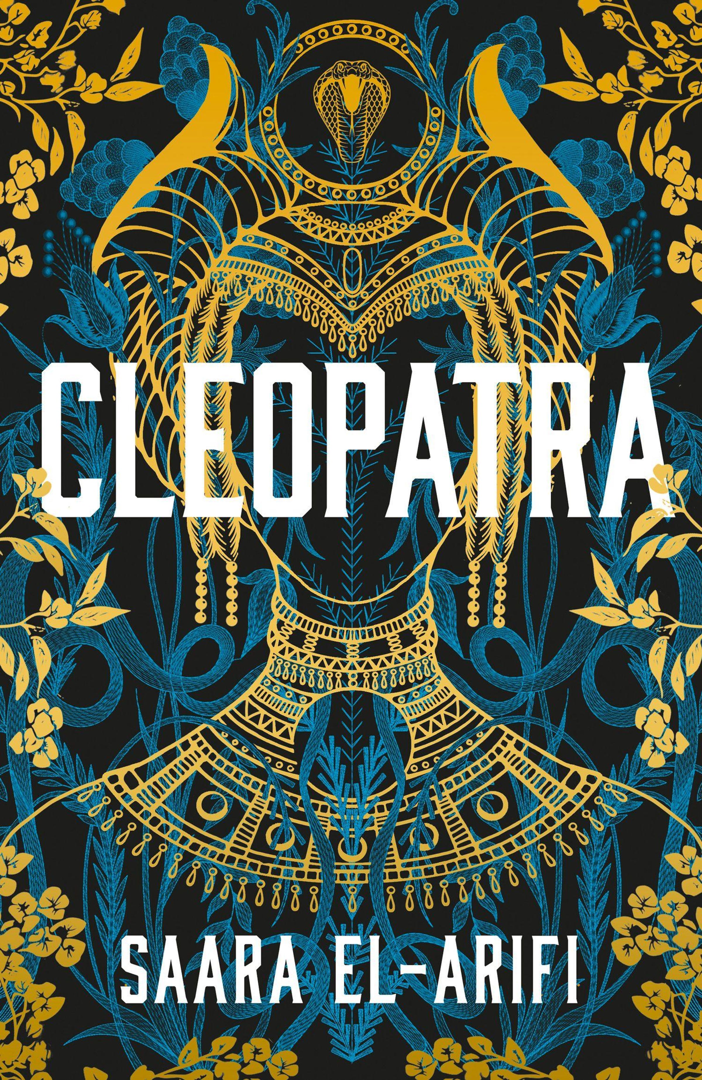 "Cleopatra" und "Saara El-Arifi" in großer Schrift. Kunstvolles florales Design in Blau und Gold mit einer Kobra., Buch