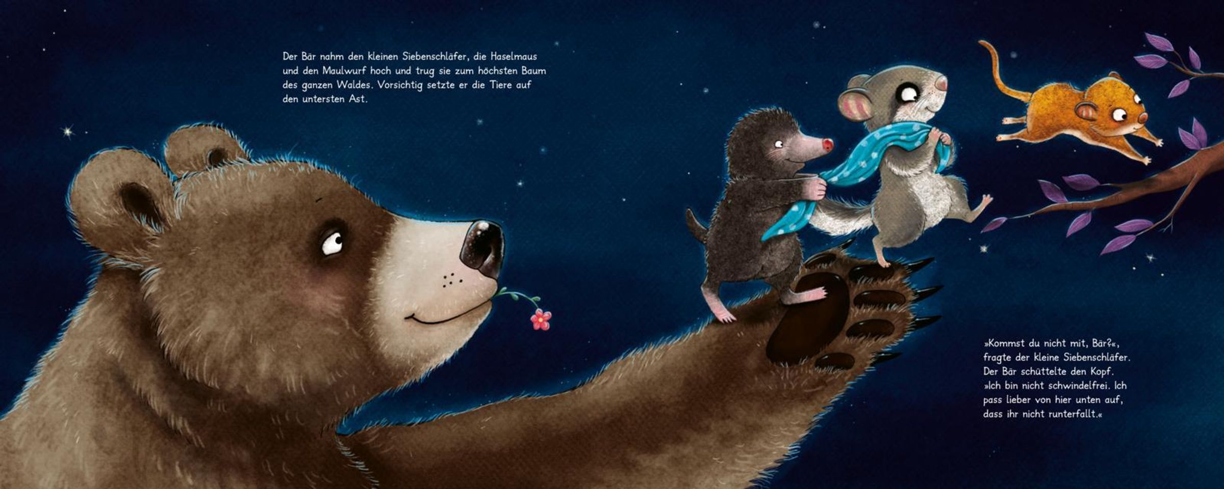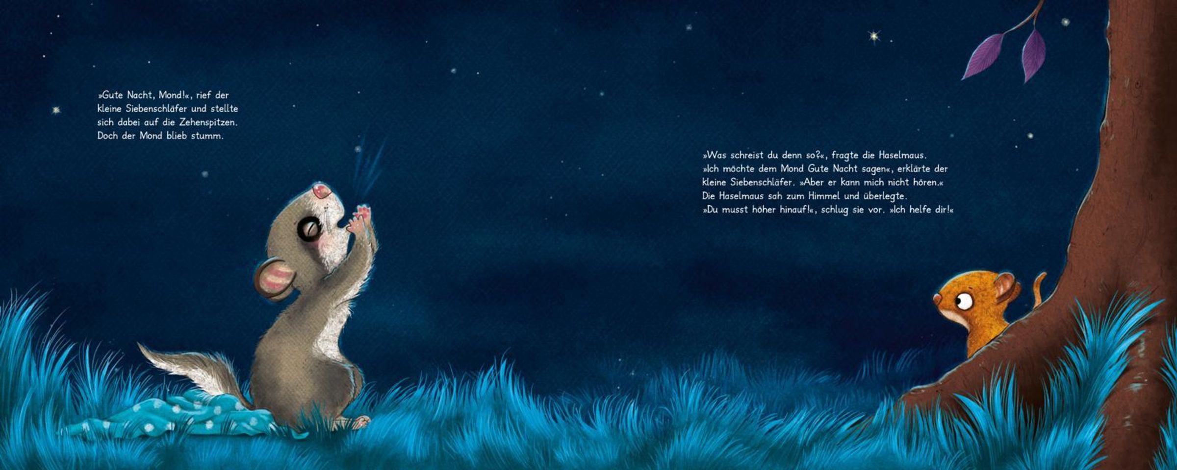 Jeden Abend sagt der kleine Siebenschläfer Gute Nacht zu seiner Mama, seinem Papa und zum großen, hellen Mond, der Nacht für Nacht in seine Höhle scheint. Doch der Mond antwortet ihm nie. Wie denn auch, wenn er so weit weg ist! Ein einziges Mal will der kleine Siebenschläfer so nah an den Mond kommen, dass er ihm Gute Nacht sagen kann. Zum Glück hat er seine Freunde, die ihm bei diesem abenteuerlichen Unternehmen zur Seite stehen. Ob sie es gemeinsam schaffen, dem Mond Gute Nacht zu sagen?