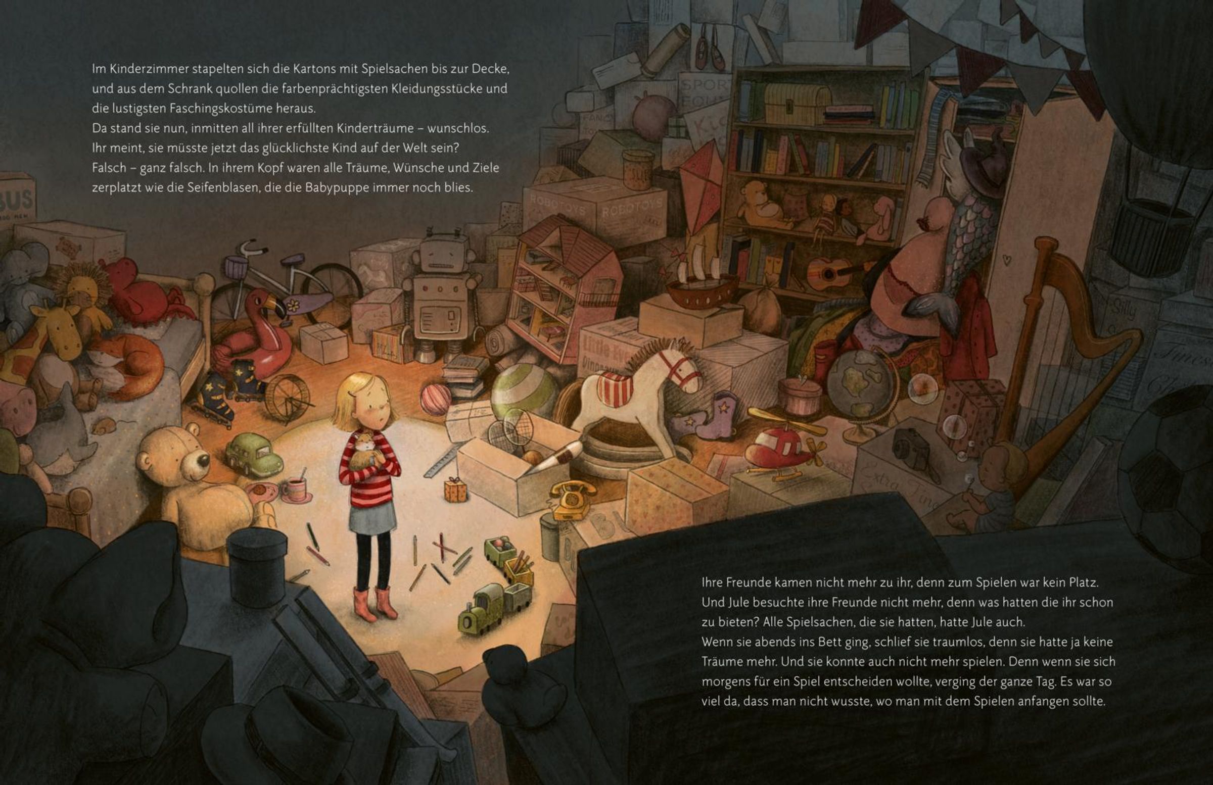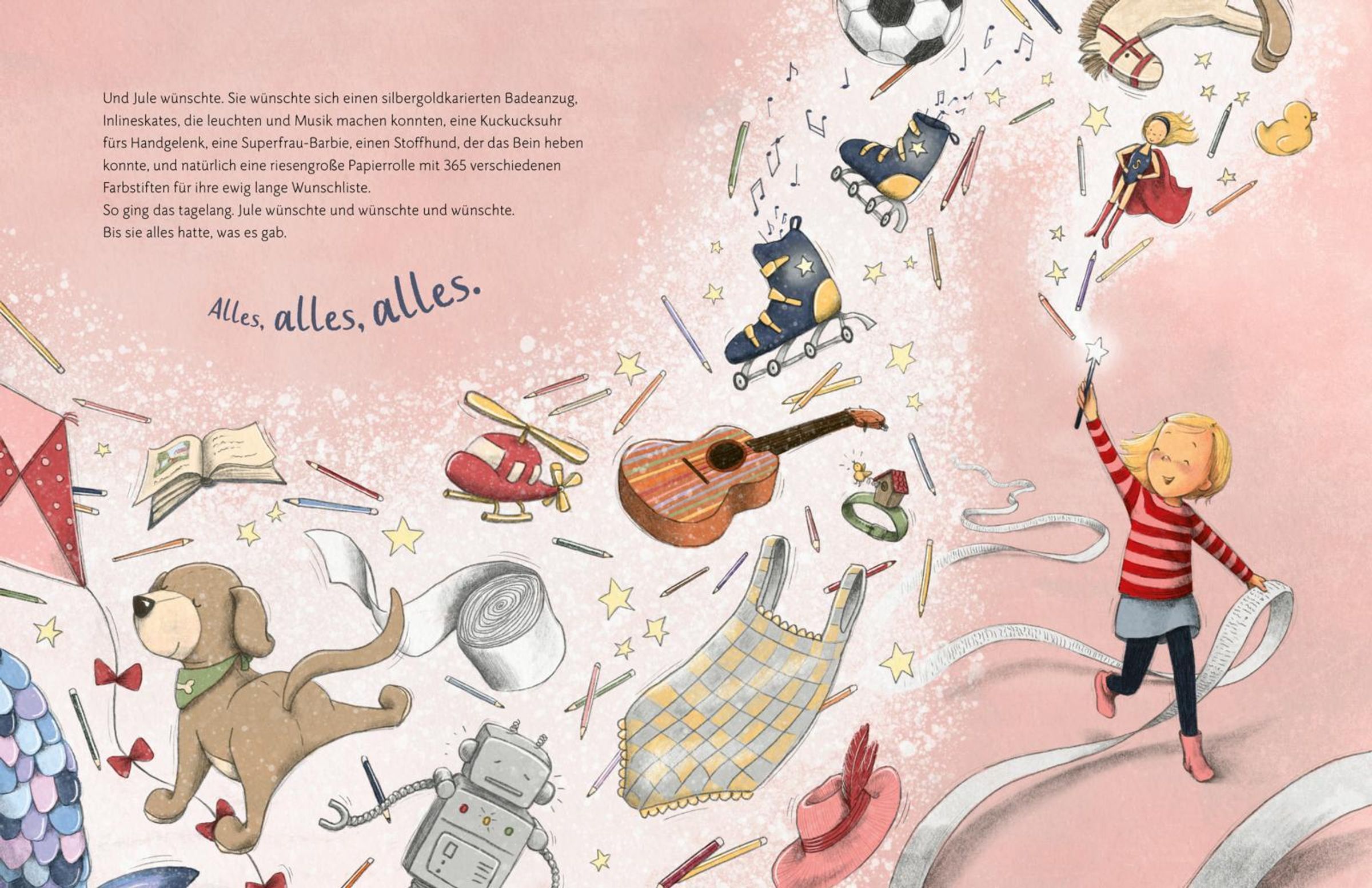 Jule hat viele Wünsche und sie liebt es, sie vor Weihnachten aufzuschreiben. In diesem Jahr ist ihr Wunschzettel so lang, dass ihr der Weihnachtsmann nur ein Geschenk bringt: einen Zauberstab, mit dem sie sich ihre Wünsche selbst erfüllen kann. Jule wünscht und wünscht. Doch je mehr Spielsachen sich um sie herum auftürmen, desto weniger Freude machen sie ihr. Schließlich begreift Jule, dass der wahre Schatz nicht im Besitzen liegt, sondern im Wünschen selbst ...