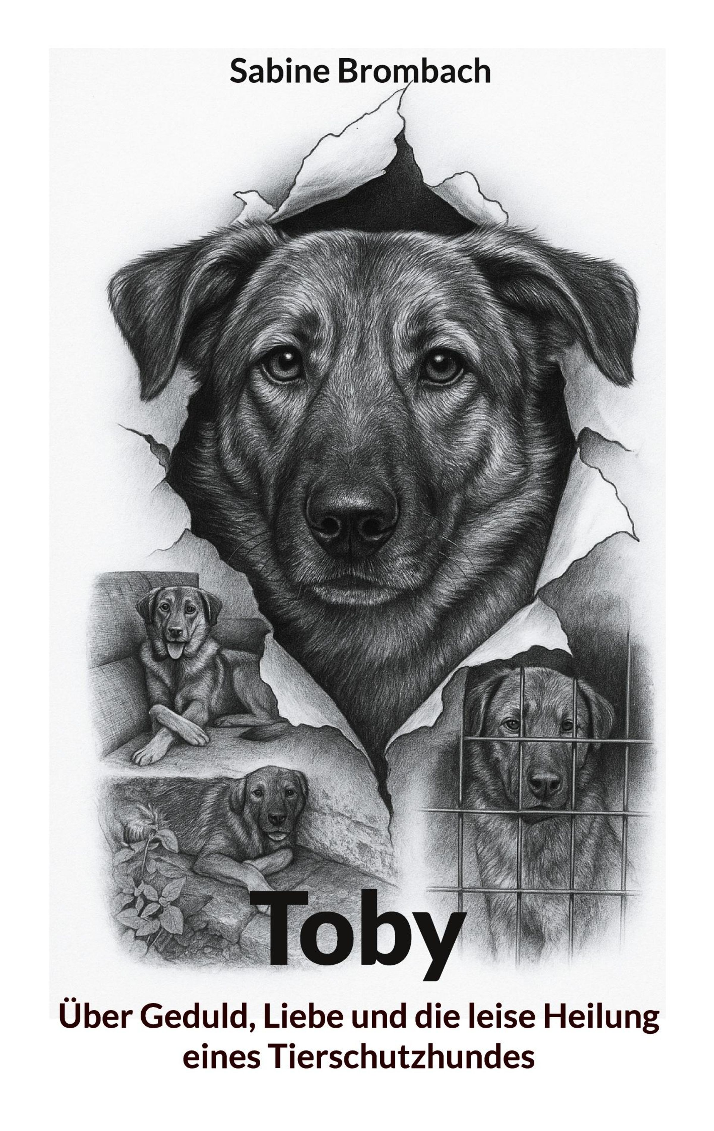 Text: Sabine Brombach. Toby. Über Geduld, Liebe und die leise Heilung eines Tierschutzhundes. Zeichnung eines Hundes., Buch