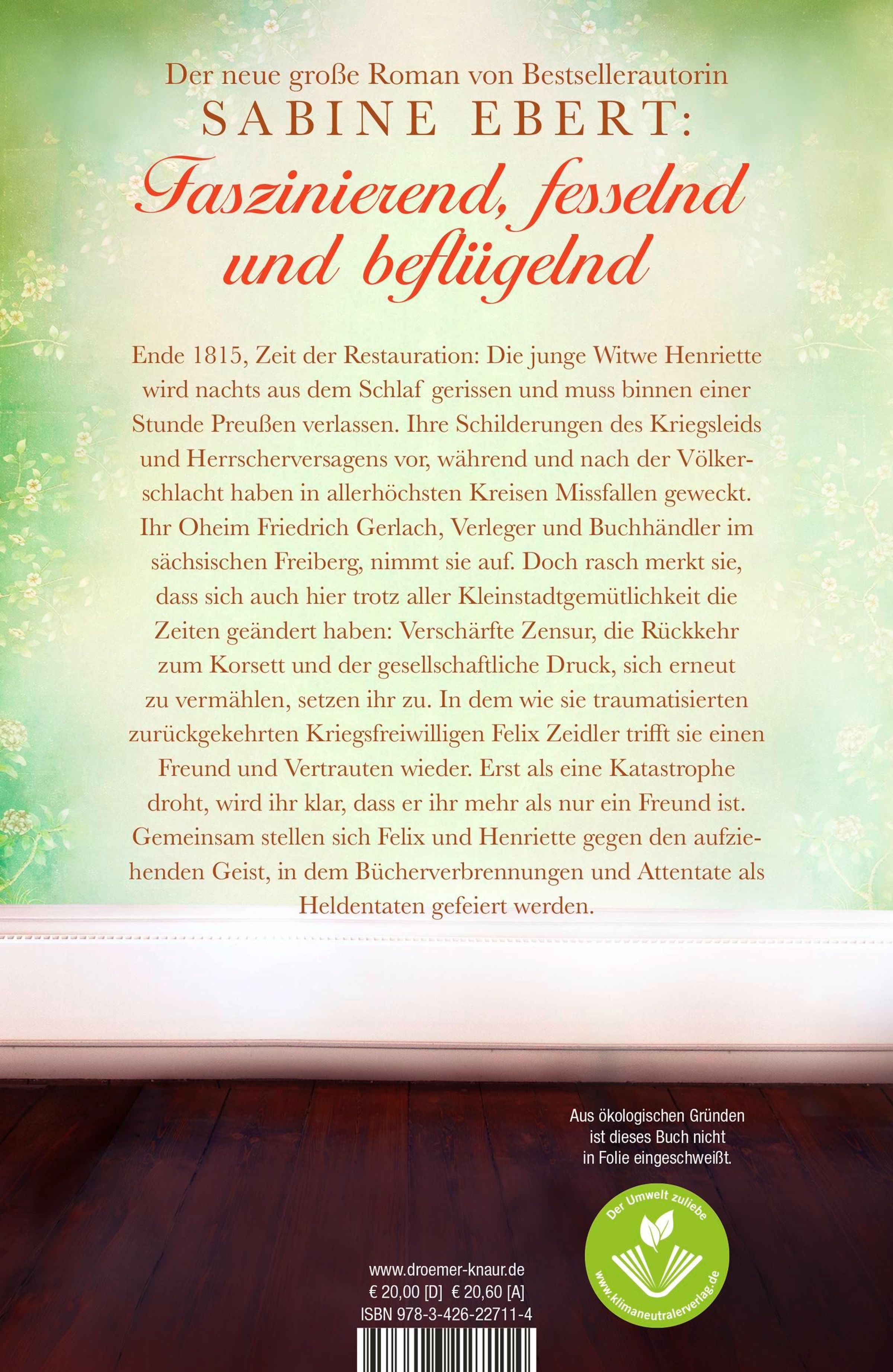 Ende 1815, Zeit der Restauration: Die junge Witwe Henriette wird nachts aus dem Schlaf gerissen und muss laut Polizeierlass binnen einer Stunde Preußen verlassen. Ihre Schilderungen des Kriegsleides und Herrscherversagens vor, während und nach der Völkerschlacht haben in allerhöchsten Kreisen Missfallen geweckt. Der Oheim Friedrich Gerlach, Verleger und Buchhändler im sächsischen Freiberg, nimmt sie auf. Doch rasch merkt sie, dass sich auch hier die Zeiten geändert haben: verschärfte Zensur, die Rückkehr zum Korsett und der gesellschaftliche Druck, sich wieder zu vermählen, setzen ihr zu. Mit der Rückkehr des wie sie traumatisierten Kriegsfreiwilligen Felix Zeidler trifft sie einen Freund und Vertrauten wieder. Doch erst nach einer drohenden Katastrophe wird ihr klar, dass er ihr mehr als nur ein Freund ist. Gemeinsam stellen sich Felix und Henriette gegen den aufziehenden Geist, in dem Bücherverbrennungen und Attentate als Heldentaten gefeiert werden.