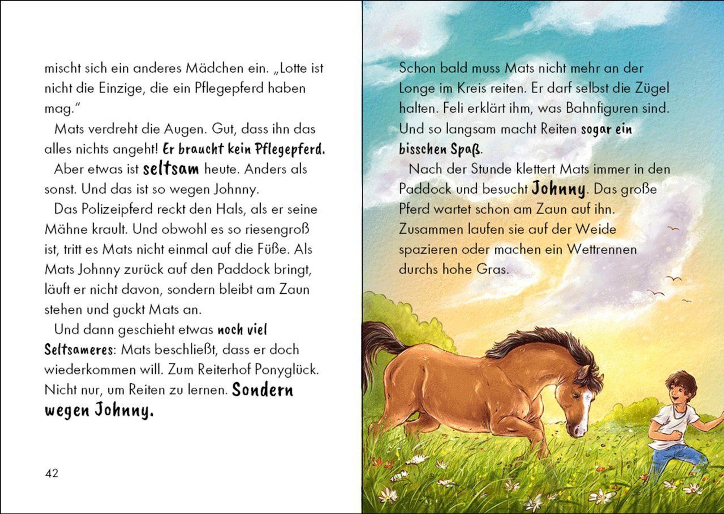 Willkommen auf Reiterhof Ponyglück! Ausgerechnet Reitstunden! Eigentlich hat Mats überhaupt keine Lust darauf - bis das Polizeipferd Johnny ebenfalls neu auf den Reiterhof Ponyglück kommt. Während alle anderen Kinder um Johnny streiten, scheint sich der Neue ausgerechnet Mats ausgesucht zu haben. Das riesige Pferd weicht ihm nicht mehr von der Seite. Ob Johnny Mats davon überzeugen kann, dass Pferde doch ziemlich cool sind?