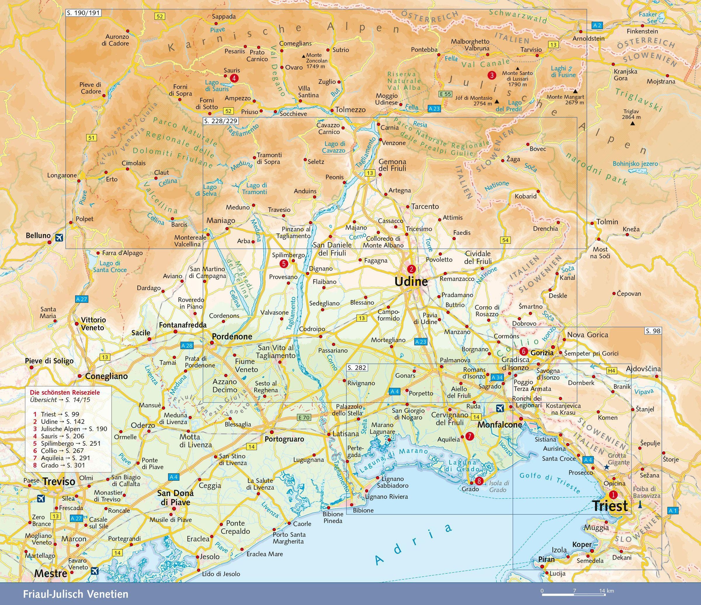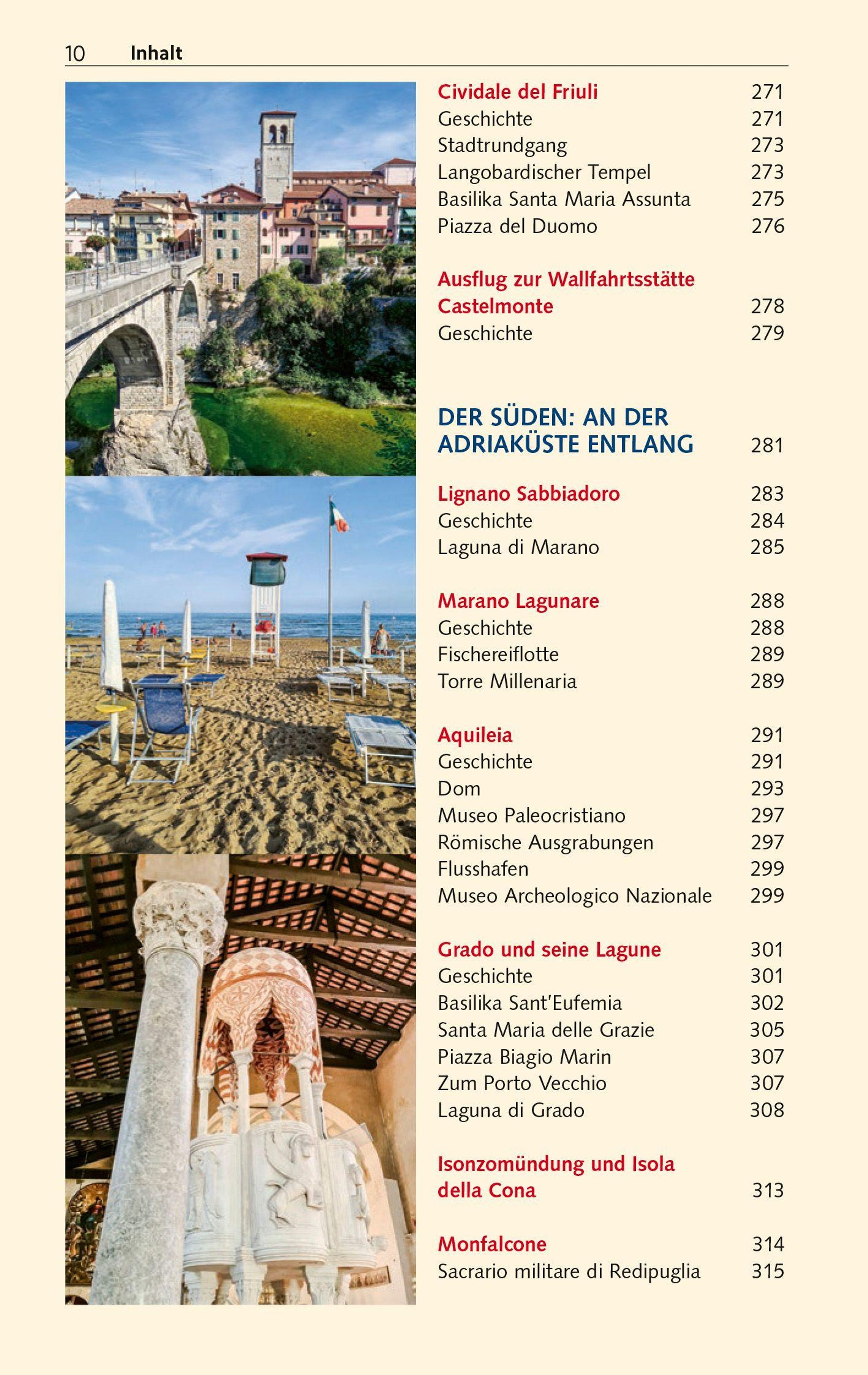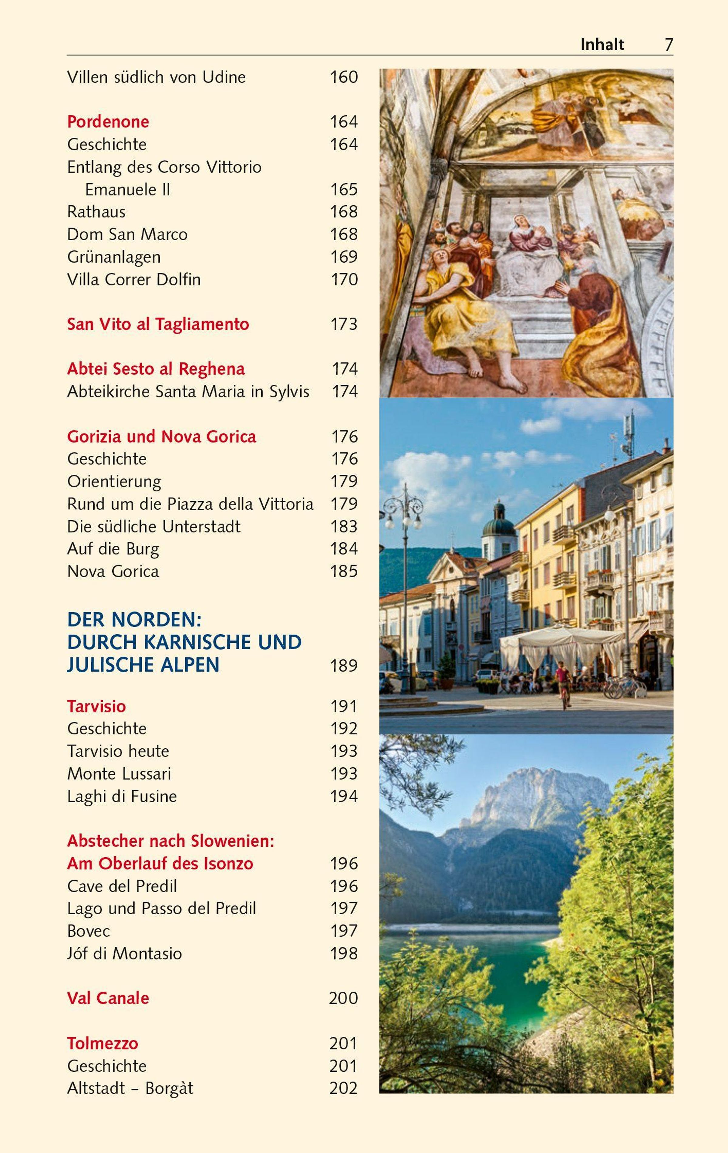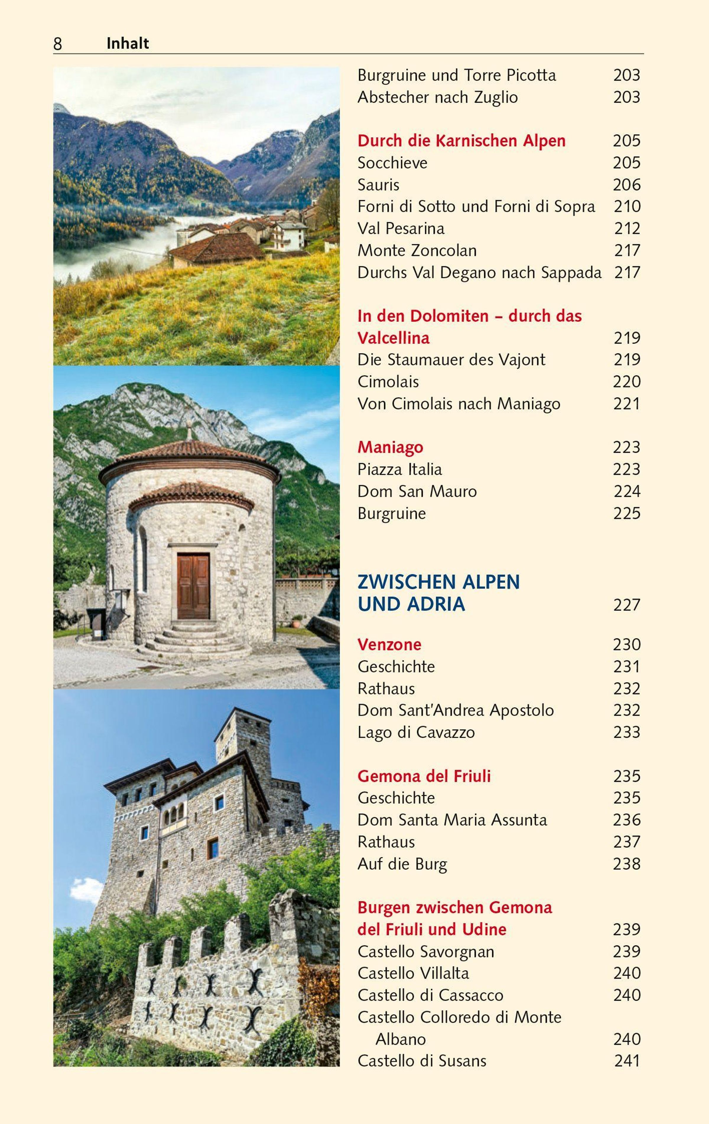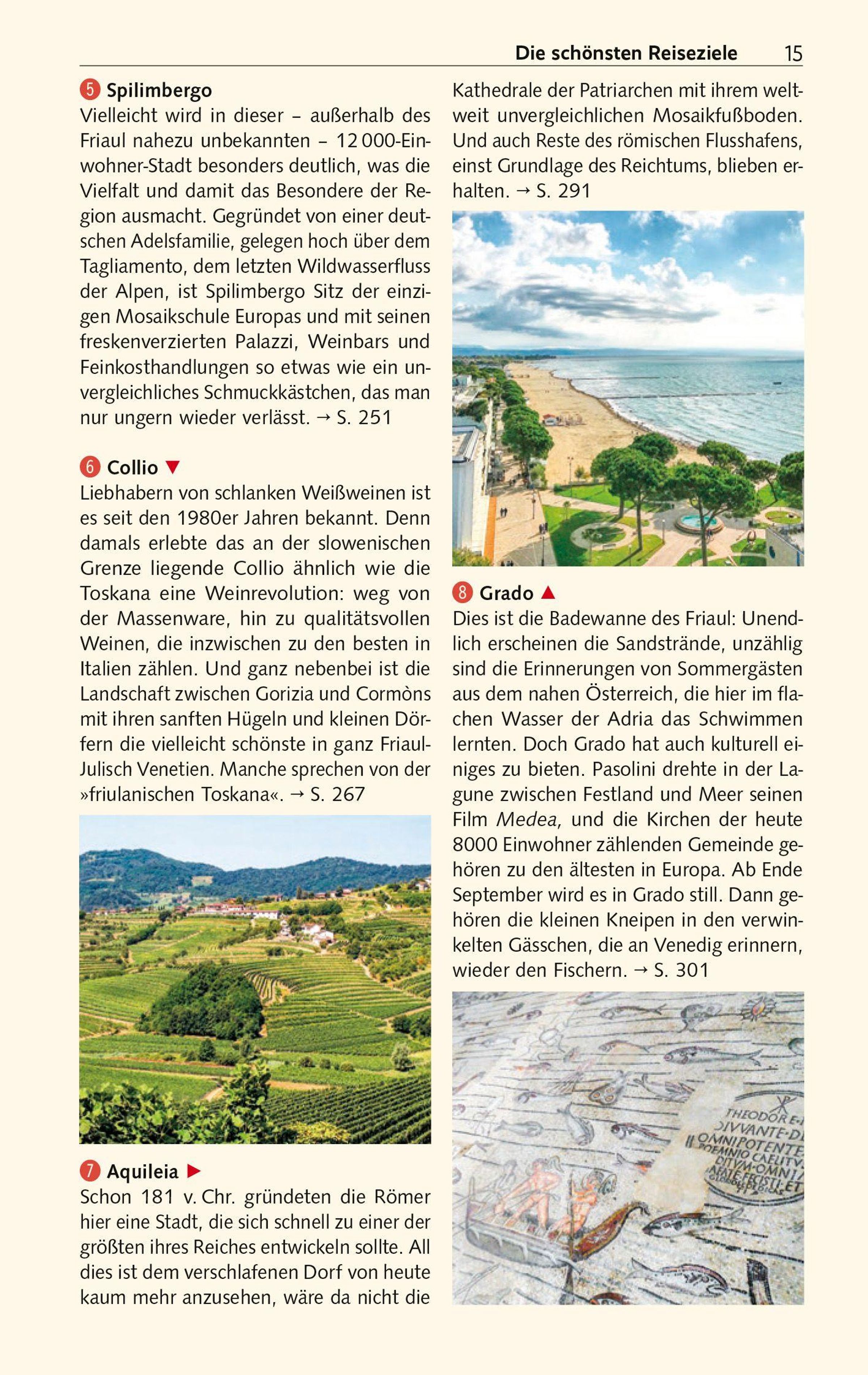 Im Norden laden die Felstürme der Karnischen und Julischen Alpen mit ihren urigen Bergdörfern zum Klettern und Wandern ein. Ein Paradies für alle, die Ursprünglichkeit und Entschleunigung suchen. Weiter südlich schmückt sich die friulanische Tiefebene mit Obst- und Weingärten. Charmante Städtchen, mittelalterliche Burgen, langobardische und venezianische Kunstschätze begeistern Kunst- und Kulturinteressierte. Genießer schwärmen vom Schinken aus San Daniele, dem strohgelben Montasiokäse und den Weißweinen, die im Weinbaugebiet Collio gekeltert werden. Badeurlauber kommen an den kilometerlangen feinsandigen Adriastränden auf ihre Kosten.