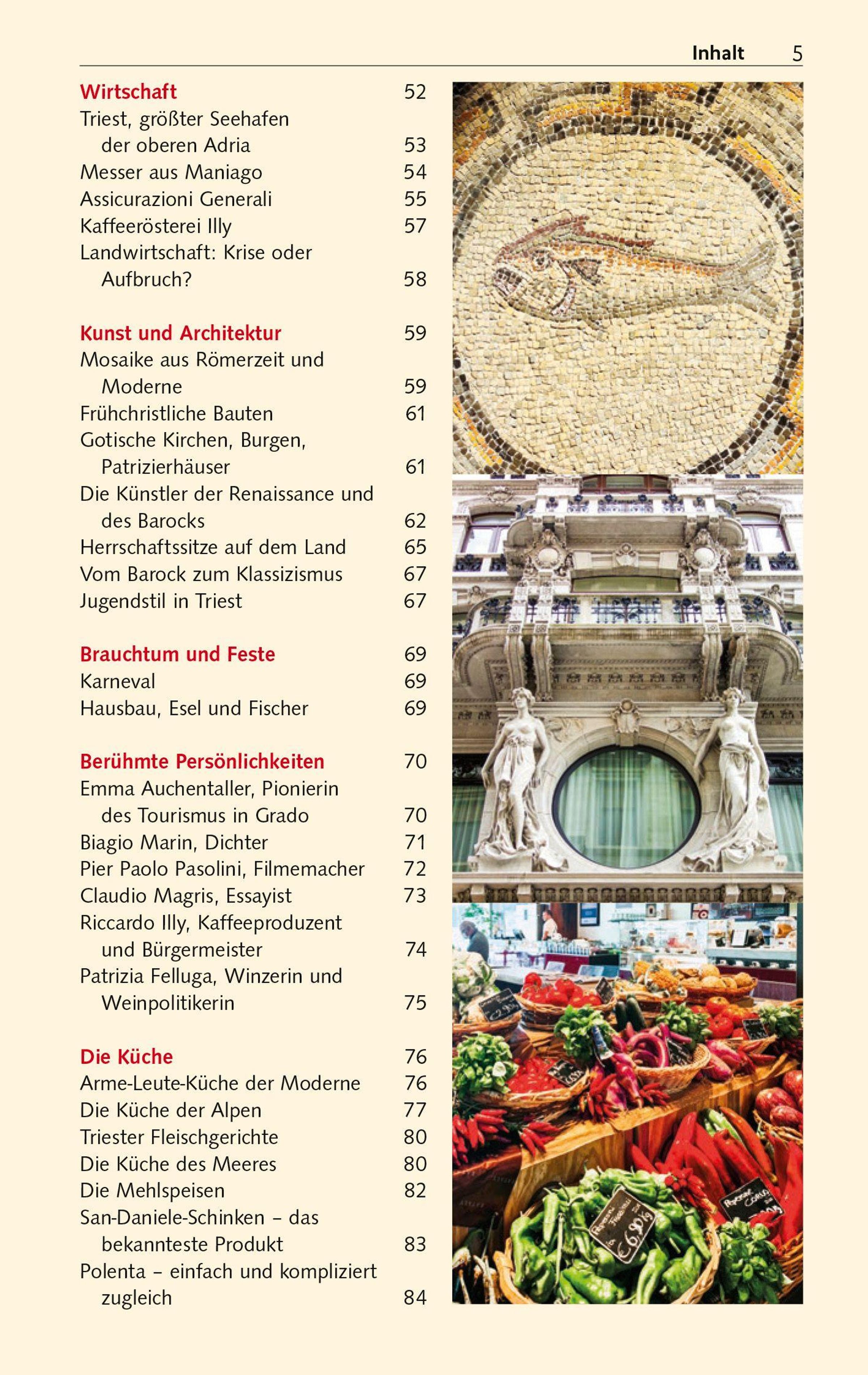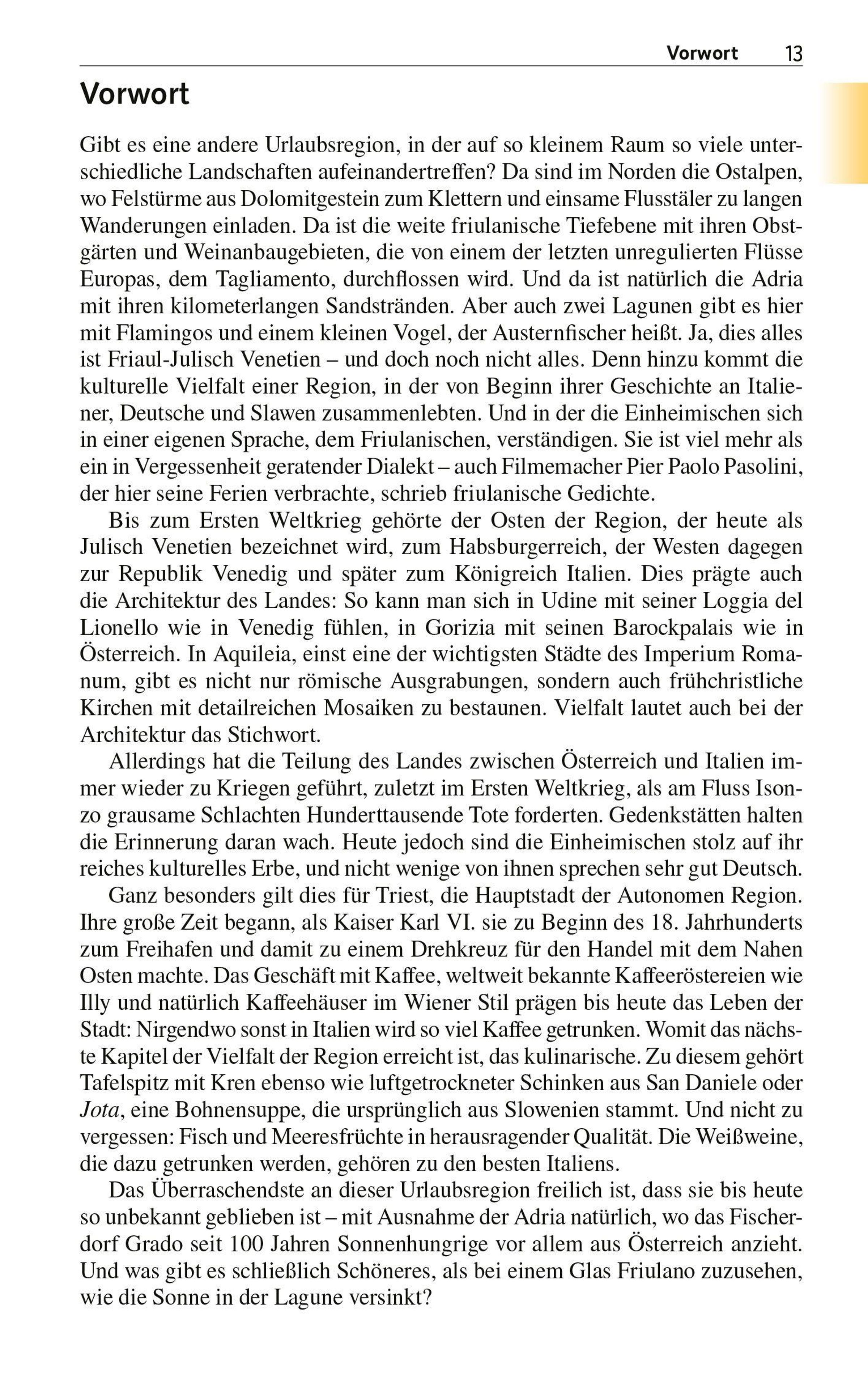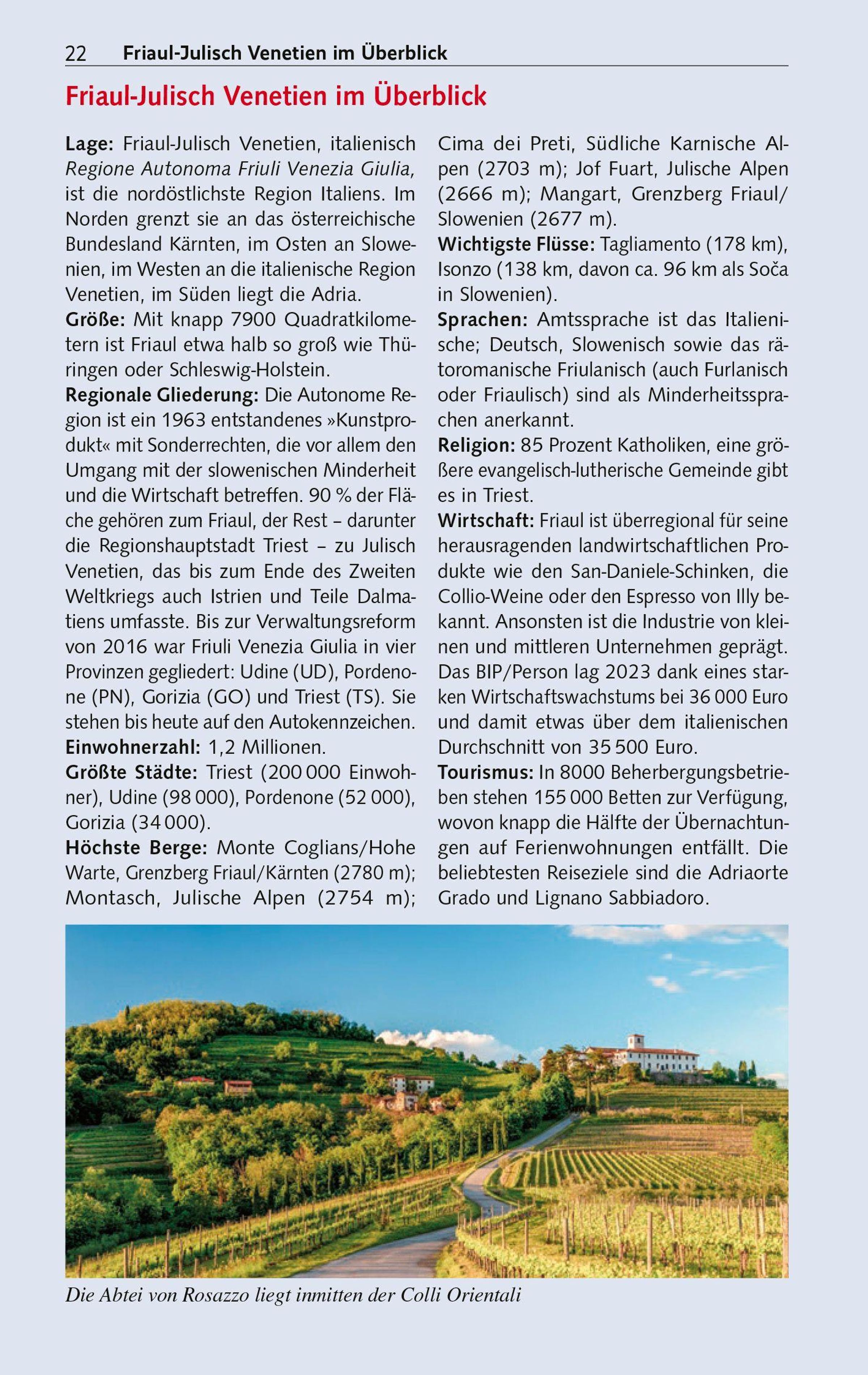 Der Trescher-Reiseführer FRIAUL-JULISCH VENETIEN begleitet kompetent durch den facettenreichen Landstrich, stellt die schönsten Orte und Sehenswürdigkeiten vor und bietet viele Anregungen für Wanderungen und Radtouren. Eine umfangreiche Einführung macht mit Geschichte, Natur, Kultur und Küche bekannt. Ausflüge ins nahe Slowenien, Empfehlungen für Hotels und Restaurants, ein kleiner Sprachführer und zahlreiche praktische Reisetipps komplettieren das Buch zum idealen Begleiter für Genießer, Kunstfreunde und Aktivurlauber unterwegs im Nordosten Italiens.
