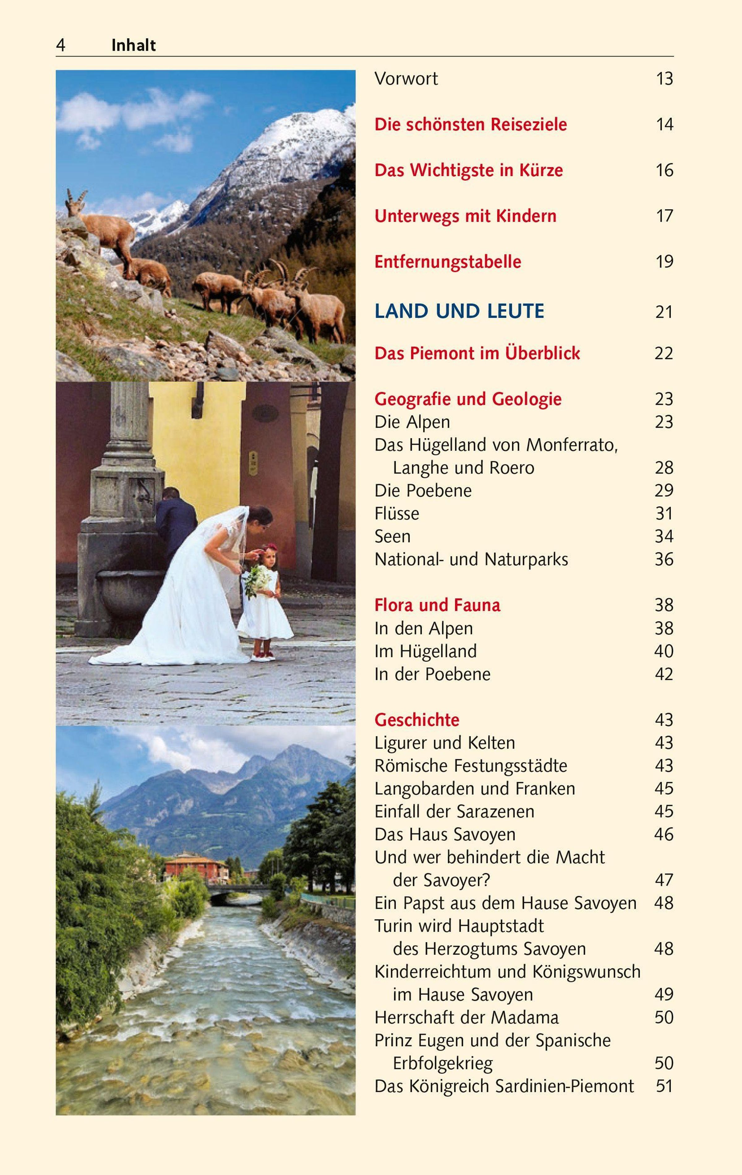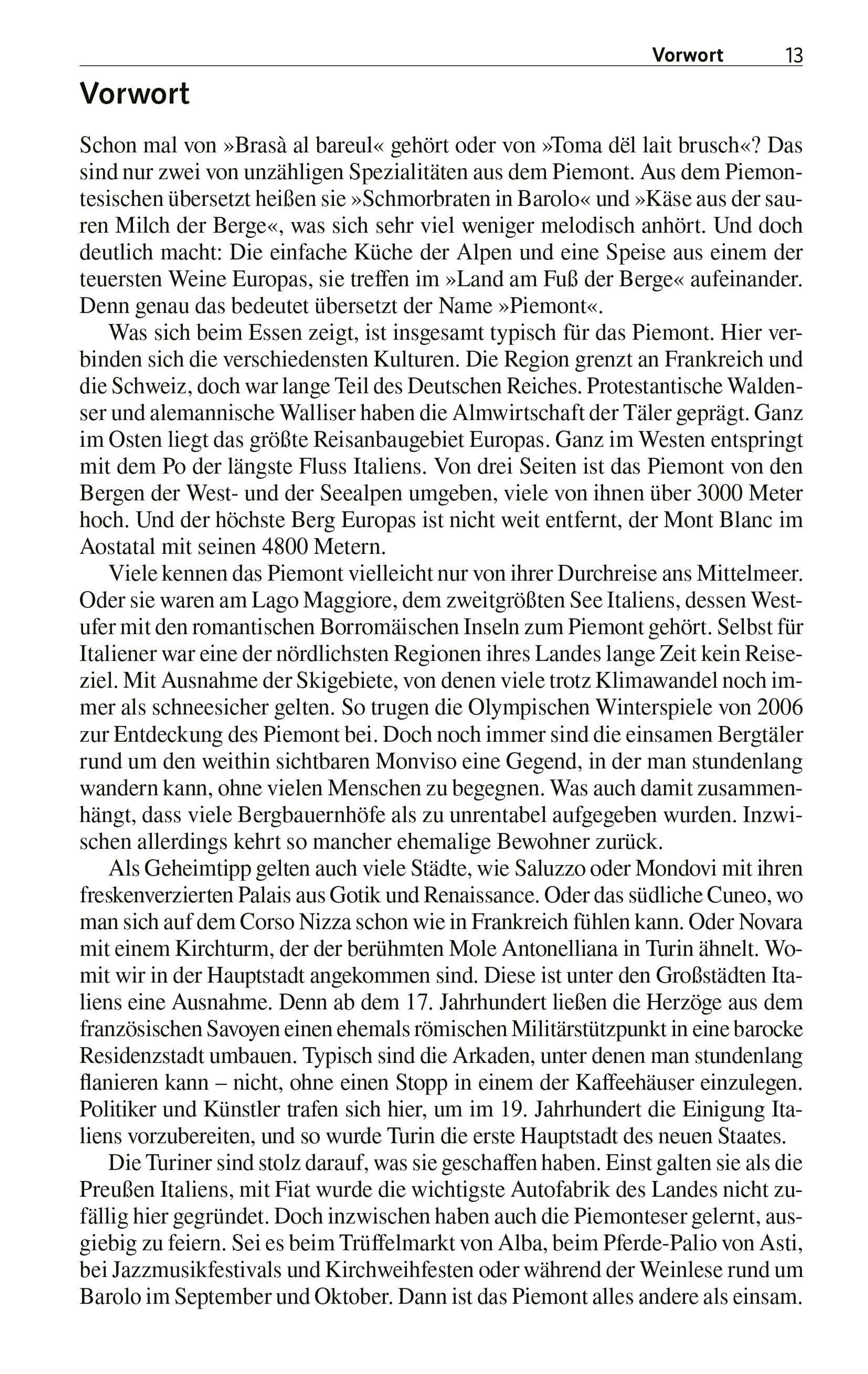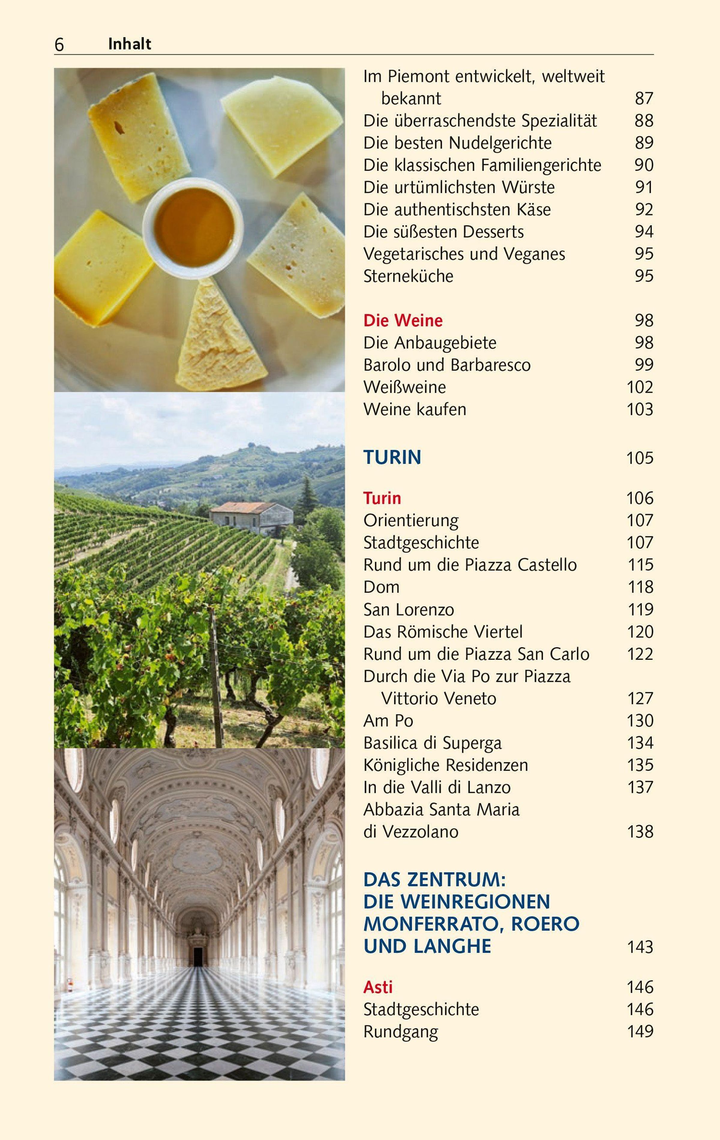 Von den West- und den Seealpen umschlossen, breiten sich gen Osten das Hügelland der berühmten Weinbaugebiete Langhe und Monferrato sowie die Reisfelder der Poebene aus. Wo Barolo, Barbaresco und Barbera gekeltert werden, wachsen im Verborgenen die edlen weißen Trüffel. Turin war und ist nicht nur als wirtschaftliches Zentrum bedeutsam, als erste Hauptstadt des geeinten Italiens blickt es auch auf eine reiche Geschichte zurück. Dabei prägen Barock und Jugendstil das Stadtbild gleichermaßen. Auch im übrigen Piemont gibt es viel zu entdecken: von prähistorischen Pfahlbauten in den Alpen, über die Türme der Sarazenen bis hin zu den Villen am mediterranen Lago Maggiore. Ein Abstecher ins angrenzende Aostatal führt in den Nationalpark Gran Paradiso und zum Mont Blanc.