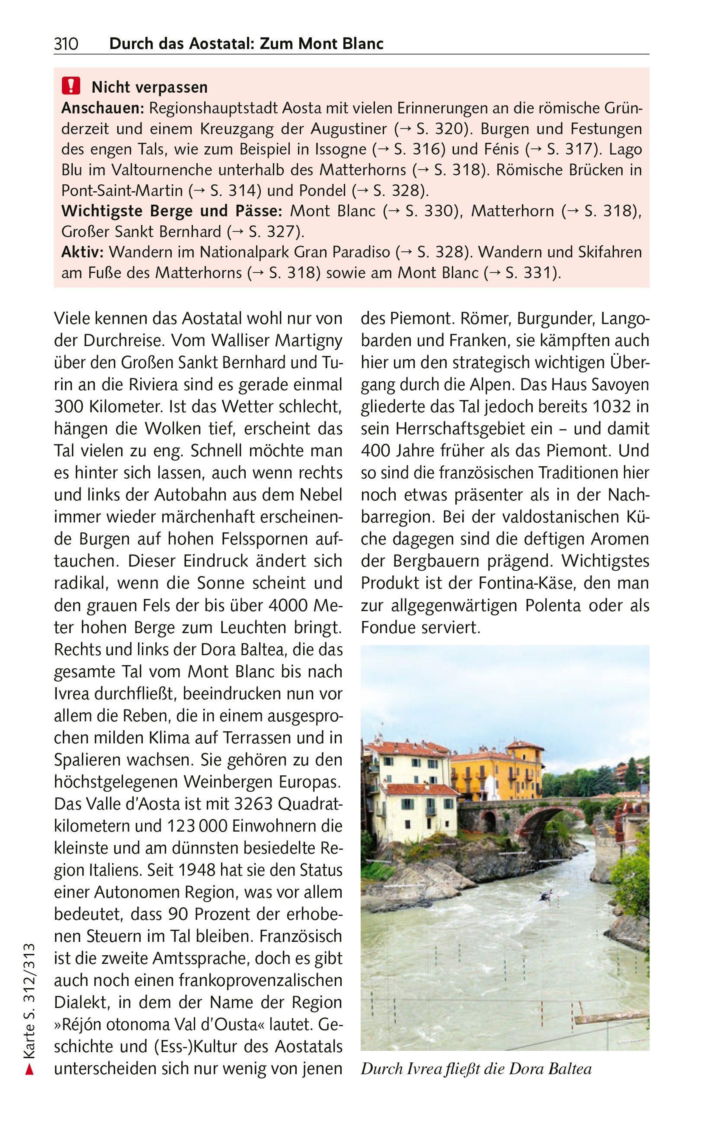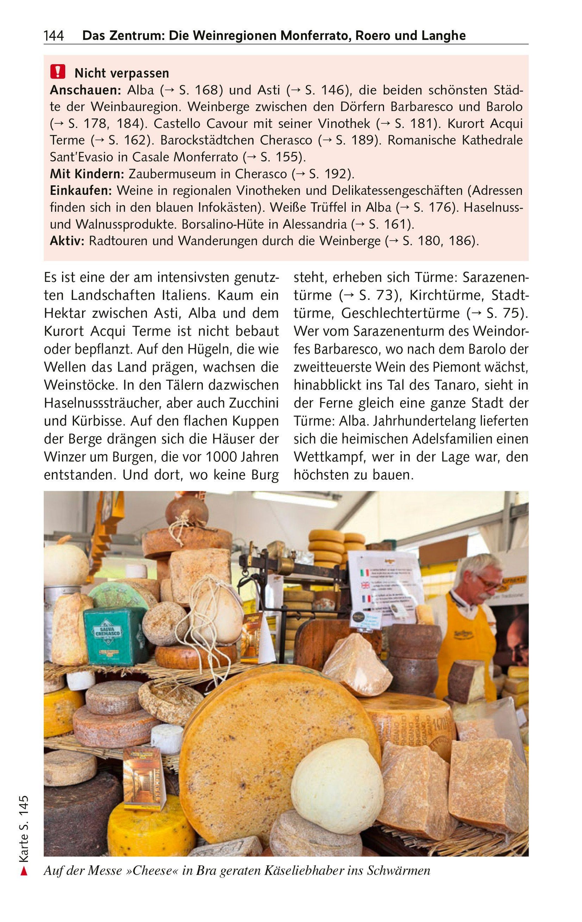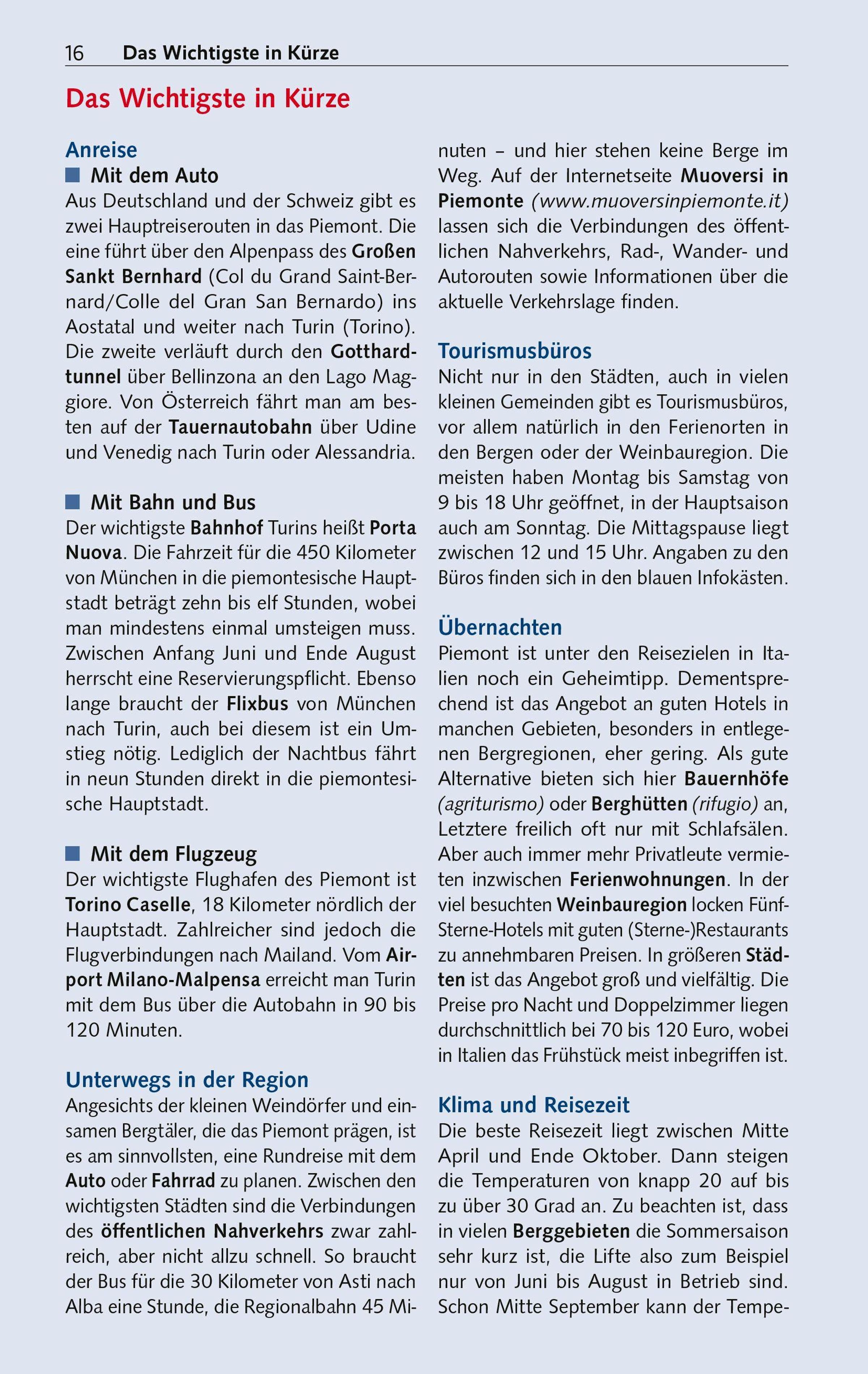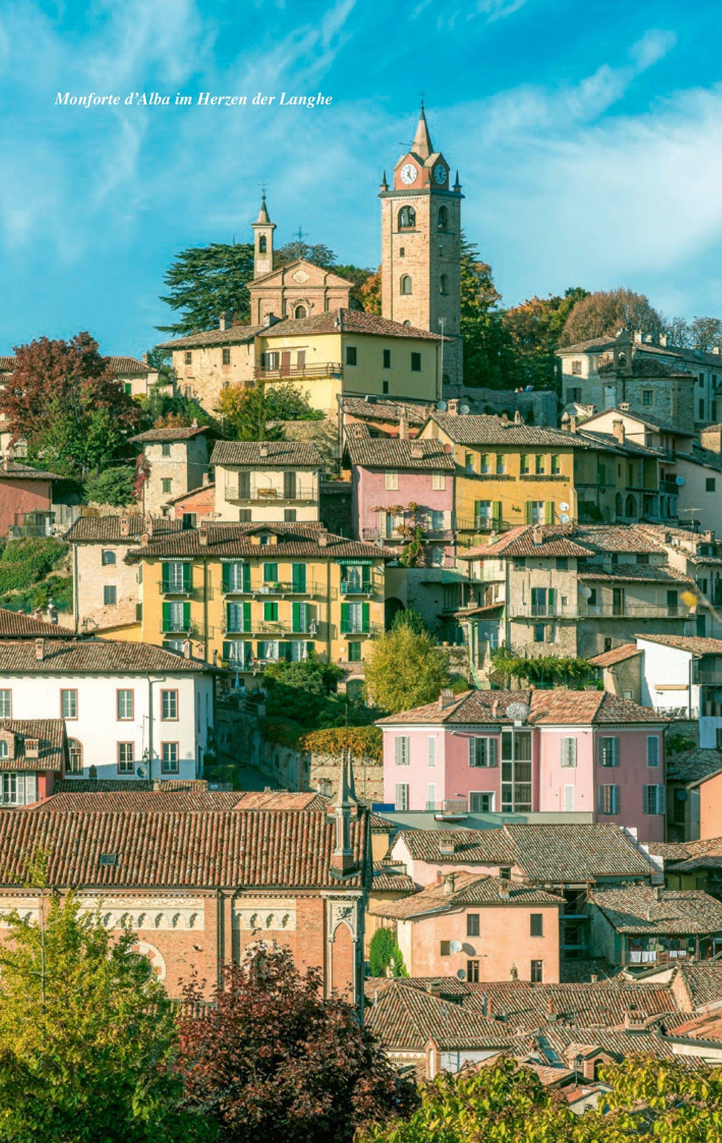 Von den West- und den Seealpen umschlossen, breiten sich gen Osten das Hügelland der berühmten Weinbaugebiete Langhe und Monferrato sowie die Reisfelder der Poebene aus. Wo Barolo, Barbaresco und Barbera gekeltert werden, wachsen im Verborgenen die edlen weißen Trüffel. Turin war und ist nicht nur als wirtschaftliches Zentrum bedeutsam, als erste Hauptstadt des geeinten Italiens blickt es auch auf eine reiche Geschichte zurück. Dabei prägen Barock und Jugendstil das Stadtbild gleichermaßen. Auch im übrigen Piemont gibt es viel zu entdecken: von prähistorischen Pfahlbauten in den Alpen, über die Türme der Sarazenen bis hin zu den Villen am mediterranen Lago Maggiore. Ein Abstecher ins angrenzende Aostatal führt in den Nationalpark Gran Paradiso und zum Mont Blanc.
