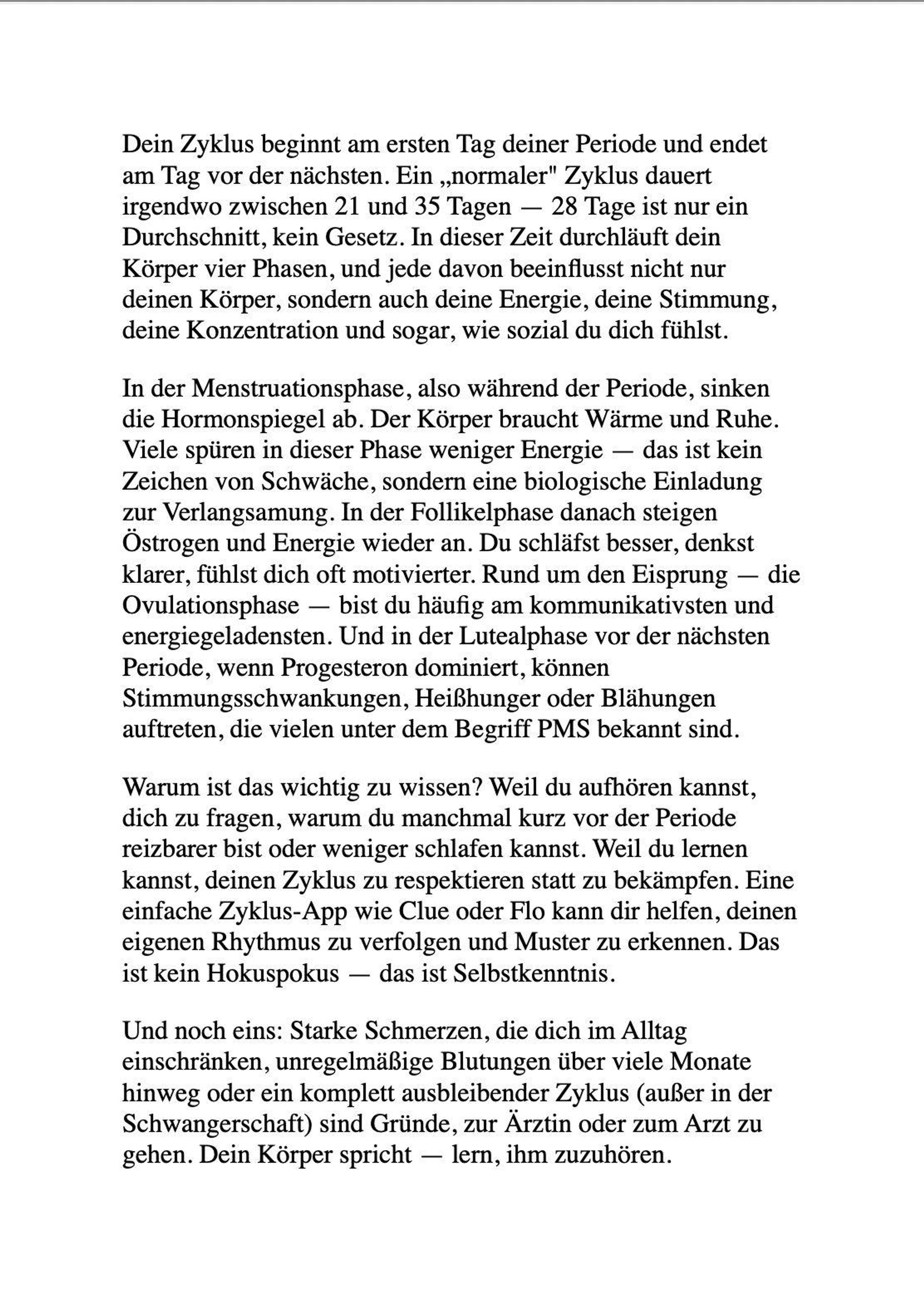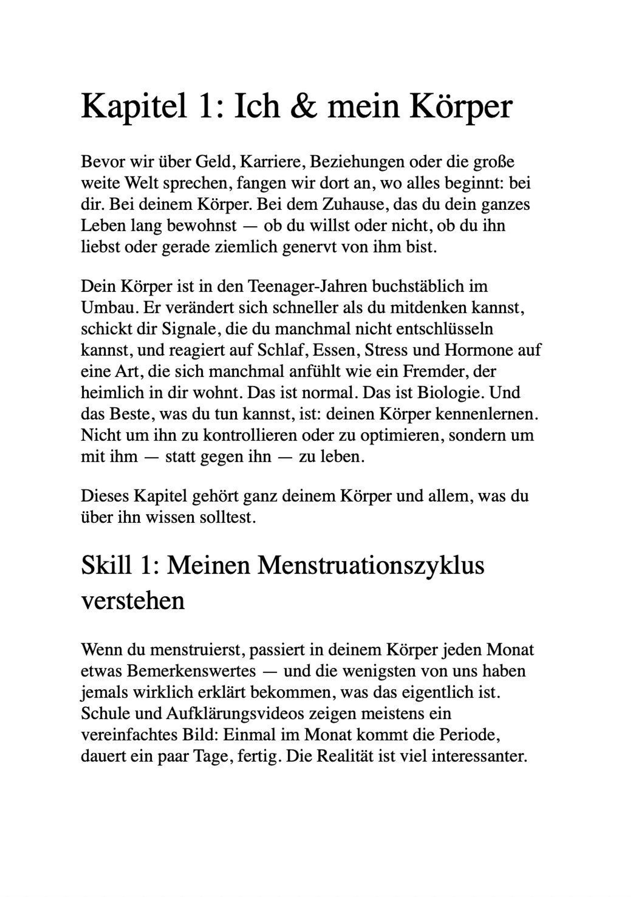 Ihren Körper zu verstehen und gut für ihre Gesundheit zu sorgen Mit Emotionen wie Stress, Unsicherheit, Angst und Druck gesund umzugehen Selbstvertrauen aufzubauen - ohne sich mit anderen vergleichen zu müssen Freundschaften und Beziehungen respektvoll und klar zu gestalten Mit Schule, Geld, Alltag und digitalen Medien bewusst umzugehen Rückschläge zu verarbeiten und daran zu wachsen Eigene Werte zu entwickeln und Entscheidungen selbstbewusst zu treffen