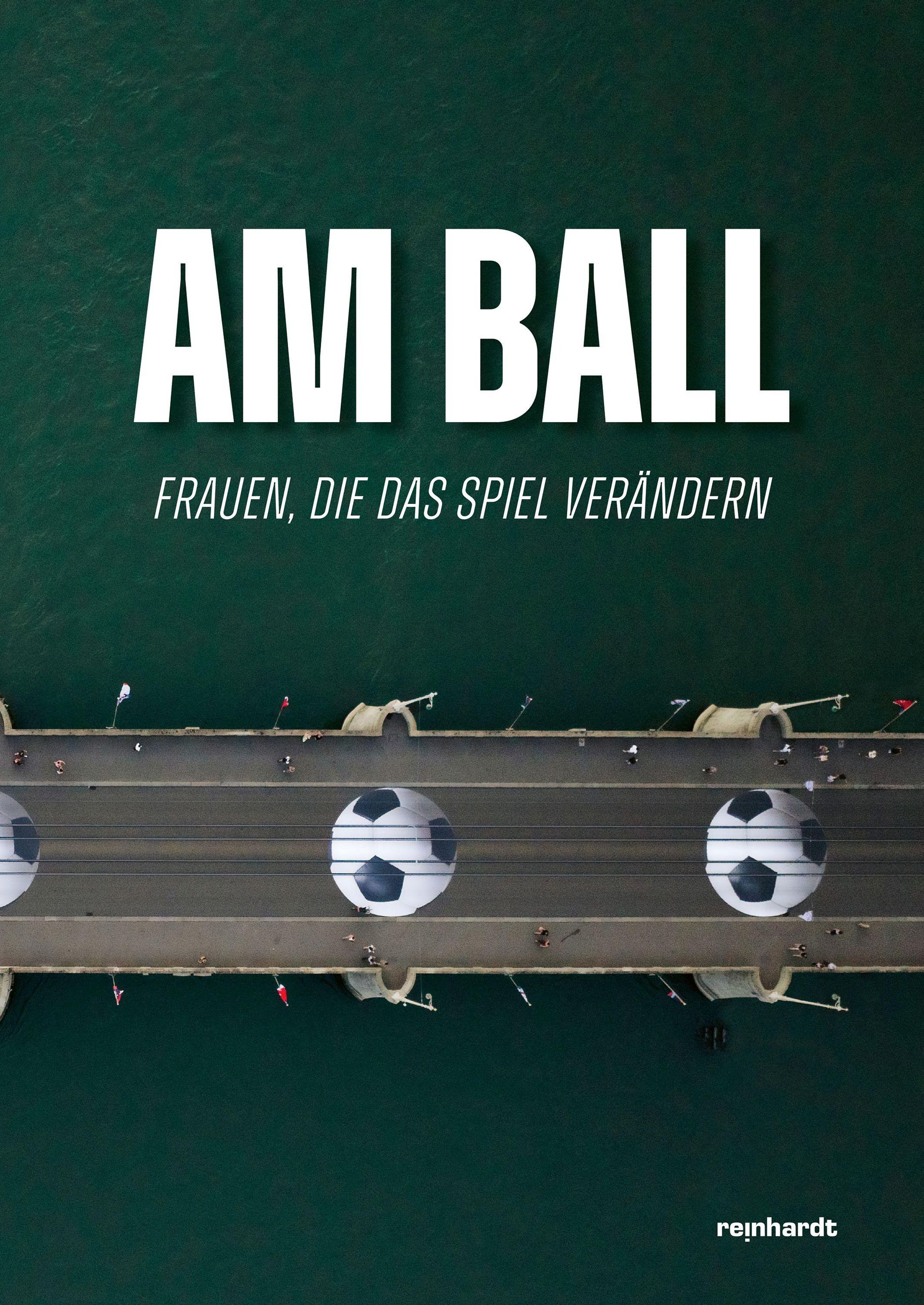 „AM BALL: FRAUEN, DIE DAS SPIEL VERÄNDERN“ in Großbuchstaben, darunter eine Luftaufnahme einer Brücke mit Fußbällen., Buch