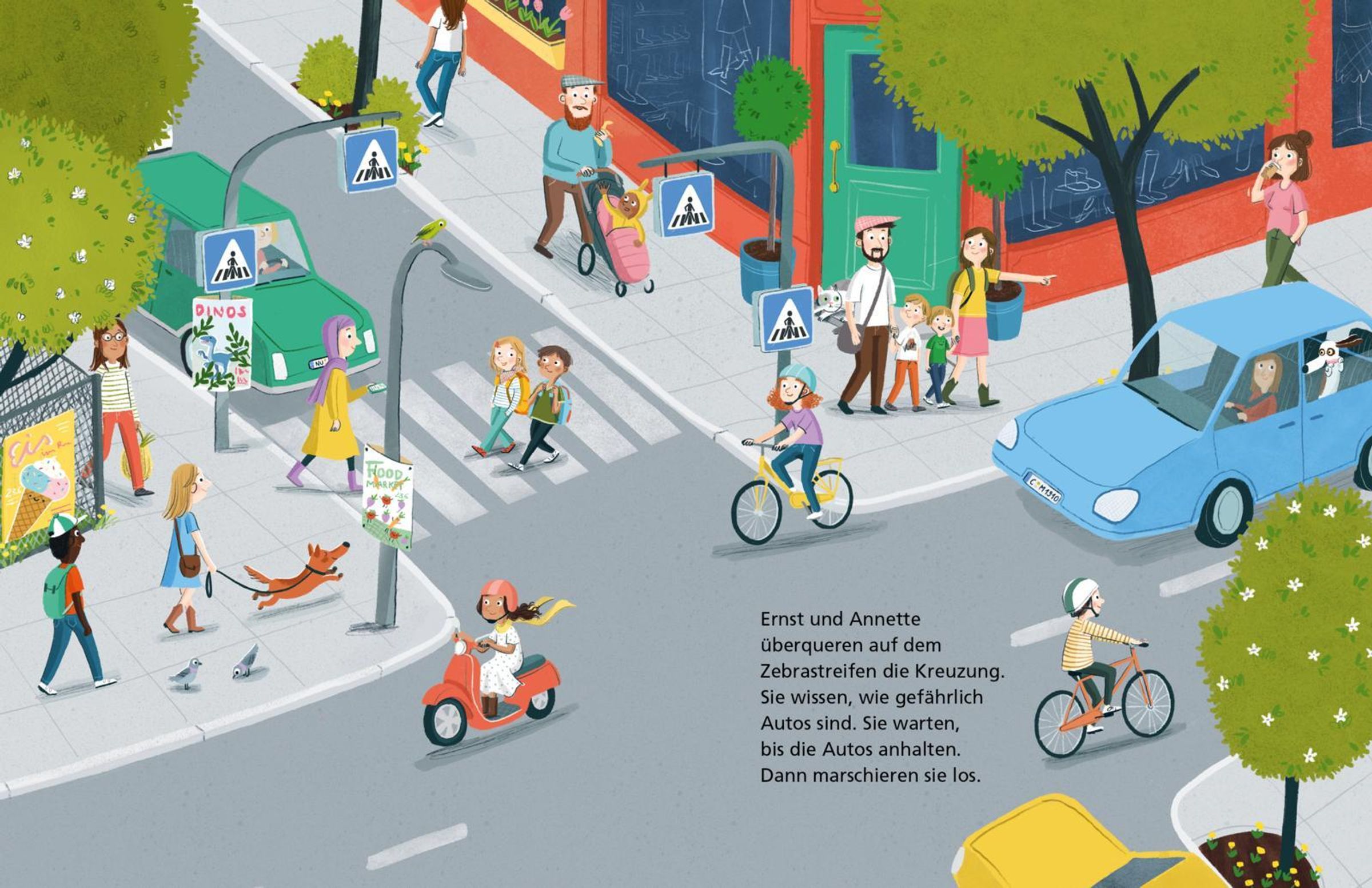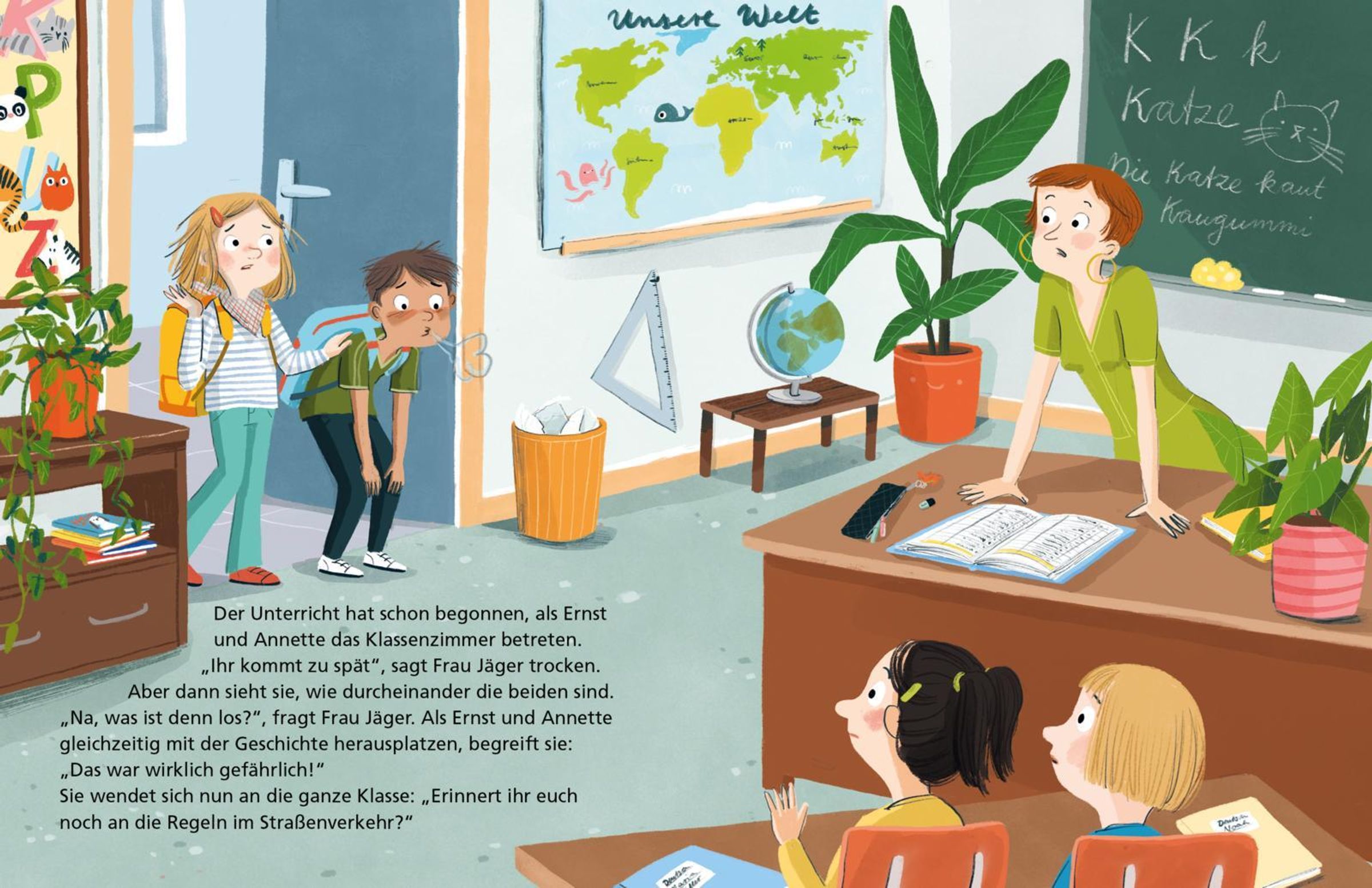 Zebrastreifen, Ampel und Co - wie wichtig es ist, im Straßenverkehr gut aufzupassen und was die Verkehrsschilder bedeuten, wissen Ernst und Annette genau. Die beiden sind seit dem ersten Schultag beste Freunde und gehen den Schulweg am liebsten gemeinsam. Eines Tages passiert trotzdem fast etwas Schlimmes. Danach schreibt die Annette dem Ernst die Regeln lieber noch mal extra dick hinter die Ohren. Mit Filzstift!