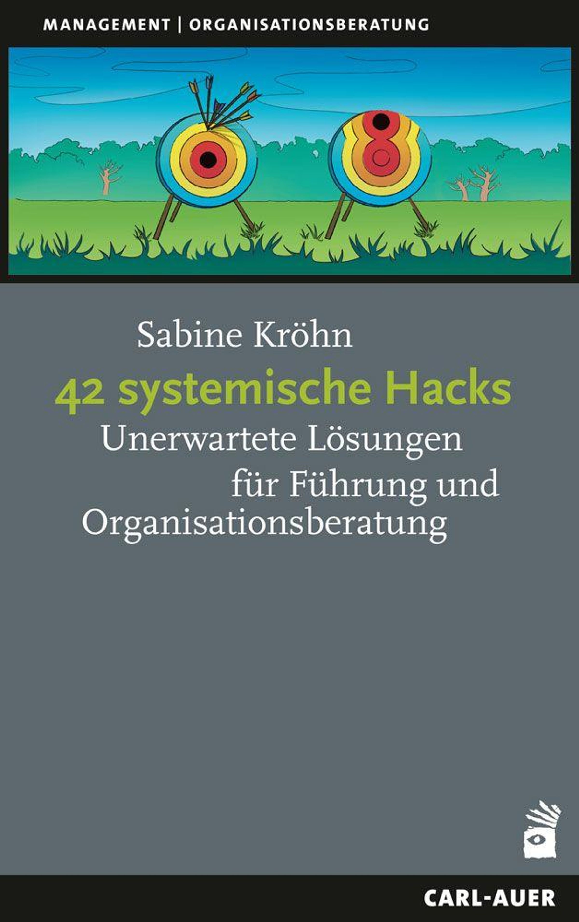 Text: "42 systemische Hacks: Unerwartete Lösungen für Führung und Organisationsberatung." Zwei Zielscheiben auf einer Wiese., Buch