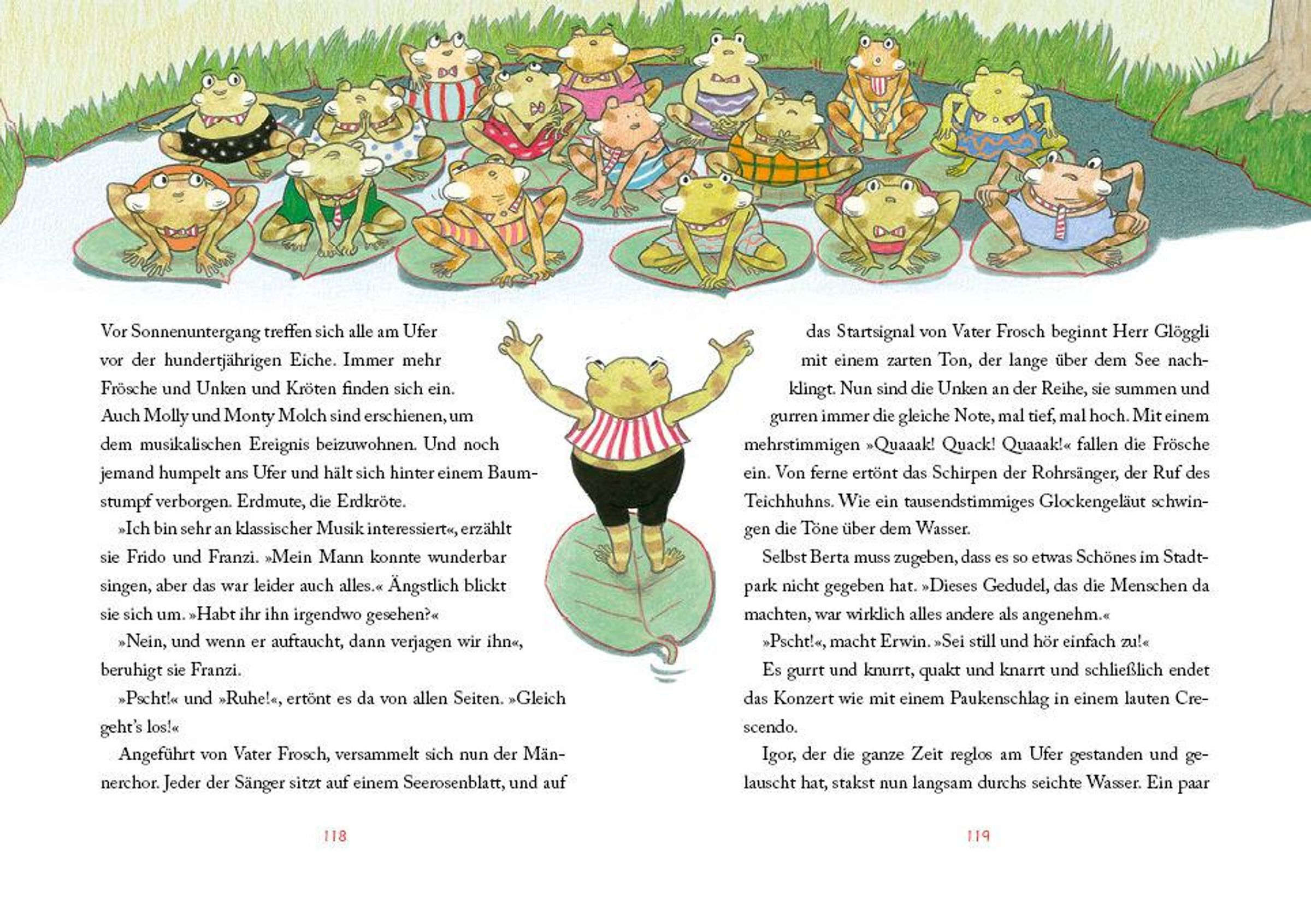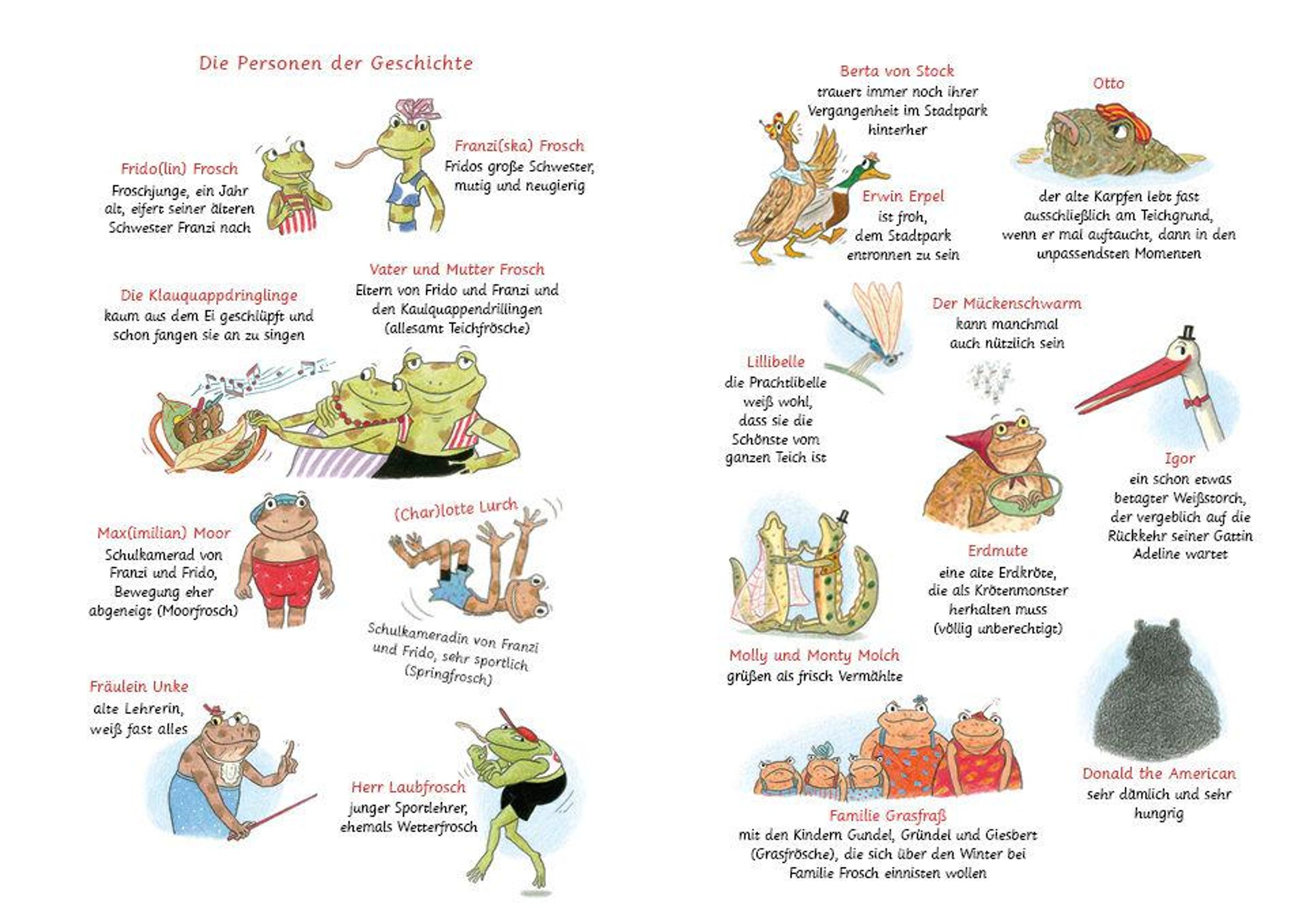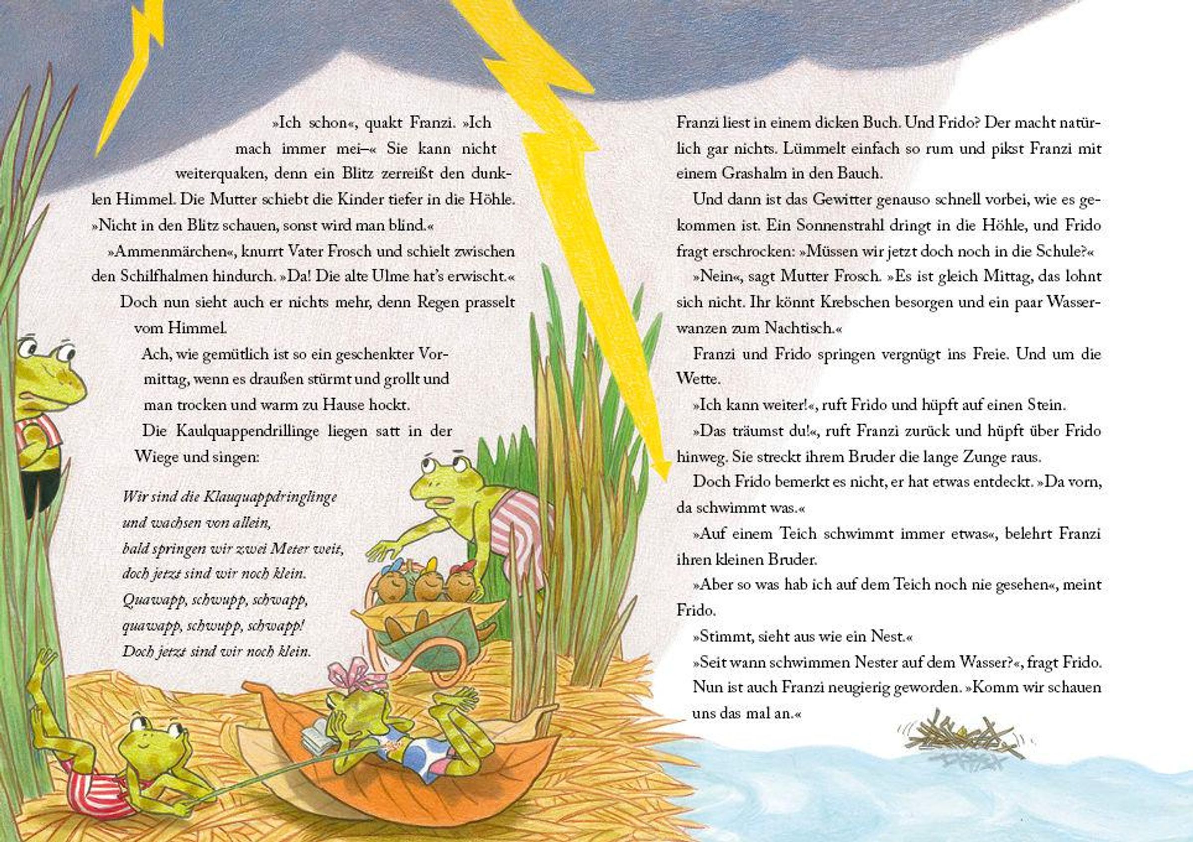 Was gibt es Schöneres als einen Teich, der in der Morgensonne schimmert? Doch die Idylle trügt. Familie Frosch hat Probleme wie jede andere Familie auch. Die Kaulquappendrillinge sind kaum zu bändigen, und Franzi und Frido, die übermütigen älteren Geschwister, stecken ständig in Schwierigkeiten. Da kann Fräulein Unke, die Lehrerin, noch so sehr vor den Gefahren warnen, die auf kleine Frösche lauern ...