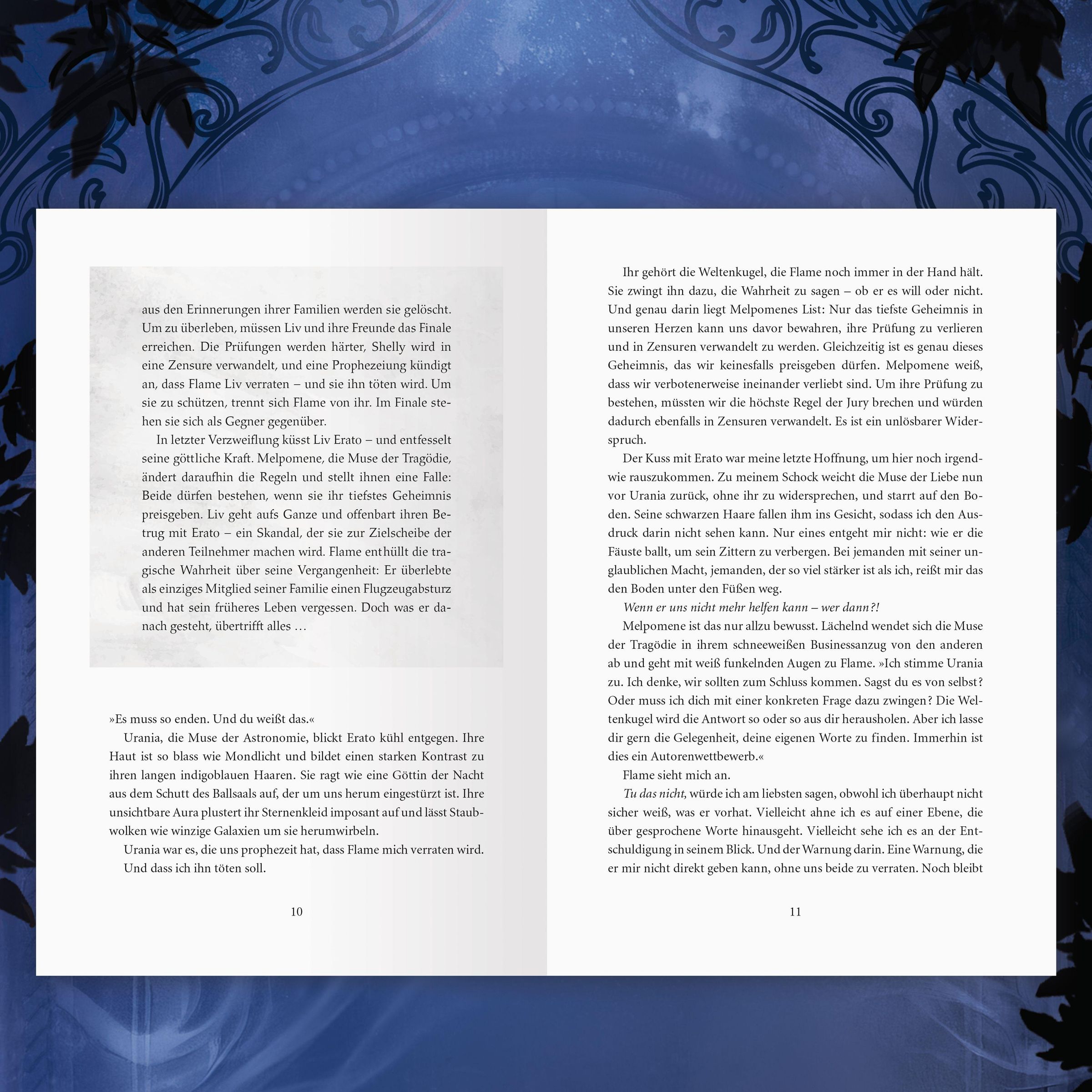 Livs Welt steht Kopf. Flames tragisches Liebesgeständnis bringt sie beide in tödliche Gefahr - doch was Erato, die Muse der Liebe, vor den Augen der Jury enthüllt, erschüttert Liv noch tiefer. Seit sie Shellys Geheimnis kennt, steht sie selbst im Visier. Die einzige Chance, ihrem Schicksal zu entkommen: Liv muss alle Prüfungen überstehen und mit Flame das Finale des Autorenwettbewerbs erreichen. Doch Uranias grausame Prophezeiung droht, ihre Liebe für immer zu zerstören ...