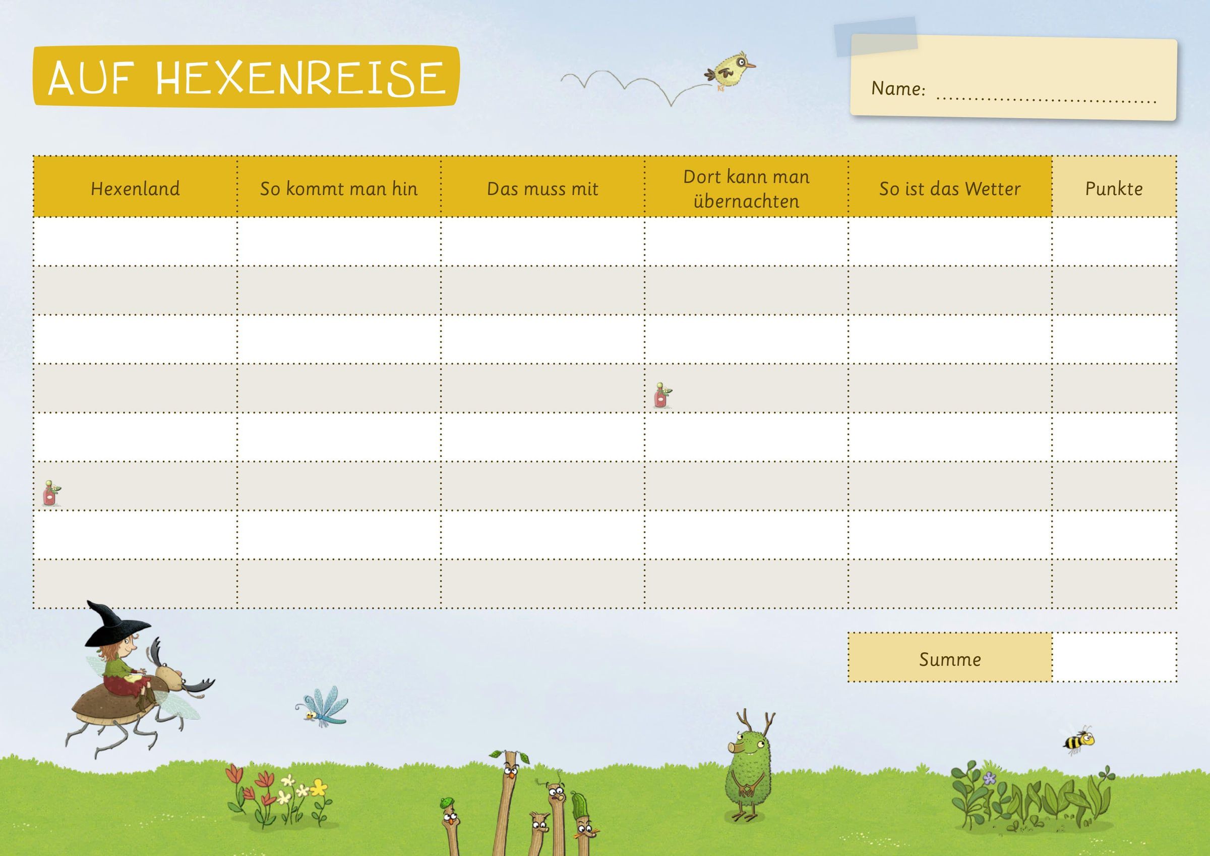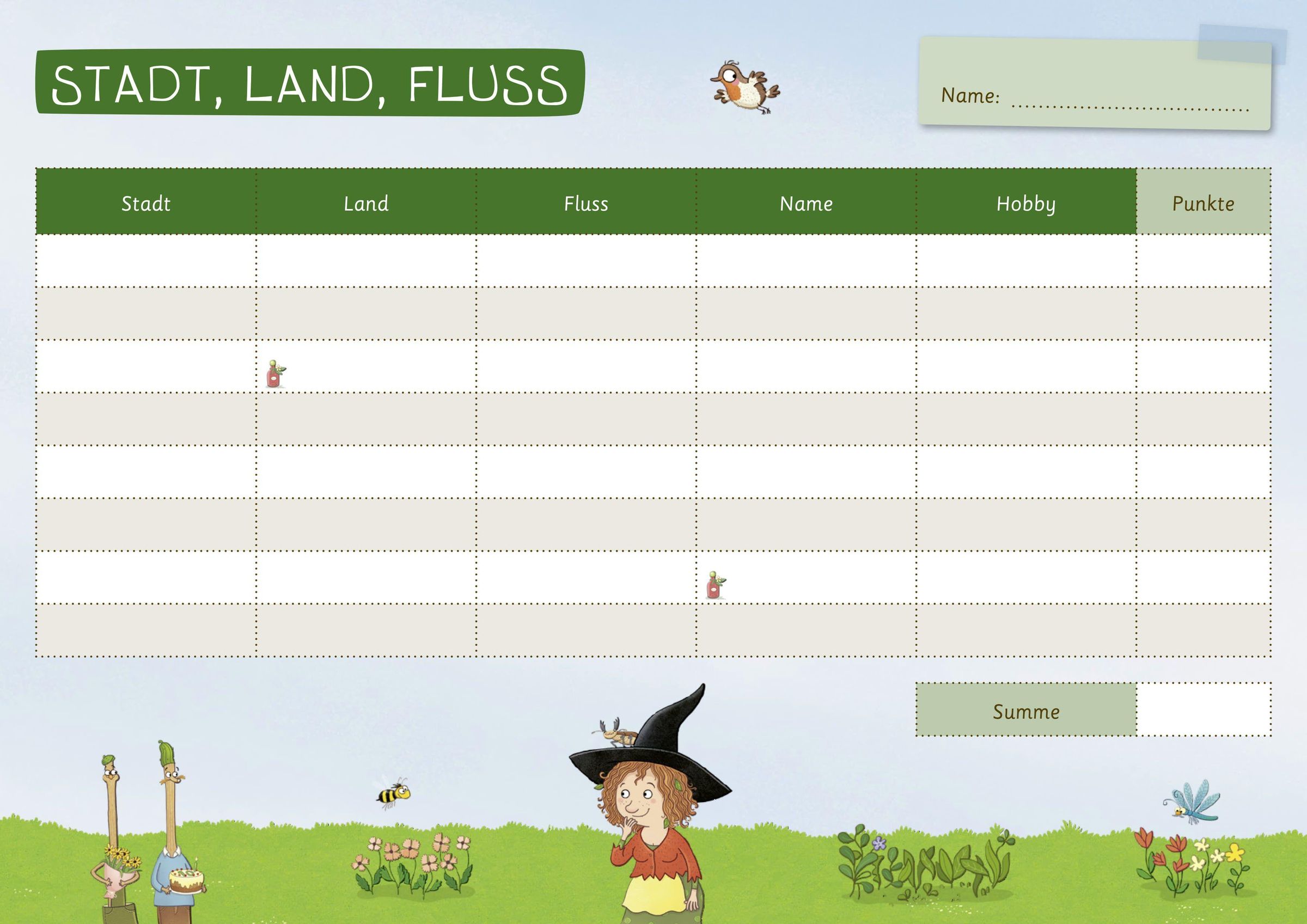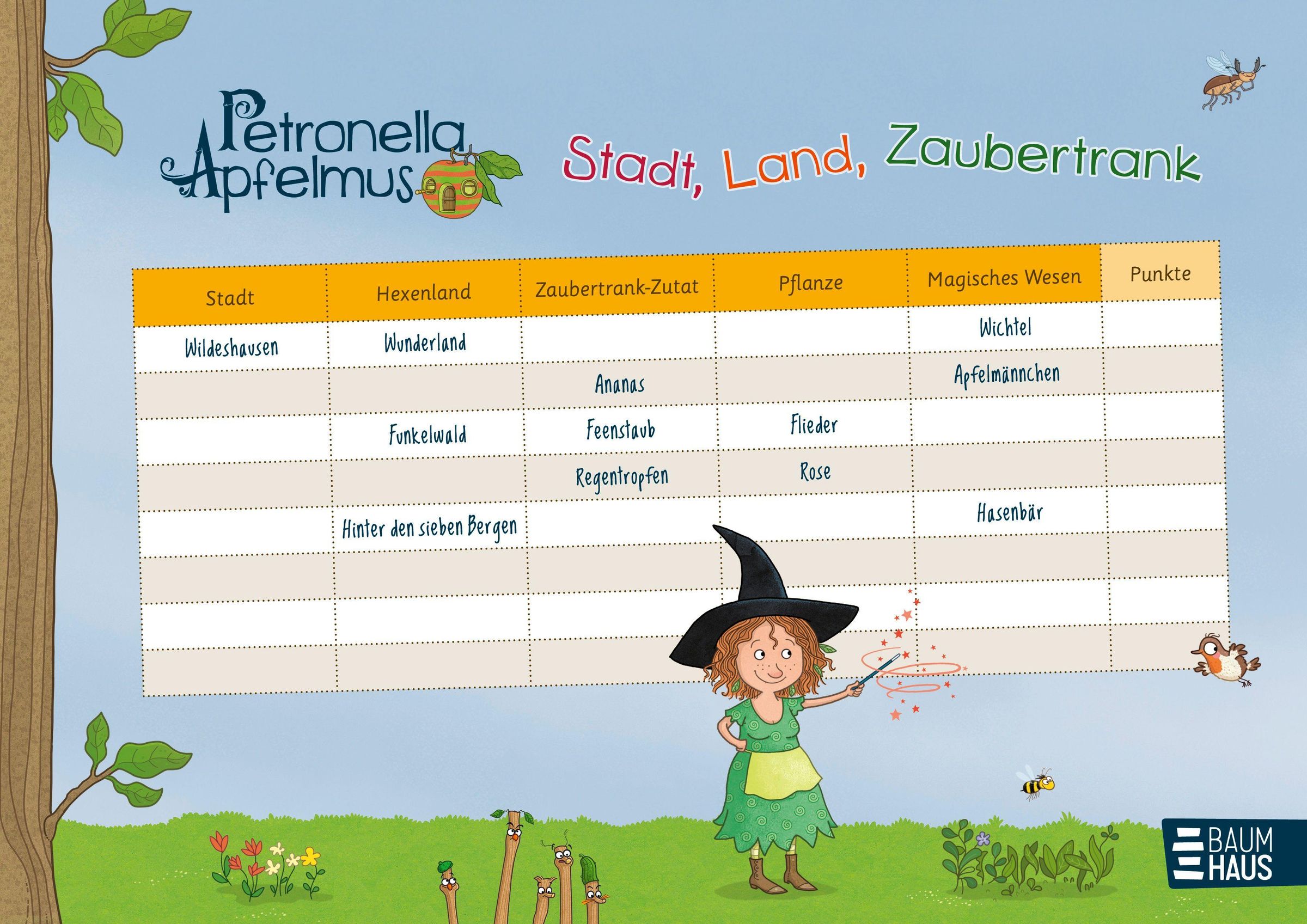 Das beliebte Wortsuchspiel "Stadt, Land, Fluss" gibt's jetzt endlich auch mit der kleinen Apfelhexe! Doch Vorsicht: Bei Petronella dreht sich nicht alles nur um "klassische" Begriffe - hier geht es auch mal um kreative Zauberzutaten, lustige Hexensprüche oder magische Reiseziele. Mit 50 doppelseitig bedruckten Seiten kann man zu zweit, aber auch mit der ganzen Familie oder Freund: innen spielen. So kommt weder auf Reisen noch zu Hause Langeweile auf, und gleichzeitig werden spielerisch Wissen, Sprache und Schreiben geschult.