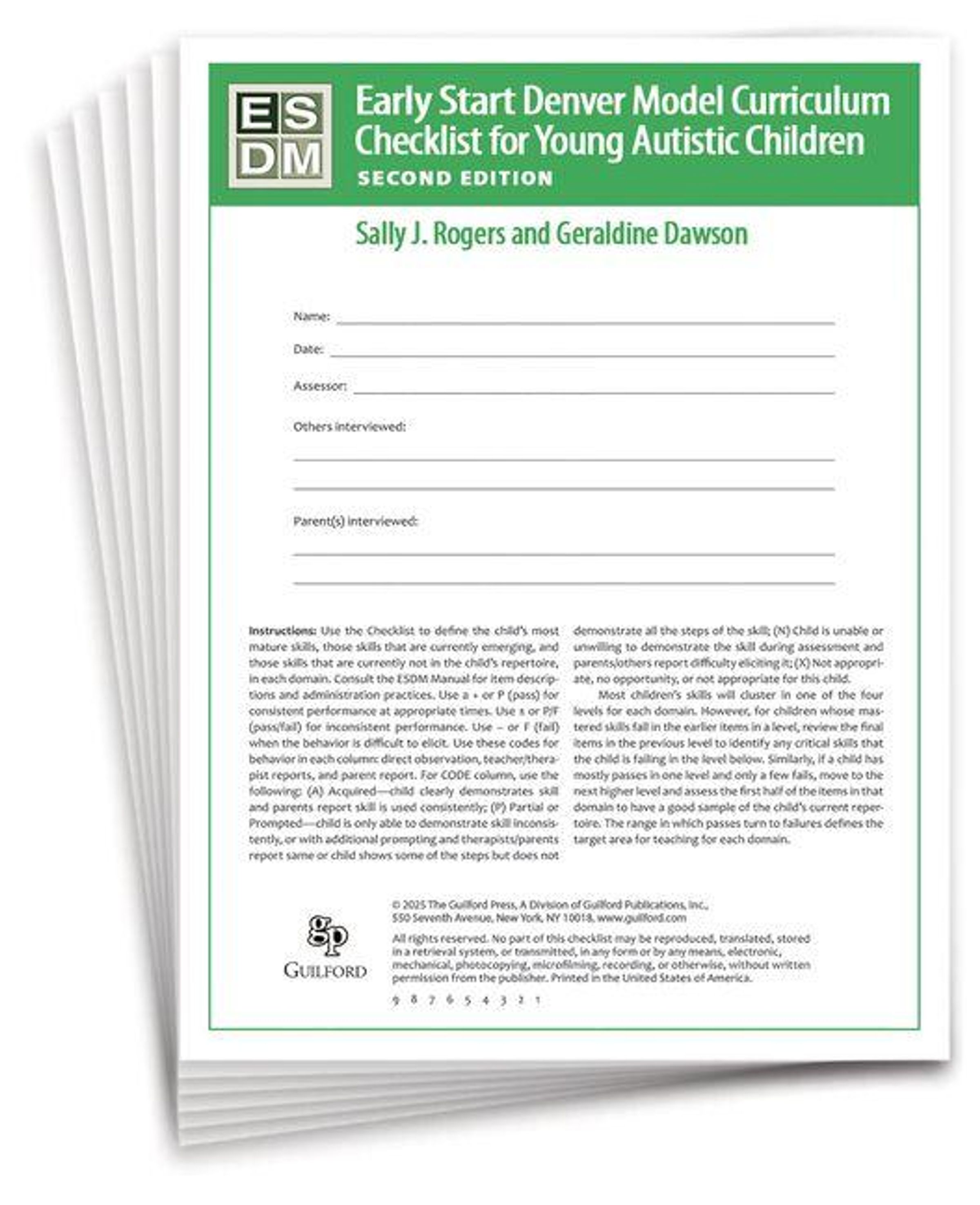 The Early Start Denver Model Curriculum Checklist for Infants and Young Autistic Children, Second Edition, is used to comprehensively assess children's skills across multiple developmental domains and to establish individualized teaching objectives and plans. The second edition includes new items appropriate for infants as young as 6 months of age. Checklist item descriptions and an overview of administration practices are provided at the companion website. Administered every 12 weeks, the Checklist is an essential component of the intervention described in the authoritative manual, Early Start Denver Model for Young Autistic Children, Second Edition. Sold as a set of 15 Checklists, each a 16-page two-color booklet.