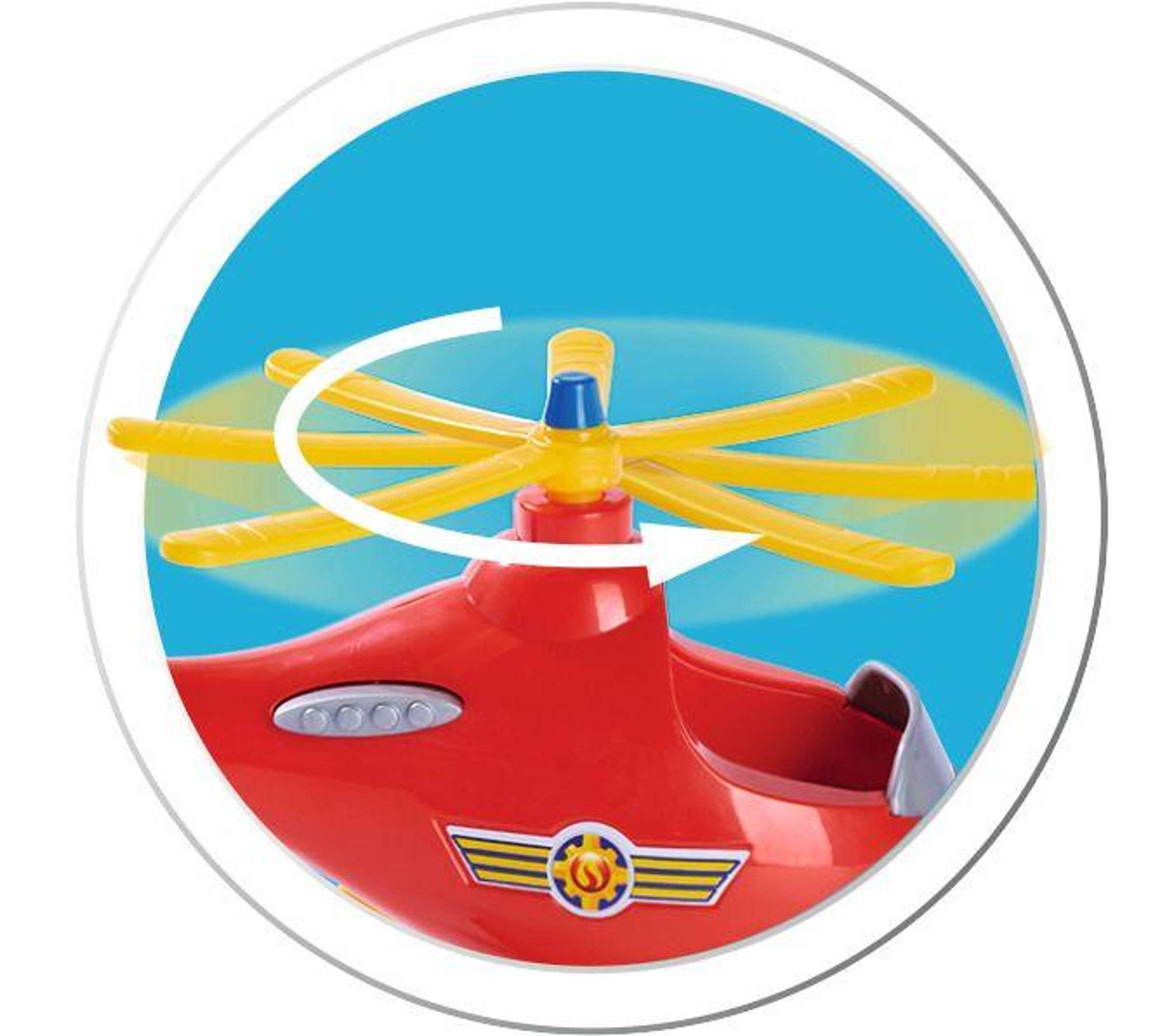 Ein roter Spielzeughubschrauber mit gelben Rotorblättern und einem lächelnden Piloten im Cockpit., Diverse