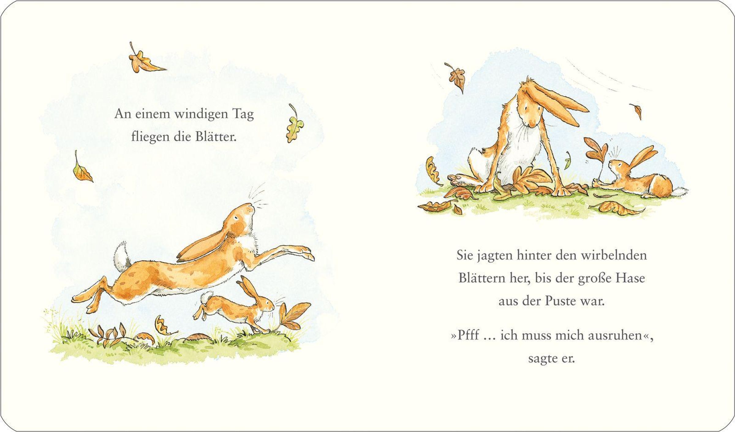 Der kleine und der große Hase aus dem Bilderbuchklassiker "Weißt du eigentlich, wie lieb ich dich hab?" hüpfen durch den herbstlichen Wald. Die bunten Blätter wirbeln durch den Wind. Vergnügt laufen sie mit dem raschelnden Laub um die Wette und spielen Fangen, bis sie aus der Puste sind. Wer landet wohl direkt in den Armen des großen Hasen?