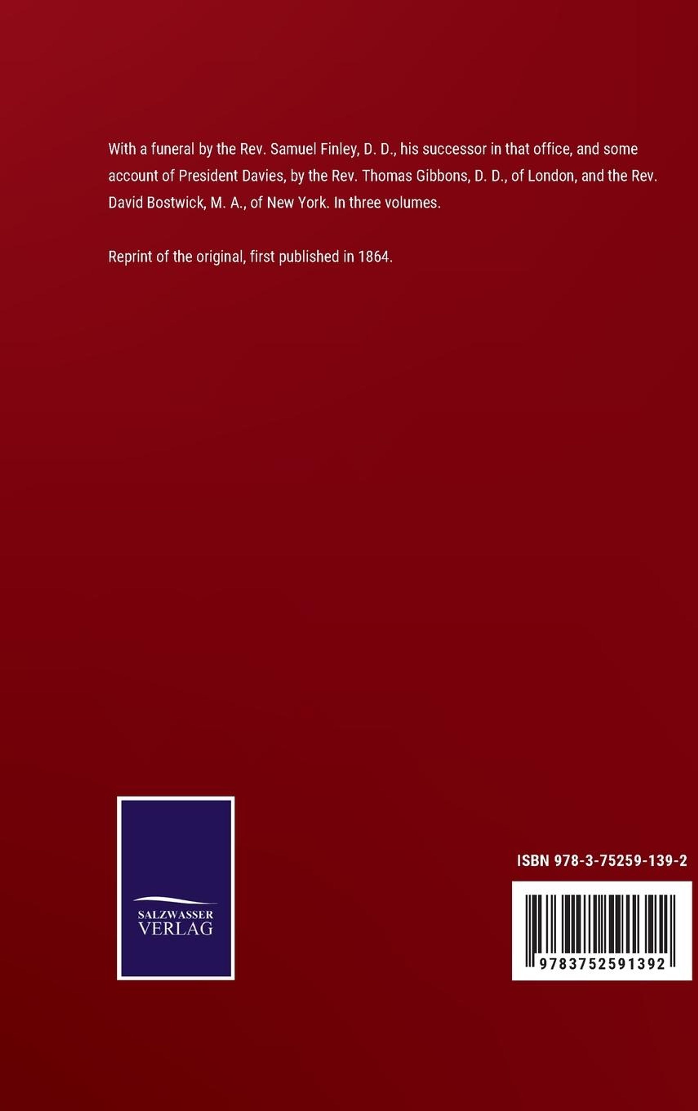 Reprint of the original, first published in 1864. With a funeral by the Rev. Samuel Finley, D. D., his successor in that office, and some account of President Davies, by the Rev. Thomas Gibbons, D. D., of London, and the Rev. David Bostwick, M. A., of New York. In three volumes.