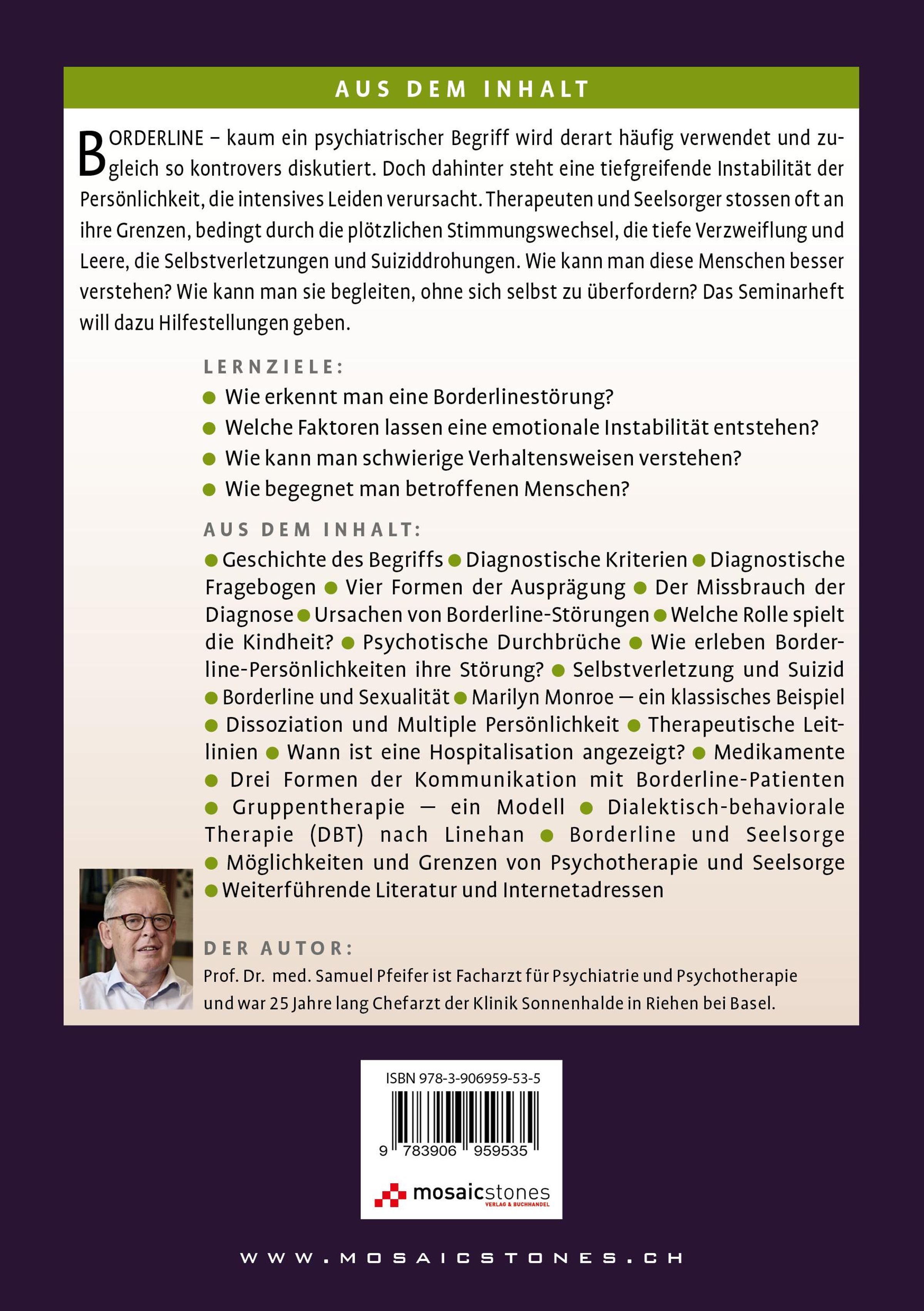 Samuel Pfeifer , Dr. med., geboren 1952, Facharzt für Psychiatrie und Psychotherapie, war 25 Jahre lang Chefarzt der Klinik für Psychiatrie und Psychotherapie Sonnenhalde in Riehen bei Basel/Schweiz, wo er jetzt als Leitender Arzt den Kompetenzschwerpunkt Psychiatrie, Spiritualität und Ethik leitet. Studium der Medizin in Zürich sowie Studien in Psychologie und Theologie in Kalifornien. Klinische Ausbildung an verschiedenen psychiatrischen Krankenhäusern in der Schweiz sowie ein Jahr in einem Krankenhaus in Nazareth/Israel. Zahlreiche Veröffentlichungen im Bereich von Seelsorge, Klinischer Psychiatrie und Psychotherapie. Mitglied im Editorial Board der Fachzeitschrift Mental Health, Religion and Culture.Anmerkungen: