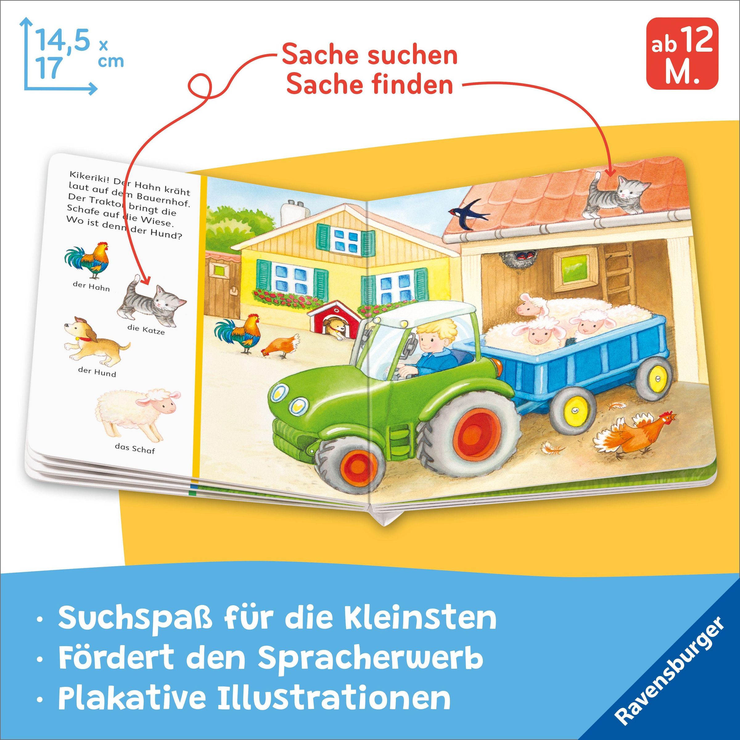 „Mein erstes SACHEN SUCHEN Bauernhof.“ Ein Junge streichelt eine Katze vor einem grünen Traktor, im Hintergrund Schafe., Buch