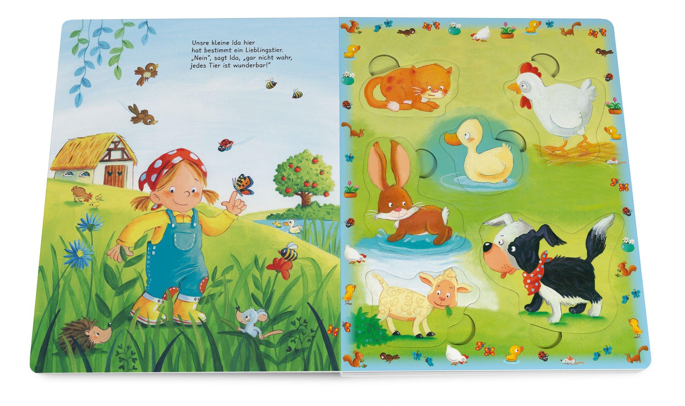Ida freut sich, bei ihr auf dem Bauernhof ist immer etwas los! Sie gießt ihre Blumen, tollt mit ihrem Hund Prinz durch den Garten, besucht die Hühner, die Häschen und Katze Maunz - und dann macht sie auch noch ein tolles Picknick! Ein lustiger Vorlese- und Spielspaß mit großen Puzzleteilen zum Immer-Wieder- Einsetzen.
