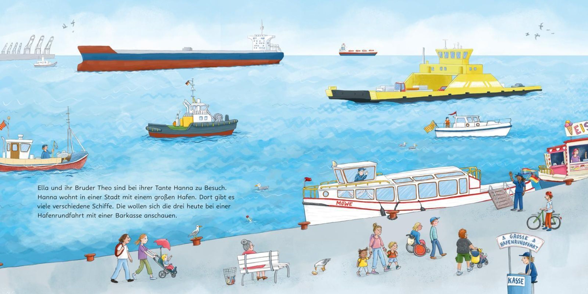 Ahoi und Leinen los! Ella, Theo und ihre Tante Hanna machen einen Ausflug in den Hafen. Dort gibt es viele verschiedene Schiffe zu sehen, vom kleinen Segelboot bis zum großen Containerschiff. Komm mit auf große Hafenrundfahrt! Ein neues Lieblingsbuch für Technikfans.