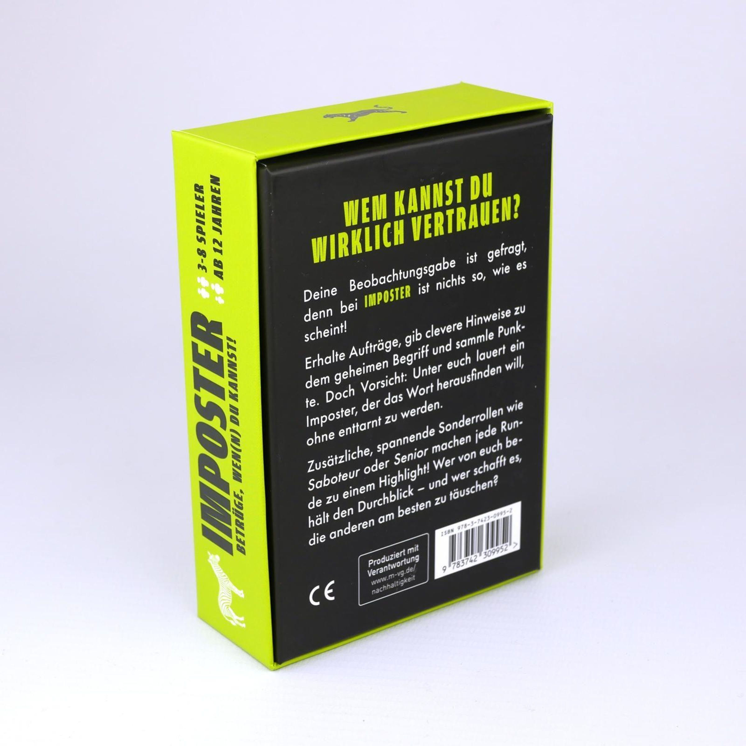 Zusätzliche, spannende Sonderrollen wie der Saboteur oder der Altersschwache machen das Täuschen und Bluffen noch witziger und erschweren das Entlarven des Imposters . Mit über 200 abwechslungsreichen Begriffen und interessanten Rollen trifft das Trendspiel auf das beliebte Prinzip von Werwolf und macht jeden Spieleabend unvergesslich!