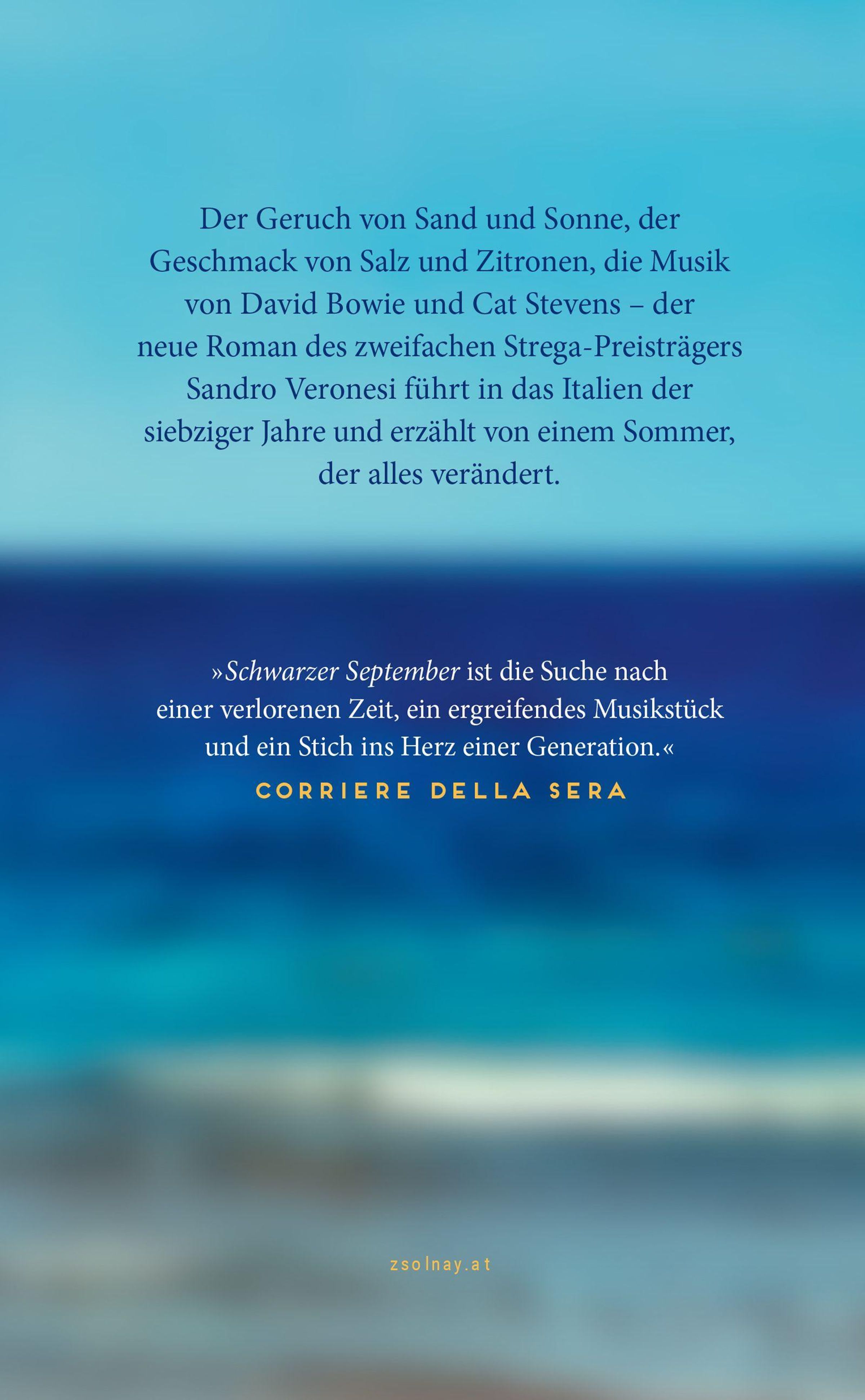 „Sandro Veronesi – Schwarzer September – Zsolnay – Roman.“ Drei Kinder liegen entspannt an einem sonnigen Strand nahe dem Meer., Buch