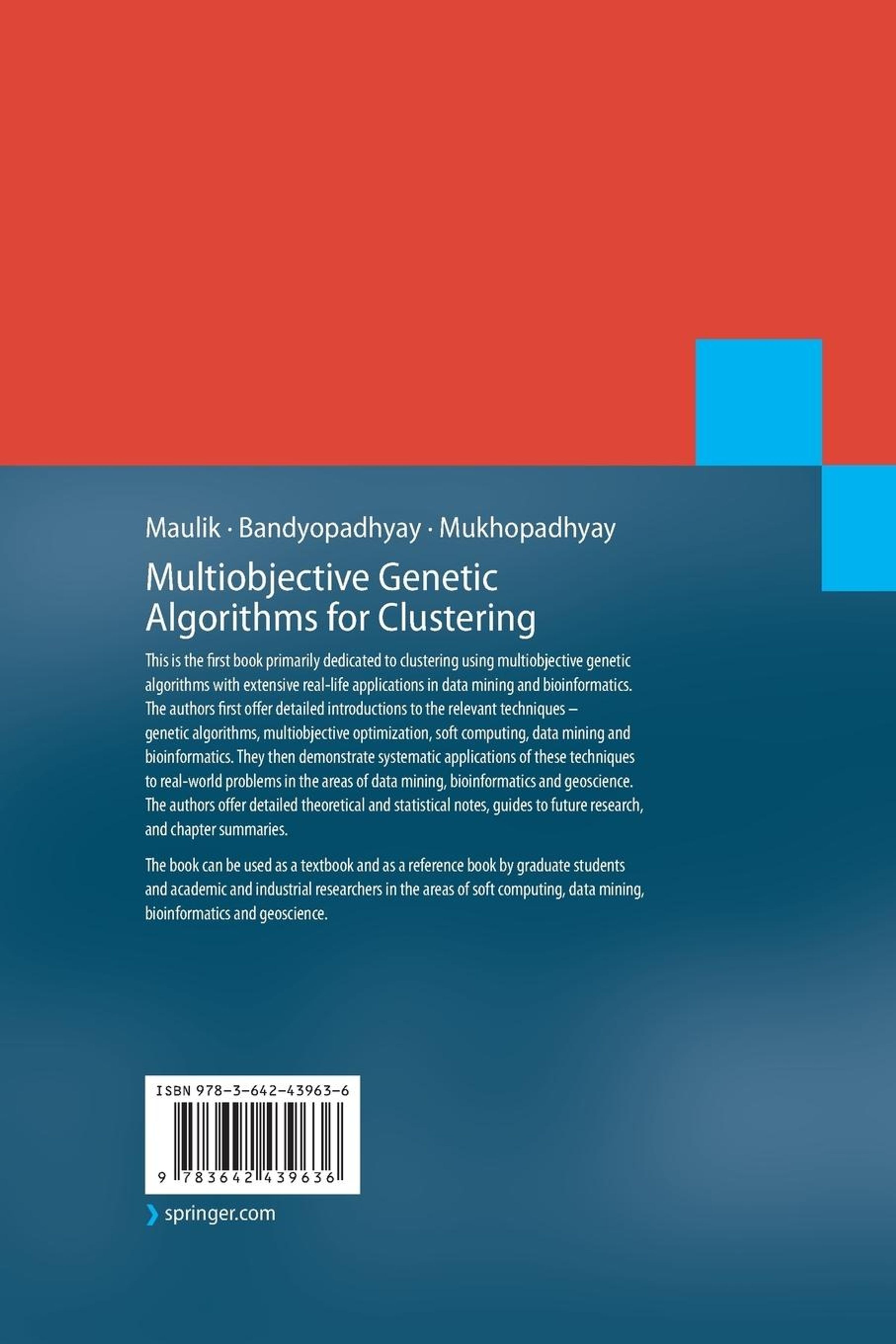 This is the first book primarily dedicated to clustering using multiobjective genetic algorithms with extensive real-life applications in data mining and bioinformatics. The authors first offer detailed introductions to the relevant techniques genetic algorithms, multiobjective optimization, soft computing, data mining and bioinformatics. They then demonstrate systematic applications of these techniques to real-world problems in the areas of data mining, bioinformatics and geoscience. The authors offer detailed theoretical and statistical notes, guides to future research, and chapter summaries.
