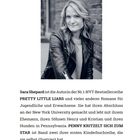 Sara Shepard hat an der New York University studiert und am Brooklyn College ihren Magisterabschluss in Creative Writing gemacht. Momentan lebt sie mit ihrem Mann in Tucson, Arizona. Sara Shepard wuchs in den Vororten Philadelphias auf; ihre Zeit dort hat die Pretty Little Liars -Serie inspiriert.Anmerkungen: