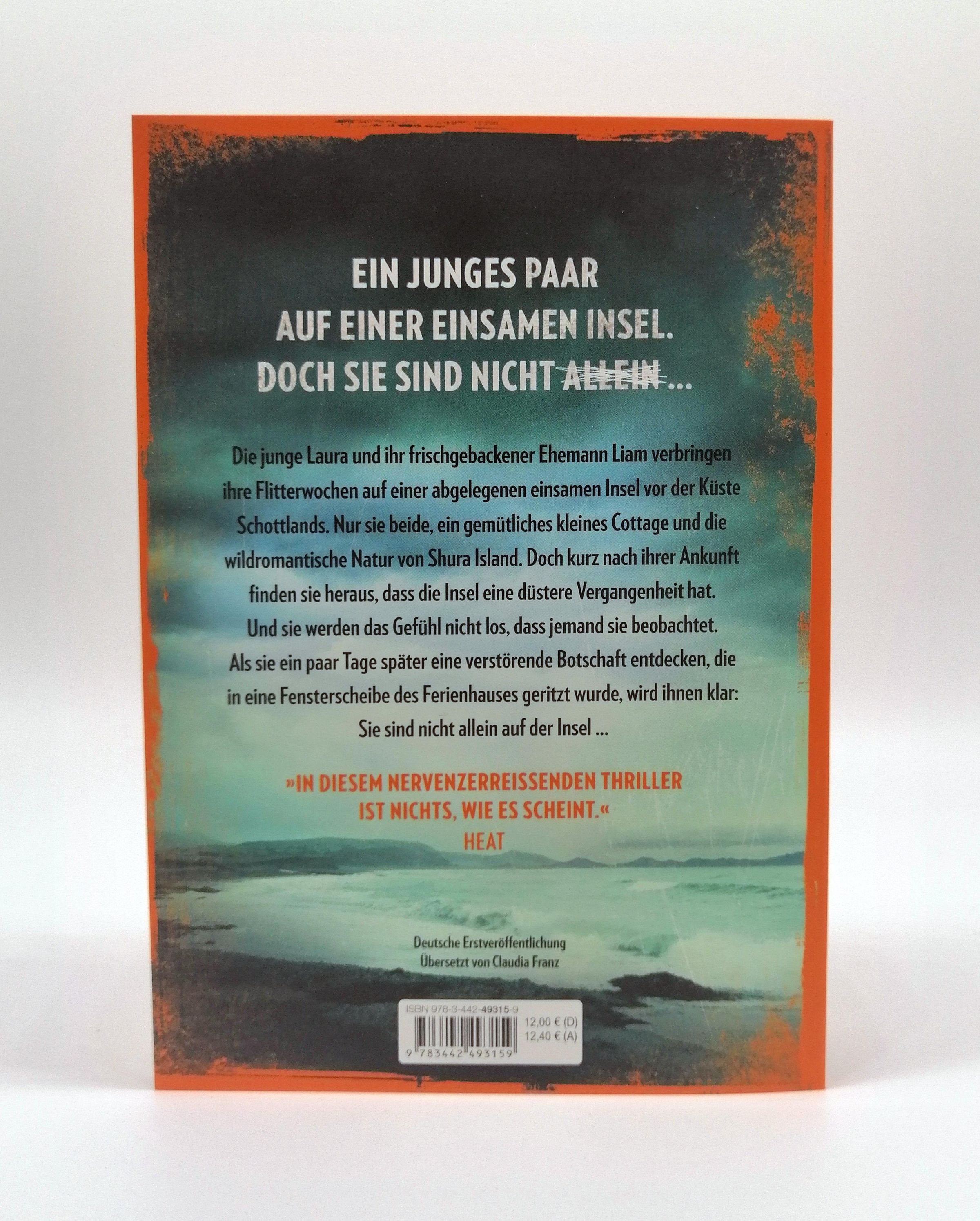 Die junge Laura und ihr frisch gebackener Ehemann Liam verbringen ihre Flitterwochen auf einer abgelegenen einsamen Insel vor der Küste Schottlands. Nur sie beide, ein gemütliches kleines Cottage und die wildromantische Natur von Shura Island. Doch kurz nach ihrer Ankunft finden sie heraus, dass die Insel eine düstere Vergangenheit hat. Und sie werden das Gefühl nicht los, dass jemand sie auf Schritt und Tritt beobachtet. Als sie ein paar Tage später eine verstörende Botschaft entdecken, die in eine Fensterscheibe des Ferienhauses geritzt wurde, ist klar: Sie sind nicht allein auf der Insel ...