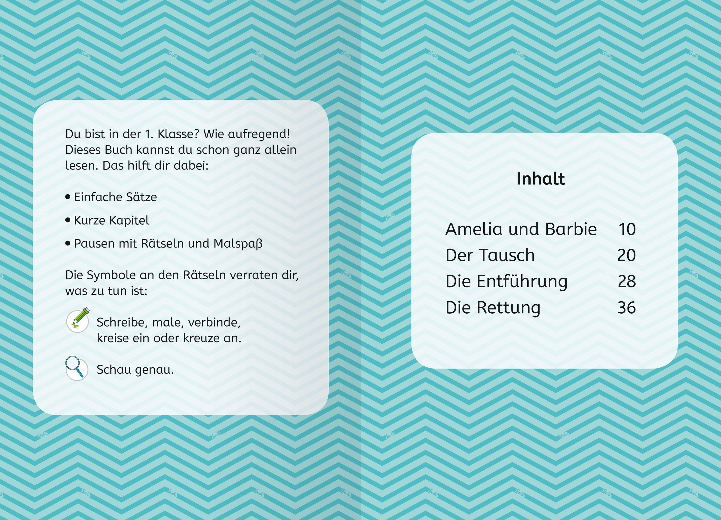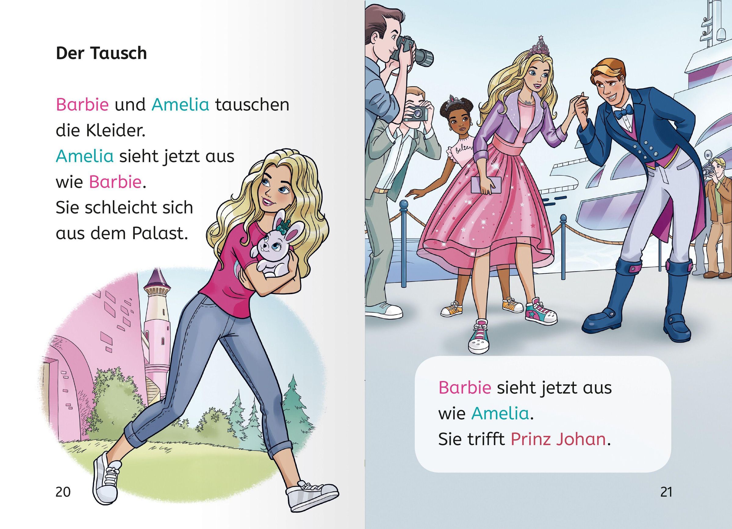 Barbie und ihre Freundinnen werden in ein echtes Schloss eingeladen. Dort treffen sie auf Prinzessin Amelia, die genauso aussieht wie Barbie. Diese möchte für eine Woche die Rollen tauschen und unerkannt die Gegend erkunden, bevor sie Königin wird. Doch dann wird sie entführt. Kann Barbie sie retten? Ein Erstlesebuch über Barbies spannende Abenteuer als Prinzessin.