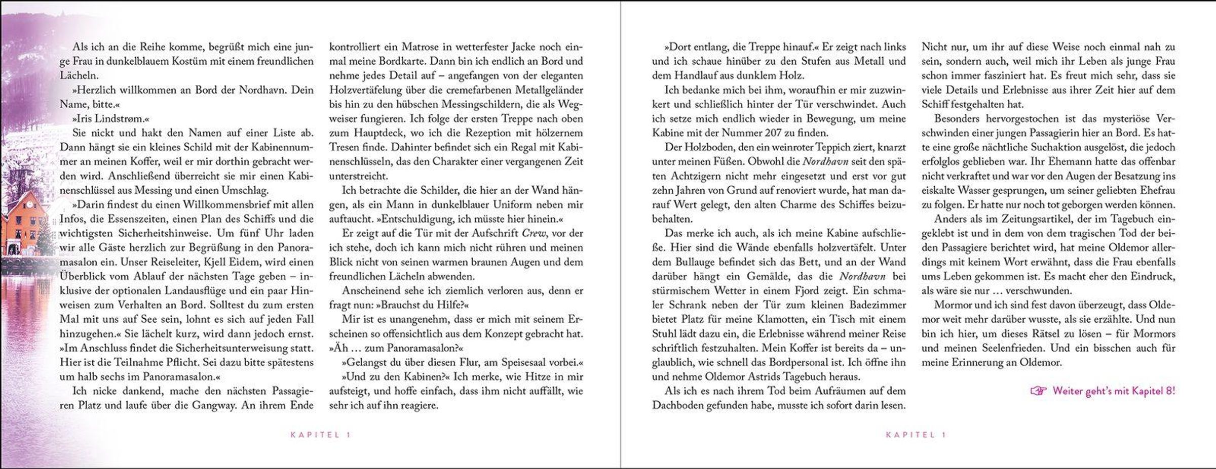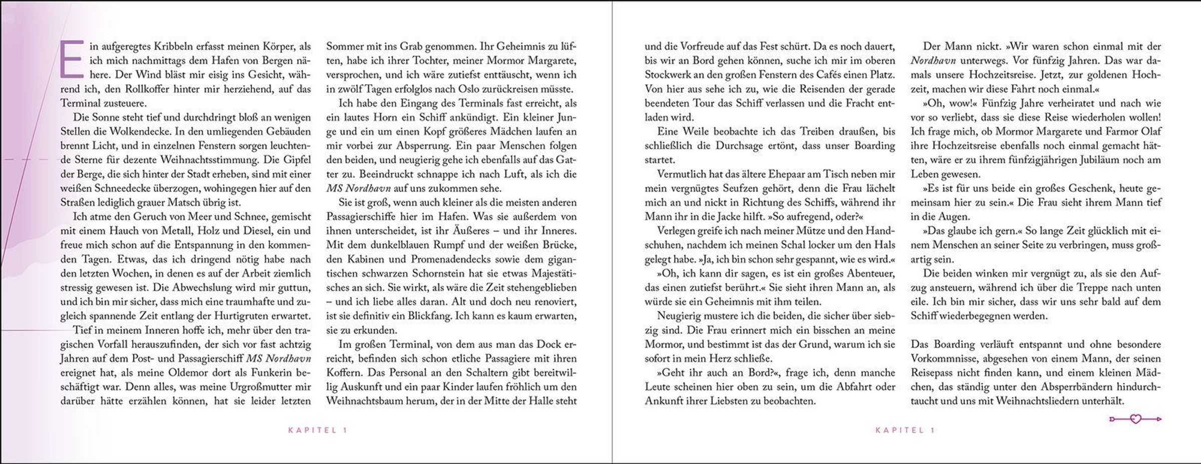 Als Iris an Bord des historischen Passagierschiffs MS Nordhavn geht, möchte sie nicht nur eine unvergessliche Zeit auf ihrer Fahrt entlang der winterlichen norwegischen Küste verbringen. Sie hat auch ein Ziel: das Geheimnis ihrer Urgroßmutter zu lüften, die einst Funkerin auf der Nordhavnwar. Doch kaum hat die Reise begonnen, erwarten sie nicht nur die traumhafte Szenerie von Norwegens Fjorden und ein außergewöhnliches Schiff, dessen Mysterien sie erkundet. Bald spürt Iris auch ein Flattern im Bauch dank des charmanten Bordpianisten Elias.